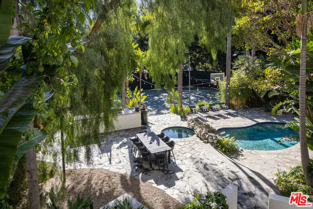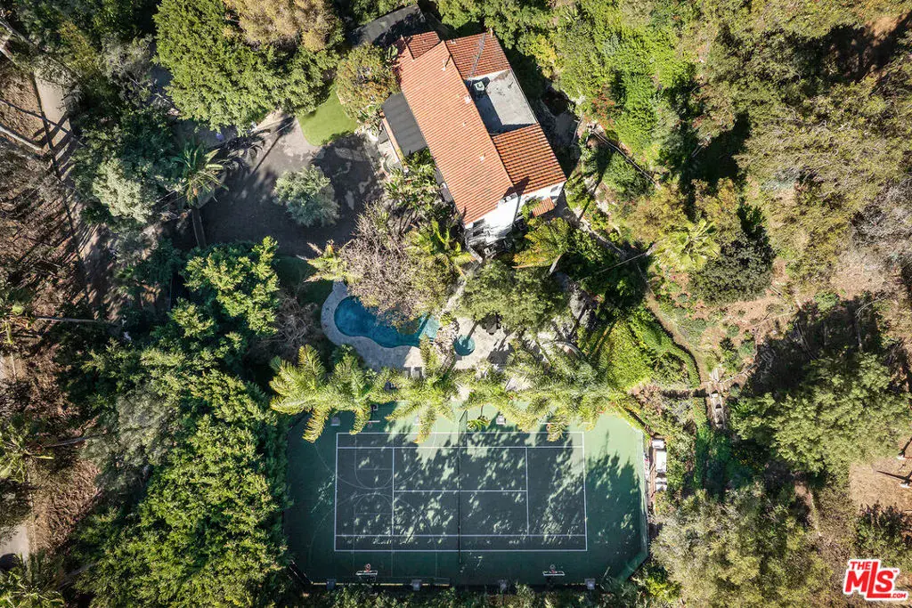 Set on a sprawling lot, this secluded Spanish Revival estate captures the allure of Old Hollywood with its harmonious blend of classic architecture and refined, warm living spaces. Tucked far back from the street behind a gated entry for complete privacy, the residence features a spacious motor court anchored by a majestic olive tree, offering a stately welcome to this remarkable sanctuary. Inside, a double-height entry foyer leads to a formal living room with a vintage fireplace and French doors that flood the space with natural light while seamlessly connecting to the lush outdoors. The estate’s architectural details include tall, arched windows, intricate stained glass accents, and wrought iron embellishments, complemented by rich terra cotta elements and warm, dark woods. A chef-caliber kitchen flows effortlessly into a formal dining area, where French doors open to one of the home’s many garden patios. Adjacent to the dining area is a timeless bar and game room, complete with a pool table, that extends to a private outdoor lounge and a covered dining areaideal for hosting and entertaining. The primary suite is a serene retreat, featuring vaulted ceilings, a cozy sitting area with a fireplace, and expansive windows framing picturesque views. Its spa-like ensuite bathroom is appointed with a dual vanity, rainfall shower, and indulgent soaking tub. Generously sized guest bedrooms provide comfort and privacy for family or visitors. Outdoors, the property transforms into a recreational haven. A full tennis and basketball court, sparkling pool, and jacuzzi are surrounded by lush tropical greenery, while a barrel sauna and cold plunge deliver the ultimate in relaxation. The outdoor kitchen and barbecue area, along with multiple alfresco and covered dining spaces, create endless opportunities for entertaining and embody true California luxury living. A hillside deck, perfect for stargazing, completes the exceptional backyard experience. Situated in a prime location in the Hollywood Hills, this residence offers easy access to the vibrant Sunset Strip while maintaining an air of tranquility. A masterpiece of privacy, elegance, and modern convenience, this property is a rare find, seamlessly blending the timeless charm of Spanish and Mediterranean architecture reminiscent of Old Hollywood with all the amenities of contemporary living