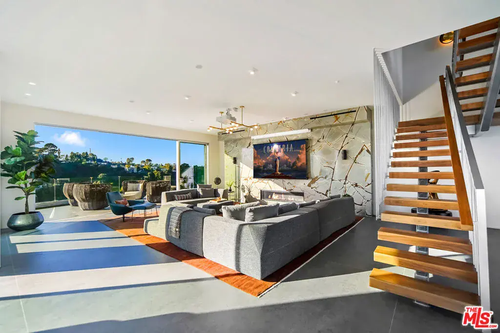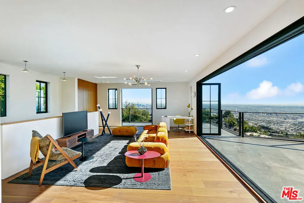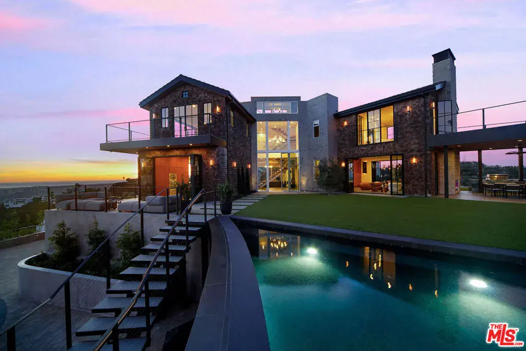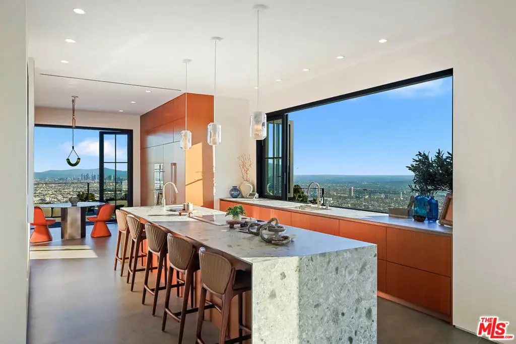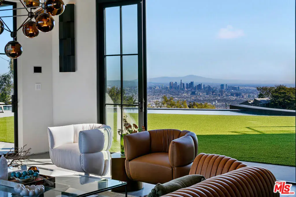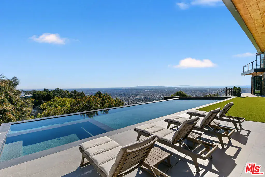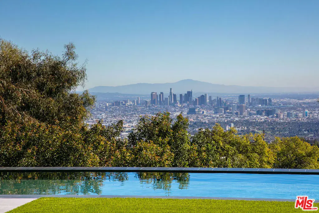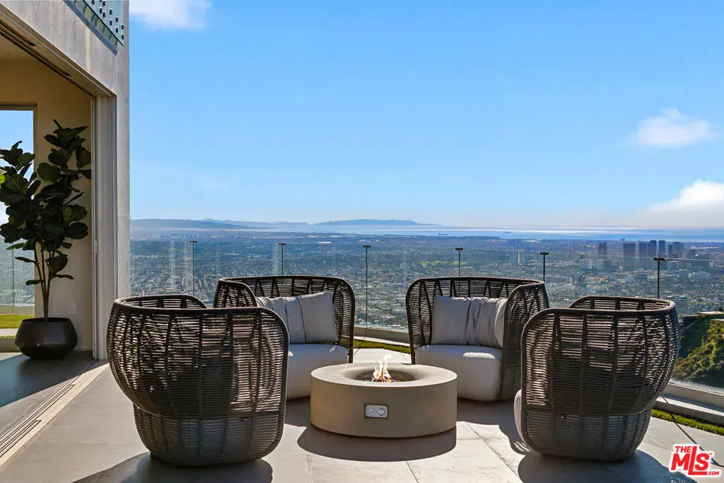 Welcome to The Apex. Perched above the city, this truly one of a kind estate is a statement of vision and refined luxury. Furnished and designed to impress at every turn, the approximately 7,500 square foot compound commands sweeping, unobstructed 360 degree views of the city lights, ocean horizon, and serene canyon vistas creating a constant connection to the landscape and a setting that feels cinematic, private and endlessly inspiring.The main residence features four bedrooms and five baths, where architecture and artistry converge. Custom finishes, museum quality lighting and a thoughtfully curated collection of designer furnishings create interiors that feel elevated, confident and effortlessly livable. Multiple fireplaces anchor the living and outdoor spaces, while expansive walls of glass dissolve the boundary between indoors and out. The living room seamlessly converts into an intimate cinematic experience with a concealed drop down theater, while an elegant yet sultry den opens directly to the outdoors, creating a natural flow for entertaining and everyday living. The primary suite with fireplace and balcony is a true sanctuary highlighted by an all-glass bathroom suite bathed in natural light. The shower is like a fine painting come to life, immersive and sculptural, surrounded by sky, horizon and shifting light. Each additional ensuite bedroom is generously proportioned, offering privacy, impeccable design and endless views.A separate guest house enhances the estate’s versatility and appeal. Designed across two levels, each with its own kitchen and bath, it is currently configured as a gym and lounge, yet can easily serve as additional bedrooms. Ideal for extended guests, multigenerational living, staff accommodations or private entertaining, it maintains complete independence from the main residence.The outdoor experience rivals that of a world class resort, including waterfall entry leading to a rare flat grassy yard, an exceptional find in the hills, especially when paired with panoramic views and privacy. Beyond the lawn, the property unfolds into multiple outdoor living environments including a striking pool and spa, cold plunge, outdoor fireplace, fire pit, BBQ area, wraparound balconies and sexy roof top lounge with fireplace. Every space is designed to capture the scenery as it transitions beautifully from sunrise to glowing city lights at night. A private gated driveway with parking for up to 10 vehicles and garage with elevator to main level further underscores the rarity of this offering. Finding a hillside estate with this level of flat usable land, parking and unobstructed views is extraordinarily uncommon. This is not simply a home, but an architectural experience designed for a discerning luxury clientele seeking something iconic, bold and impossible to replicate.