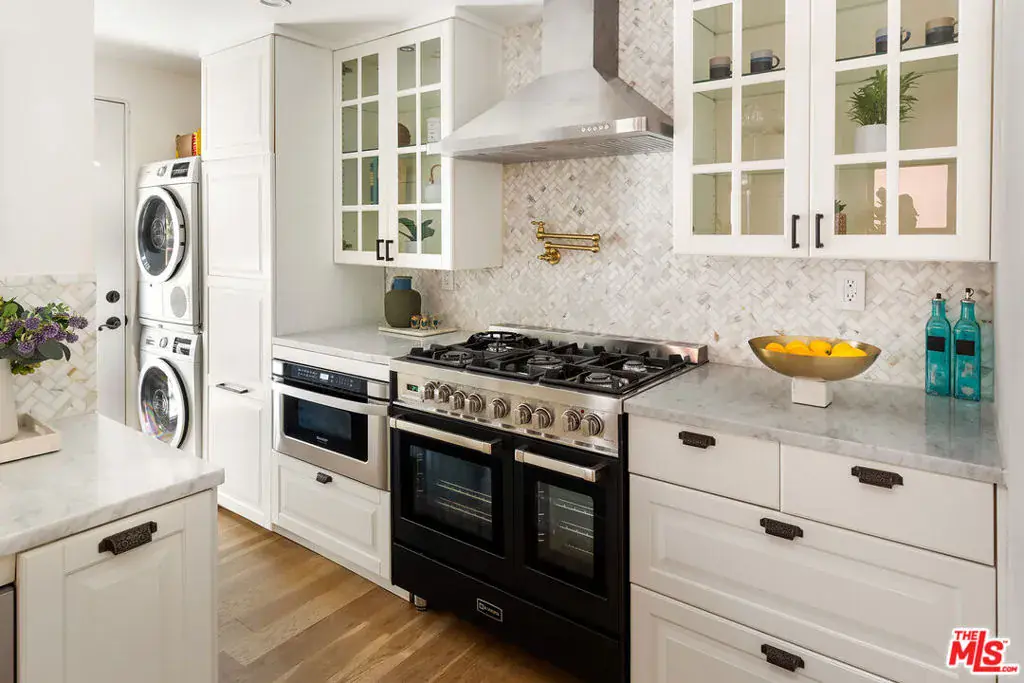 This home features a large bedroom. Two bedrooms were combined. The public records shows 2 bedrooms. Nestled off Lookout Mountain Avenue, this cottage offers a private sanctuary with breathtaking panoramic canyon views. Renovated to the studs in 2019, it boasts meticulous attention to detail and energy efficiency. From the fireproof French standing seam metal roof and fiber cement siding with extra protective dense glass underlayment, to the high-efficiency split AC and heat system, upgraded modern 200 AMP electrical, copper plumbing, and a whole-home water filtration system, this home is equipped with the latest technology. The kitchen is a chef’s dream, featuring carrera marble countertops, a Verona dual range, and a brass pot filler. The oversized double-paned Western and Milgard windows in the nearby living room flood the space with natural light, while a stylish marble gas fireplace adds ambiance. Conveniently tucked away in a corner is a Bosch washer and dryer, and a Rinnai tankless hot water heater provides efficient and limitless hot water. Step outside to a grassy area, perfect for stargazing, intimate conversations with friends, and soaking up the sun on the sundeck. After a long day, unwind in the new Jacuzzi spa before retiring to your Wonderland hideaway in the city.