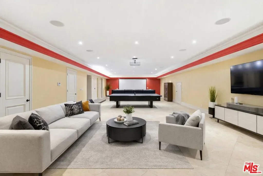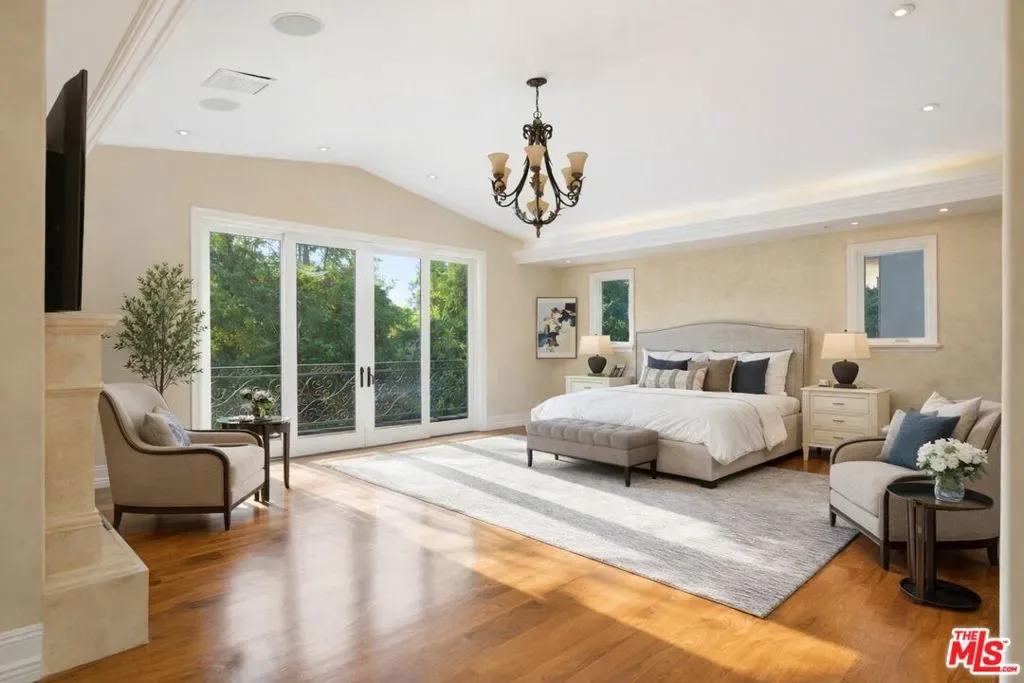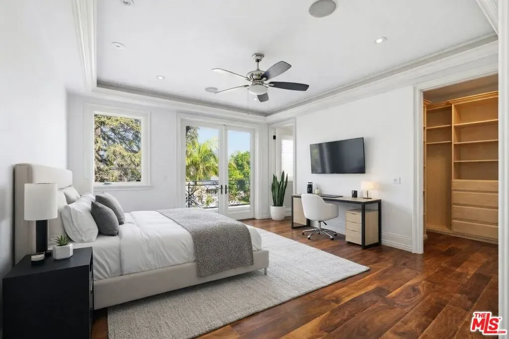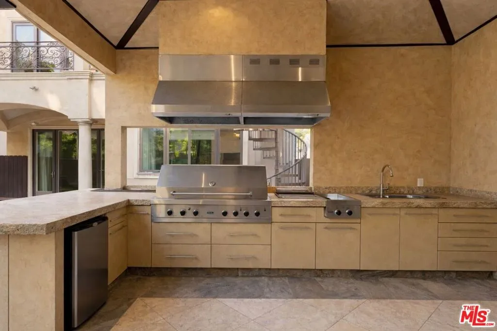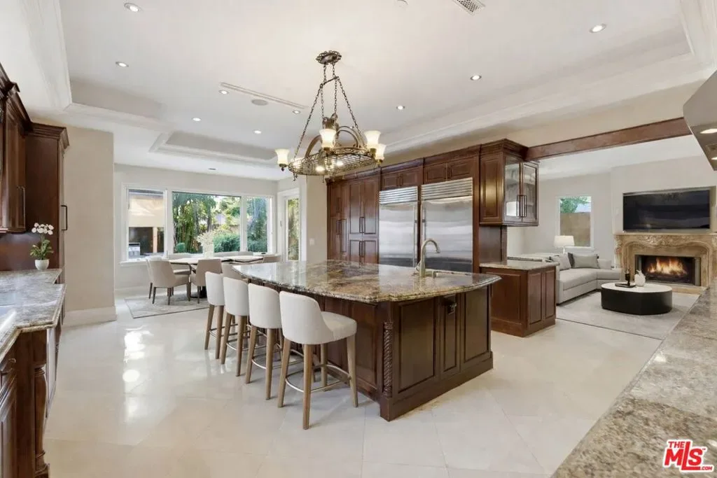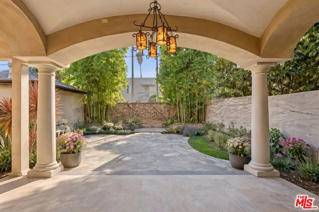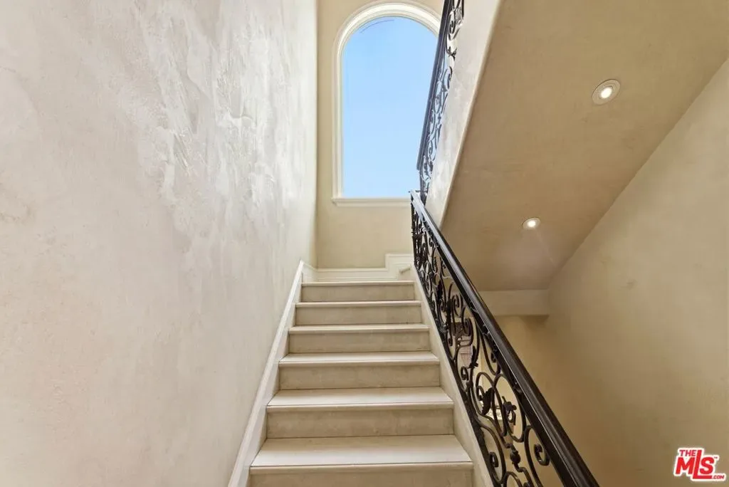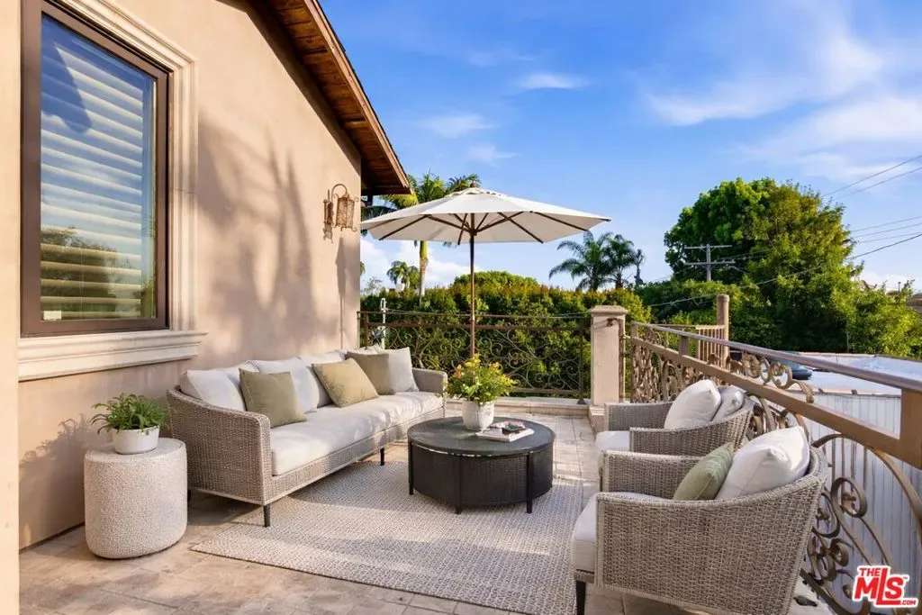 Beautiful Mediterranean custom home offering over 6,000 square feet with 6 bedrooms and 7.5 bathrooms, featuring a spacious open floor plan designed for both comfortable living and elegant entertaining. Ideally located mid-block with a gated front entry and auto-gated flagstone driveway and walkway.Enter through a grand living room that flows seamlessly into the formal dining room and a rear-facing family room with fireplace and French doors opening to a covered patio, tiled yard, and entertainer’s outdoor kitchen complete with BBQ and bar area.The oversized chef’s kitchen features a large center island, dual sinks, and top-of-the-line stainless steel appliances including a Wolf range with double ovens, wine refrigerator, built-in oversized refrigerator/freezer, and a butler’s pantry with warming drawer and microwave. A bright breakfast area overlooks the backyard with direct patio access.A sun-filled staircase leads to the second level where four spacious bedrooms each feature updated marble and tile ensuite bathrooms. Front-facing bedrooms offer balconies with Century City views.The luxurious primary suite includes a fireplace, French doors opening to a private balcony with treetop and sunset views, and a large custom walk-in closet with center island and built-in dressers. The spa-inspired primary bathroom features dual vanities, a soaking tub, and steam shower.The lower level offers a large open game room/den with projector theater, two additional ensuite bedrooms, and a powder room. Additional features include marble and hardwood flooring, Venetian plaster walls, built-in sound system, four-zone HVAC, solar panels, alarm system, and a second-floor laundry room with ample storage. Beautifully maintained and ideally located near Westfield Century City Mall, UCLA, Westwood Village, and Beverly Hills. Convenient amenities near Ralphs, Gelson’s, Equinox Sports Club, and Eataly. Located within the Westwood Charter School district. Easy access to 405 and 10 Freeway. *Photos are virtually staged. *Home can be delivered furnished with custom traditional furniture*