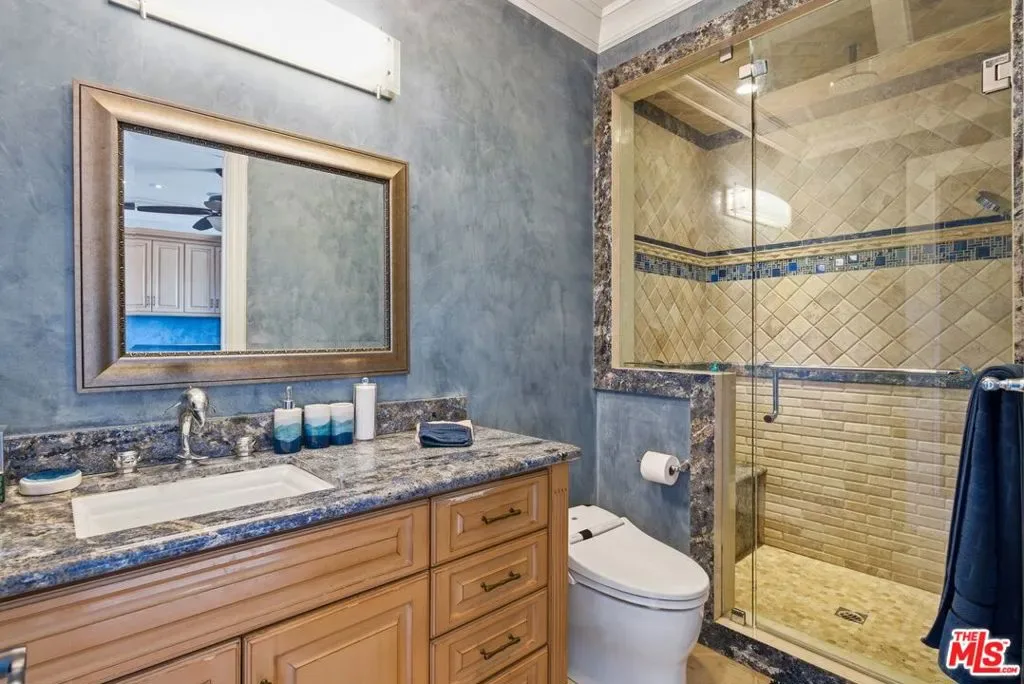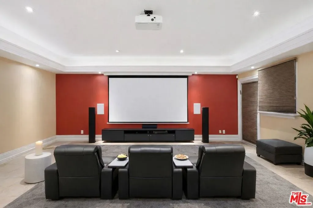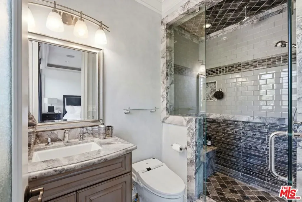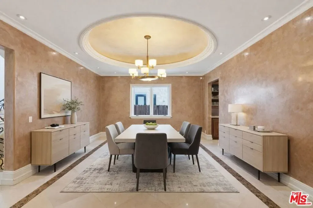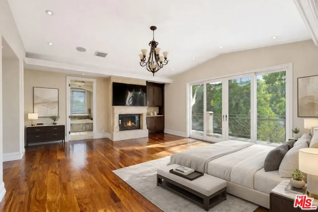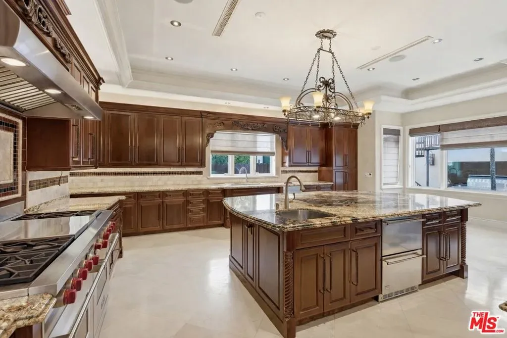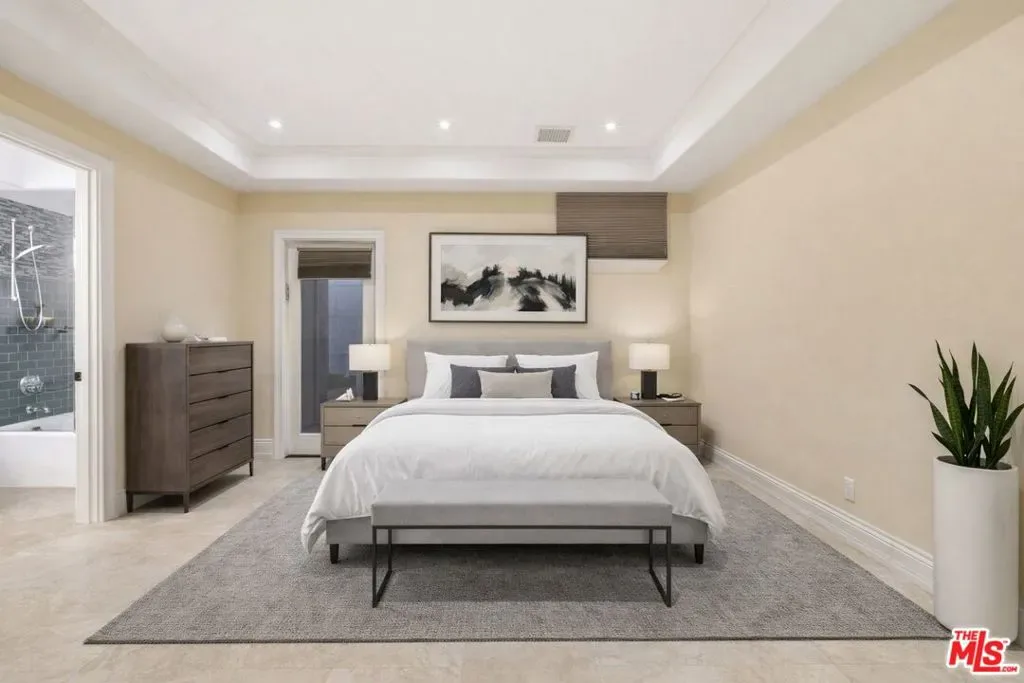 Beautiful Mediterranean custom home offering over 6,000 square feet with 6 bedrooms and 7.5 bathrooms, featuring a spacious open floor plan designed for both comfortable living and elegant entertaining. Ideally located mid-block with a gated front entry and auto-gated flagstone driveway and walkway.Enter through a grand living room that flows seamlessly into the formal dining room and a rear-facing family room with fireplace and French doors opening to a covered patio, tiled yard, and entertainer’s outdoor kitchen complete with BBQ and bar area.The oversized chef’s kitchen features a large center island, dual sinks, and top-of-the-line stainless steel appliances including a Wolf range with double ovens, wine refrigerator, built-in oversized refrigerator/freezer, and a butler’s pantry with warming drawer and microwave. A bright breakfast area overlooks the backyard with direct patio access.A sun-filled staircase leads to the second level where four spacious bedrooms each feature updated marble and tile ensuite bathrooms. Front-facing bedrooms offer balconies with Century City views.The luxurious primary suite includes a fireplace, French doors opening to a private balcony with treetop and sunset views, and a large custom walk-in closet with center island and built-in dressers. The spa-inspired primary bathroom features dual vanities, a soaking tub, and steam shower.The lower level offers a large open game room/den with projector theater, two additional ensuite bedrooms, and a powder room. Additional features include marble and hardwood flooring, Venetian plaster walls, built-in sound system, four-zone HVAC, solar panels, alarm system, and a second-floor laundry room with ample storage. Beautifully maintained and ideally located near Westfield Century City Mall, UCLA, Westwood Village, and Beverly Hills. Convenient amenities near Ralphs, Gelson’s, Equinox Sports Club, and Eataly. Located within the Westwood Charter School district. Easy access to 405 and 10 Freeway. *Photos are virtually staged. *Home can be delivered furnished with custom traditional furniture*