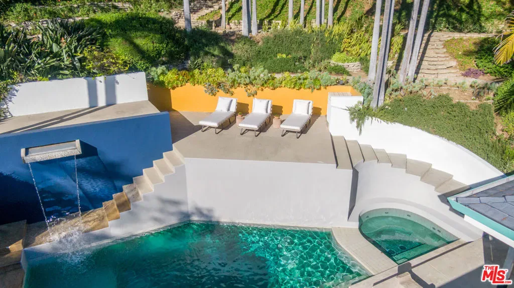 Offered for the first time in over 40 years, this thoughtfully restored home is set above the street and up a private drive in the coveted Outpost Estates, and provides exceptional privacy, design, and scale. Originally built in 1951 by Douglas McLellan & Associates and reimagined by architects Luis Ortega (1978) and Mark Enos (1986), the changes were inspired by Mexican architect Luis Barragan with warm, modern livability. The property has been featured in numerous fashion and editorial photos, including primary work by Herb Ritts, a reflection of its distinctive design and visual appeal. The main residence includes approximately 2,211 square feet with 2 bedrooms and 2 baths, featuring clean lines, preserved period details, thoughtful updates throughout, and a seamless indoor-outdoor flow. Natural light moves effortlessly through the interiors, opening to inviting outdoor spaces designed for both entertaining and retreat. Set on an expansive approximately 19,991 square foot lot, the grounds are anchored by terraced gardens, an architectural pool, connected spa, and a striking waterfall, along with thoughtfully composed outdoor areas that enhance the property’s indoor-outdoor lifestyle. A lower level of approximately 600 square feet is a flexible space, currently utilized as a home office with a three-quarter bath and a temperature-controlled wine cellar. It is well suited for a third bedroom or simply additional living space. This is a rare offering that balances architectural significance, extreme privacy, and modern lifestyle in one of the most desirable pockets of the Hollywood Hills.