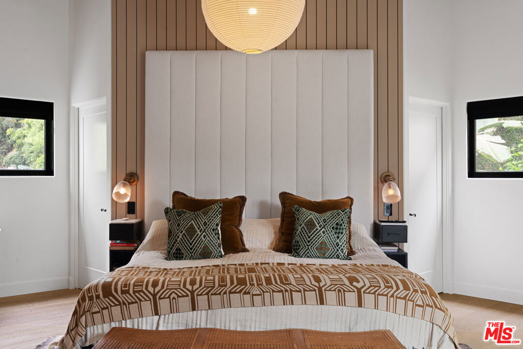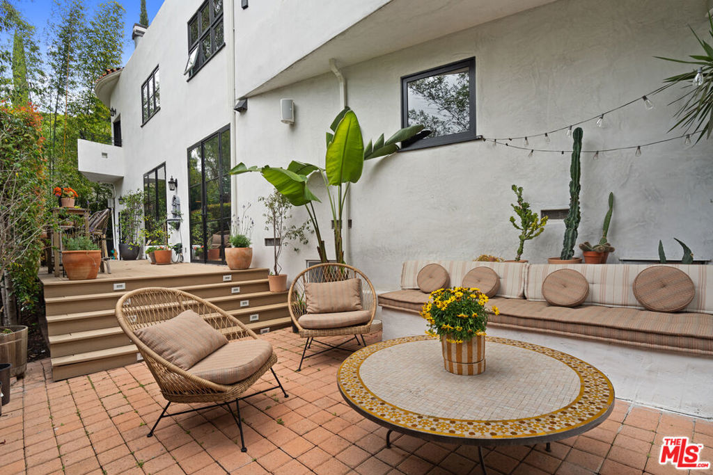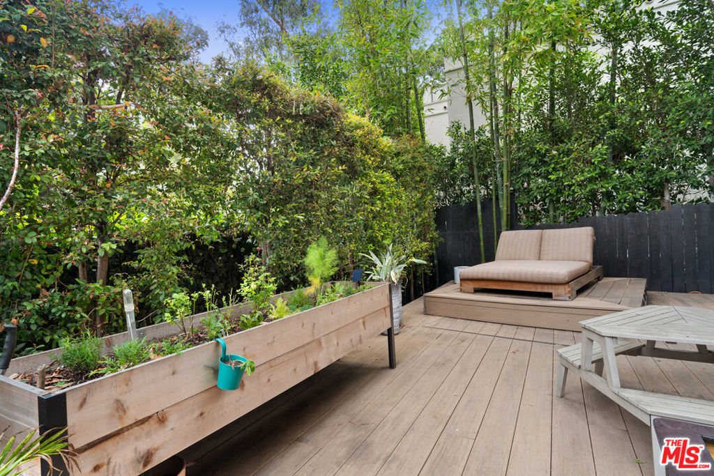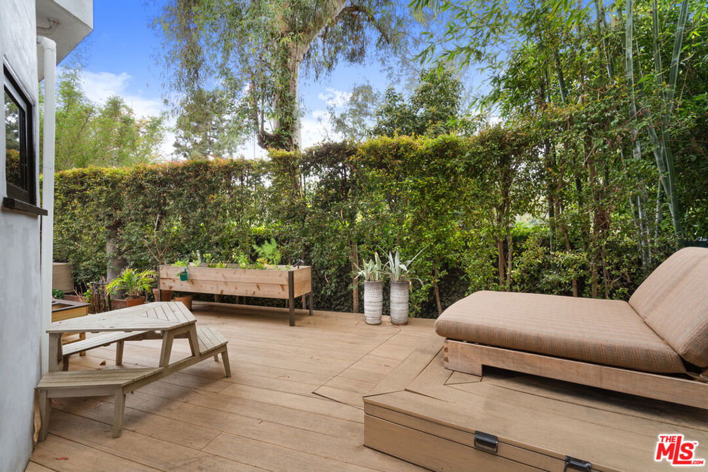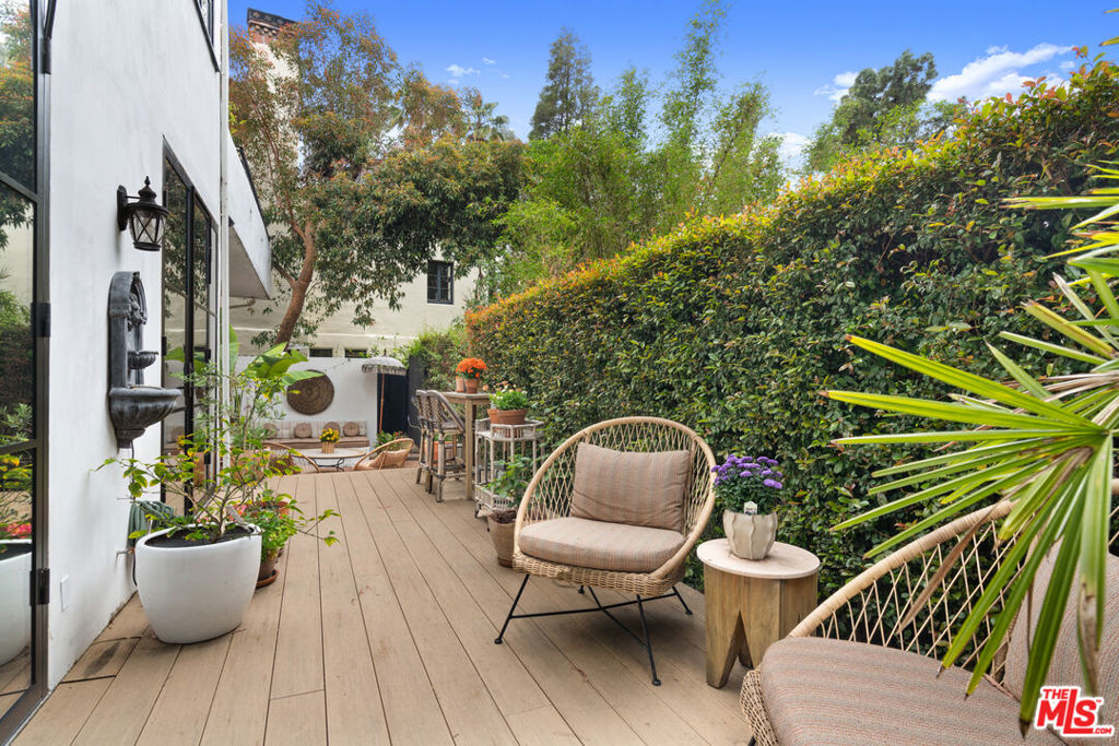 Stunning modern retreat nestled in the heart of Hollywood Hills with jacuzzi! Surrounded by lush greenery, this 3-bedroom, 3-bath residence offers treehouse-like privacy and curated sophistication across thoughtfully designed indoor and outdoor spaces. The grand primary suite is a true sanctuary, featuring vaulted ceilings with exposed wood beams, a sculptural pendant light, and ample space for both lounging and fitness. Black-framed windows and French doors lead to a private terrace overlooking the treetopsperfect for morning coffee or evening unwinding. The suite is complemented by a custom walk-in closet with extensive built-ins, and a spa-inspired bathroom with bold patterned tile, dual vanities, a soaking tub, and a glass-enclosed rain shower.A secondary suite offers a curved architectural wall, built-in desk, and access to a full bathroom with subway tile and matte black fixturesideal for guests, a home office, or a cozy den. Transitioning through the home, a bright hallway with picture-frame cutouts adds visual intrigue and leads to the heart of the home, where pale oak floors and crisp white walls maintain a warm, modern aesthetic.The outdoor areas are a showstopper, offering multiple private vignettes for entertaining and relaxation. A sunken courtyard is wrapped with built-in bench seating and surrounded by potted tropicals and cacti, while a wraparound deck includes a dining bar, lounge seating, and a wall-mounted fountain, perfect for gatherings or quiet moments. A raised herb garden deck includes built-in planters and a daybed for enjoying slow afternoons.Every corner of this home is designed with intentcustom light fixtures, thoughtful architectural symmetry, and seamless indoor-outdoor flow create a harmonious living experience. From the balconies and outdoor escapes to the luxurious interior detailing, this home invites you to live immersed in style, nature, and comfort in one of LA’s most vibrant neighborhoods.