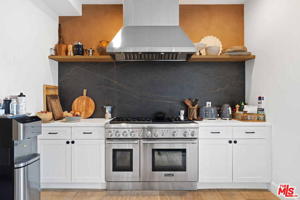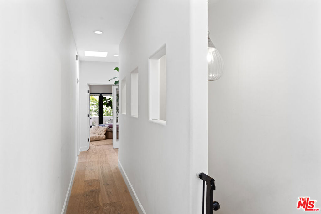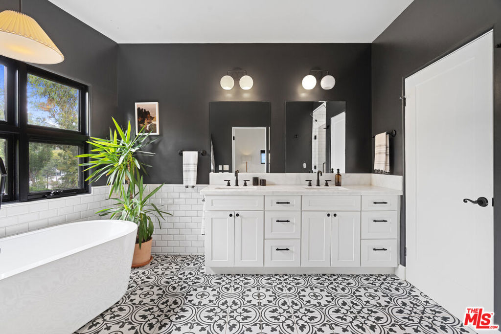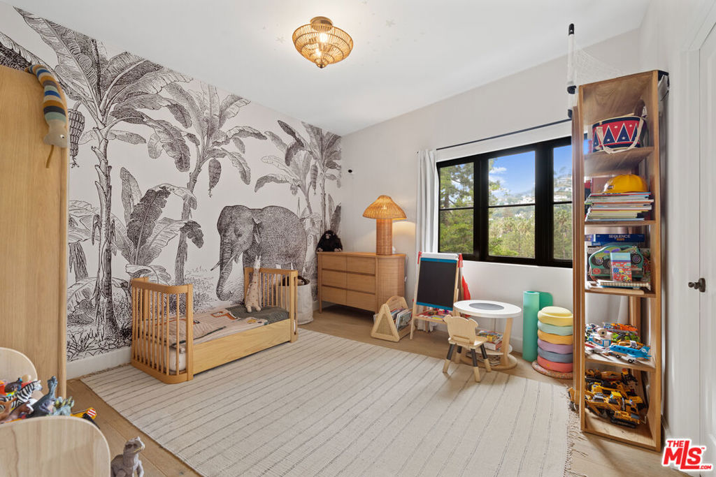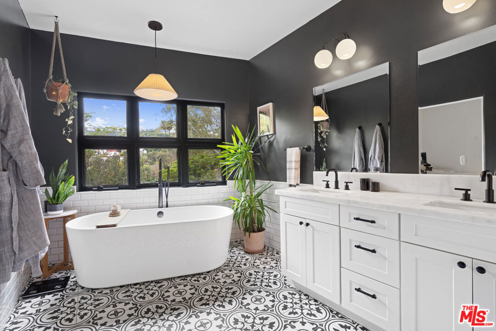 Stunning modern retreat nestled in the heart of Hollywood Hills with jacuzzi! Surrounded by lush greenery, this 3-bedroom, 3-bath residence offers treehouse-like privacy and curated sophistication across thoughtfully designed indoor and outdoor spaces. The grand primary suite is a true sanctuary, featuring vaulted ceilings with exposed wood beams, a sculptural pendant light, and ample space for both lounging and fitness. Black-framed windows and French doors lead to a private terrace overlooking the treetopsperfect for morning coffee or evening unwinding. The suite is complemented by a custom walk-in closet with extensive built-ins, and a spa-inspired bathroom with bold patterned tile, dual vanities, a soaking tub, and a glass-enclosed rain shower.A secondary suite offers a curved architectural wall, built-in desk, and access to a full bathroom with subway tile and matte black fixturesideal for guests, a home office, or a cozy den. Transitioning through the home, a bright hallway with picture-frame cutouts adds visual intrigue and leads to the heart of the home, where pale oak floors and crisp white walls maintain a warm, modern aesthetic.The outdoor areas are a showstopper, offering multiple private vignettes for entertaining and relaxation. A sunken courtyard is wrapped with built-in bench seating and surrounded by potted tropicals and cacti, while a wraparound deck includes a dining bar, lounge seating, and a wall-mounted fountain, perfect for gatherings or quiet moments. A raised herb garden deck includes built-in planters and a daybed for enjoying slow afternoons.Every corner of this home is designed with intentcustom light fixtures, thoughtful architectural symmetry, and seamless indoor-outdoor flow create a harmonious living experience. From the balconies and outdoor escapes to the luxurious interior detailing, this home invites you to live immersed in style, nature, and comfort in one of LA’s most vibrant neighborhoods.
