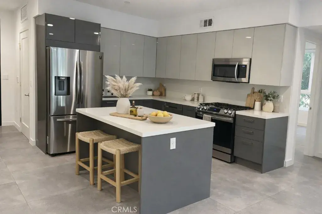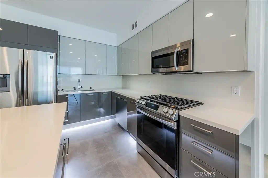 The chef’s kitchen is the true centerpiece — Calacatta quartz countertops and island, two-tone high-gloss Italian cabinetry with soft-close drawers, and a full stainless steel appliance suite including gas range, French door refrigerator, dishwasher, and built-in microwave.