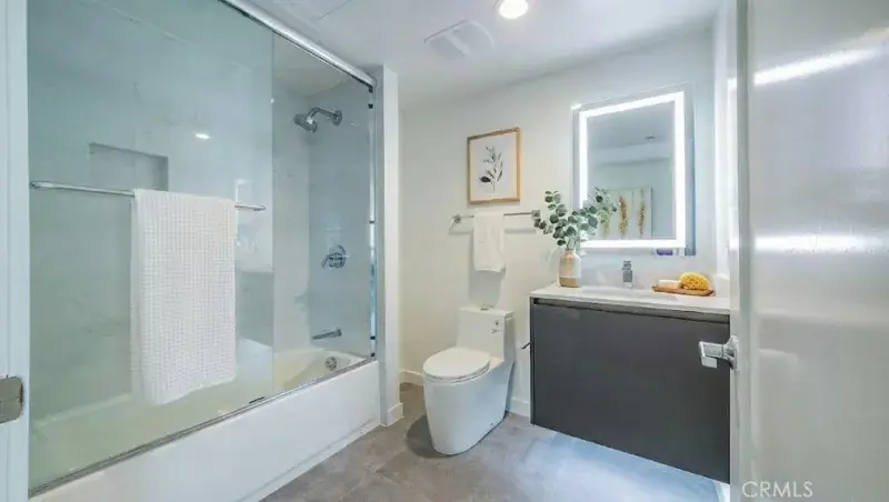 Both spa-like bathrooms feature marble-look tile, glass-enclosed tub/shower, floating vanity, and backlit LED mirror.