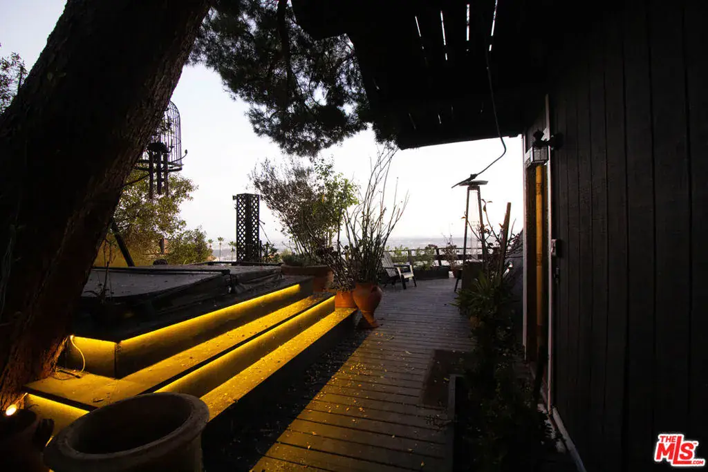 Hollywood Hills Zen Home with Jetliner Views Located above Sunset Plaza, this eclectic oasis features spectacular views of LA. It’s the perfect retreat for singles and couples. This architecturally distinctive home features walls of glass and A-frame structure consisting of 2 beds, 2 baths & an open plan living area. With large decks wrapping around all 4 sides of the home, the outdoor area blends seamlessly with the homes interior space. The deck includes a large hot tub, gas grill, outdoor dining, several chaises and chairs, a fire feature, lush landscaping and tropical plants thruout. The guest bedroom features a queen-size bed, bathroom ensuite and large windows looking out to the deck and LA skyline. Ascend the spiral staircase to find the beautifully appointed master suite featuring a separate sitting area, gas fire place, king-size bed and bathroom ensuite. Double doors open from the master bedroom to the spacious back patio with a gorgeous outdoor chandelier. AVAILABLE FOR SHORT TERM AND MONTHLY – PLEASE INQUIRE FOR RATES.
