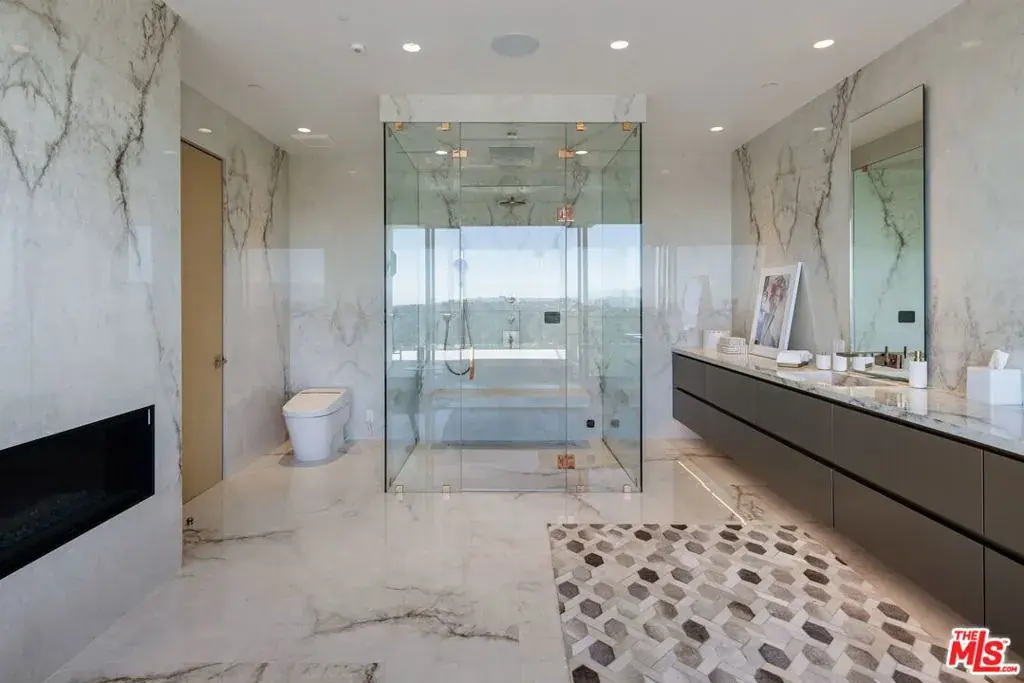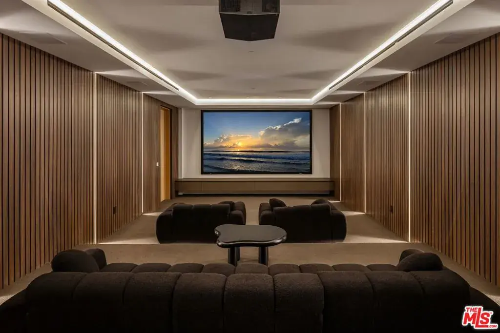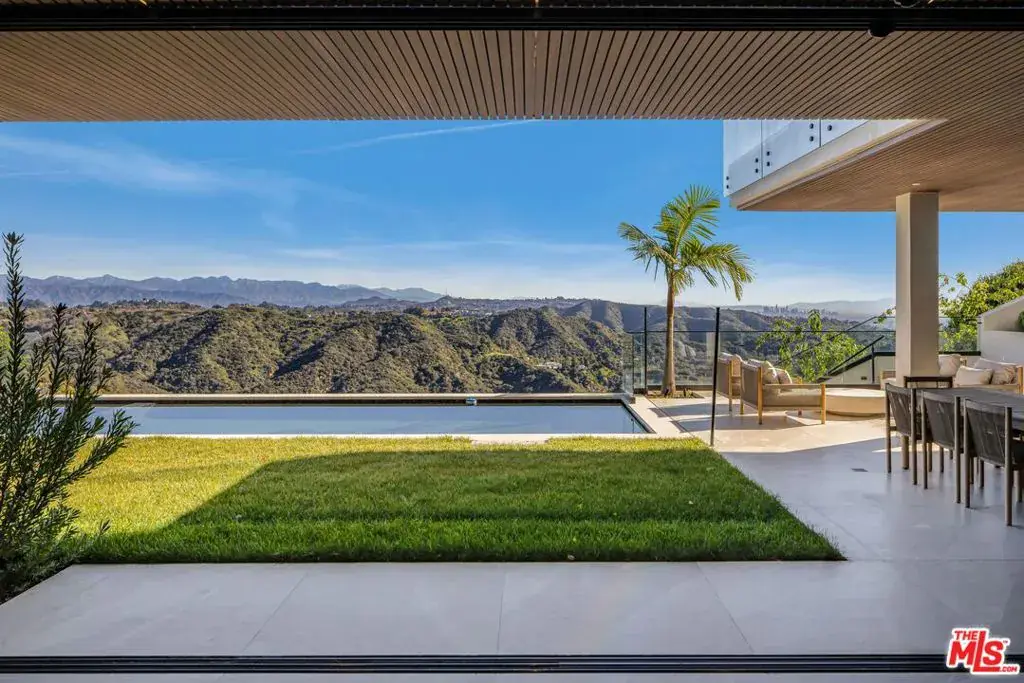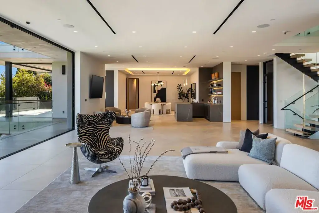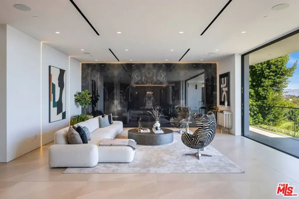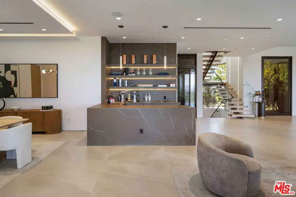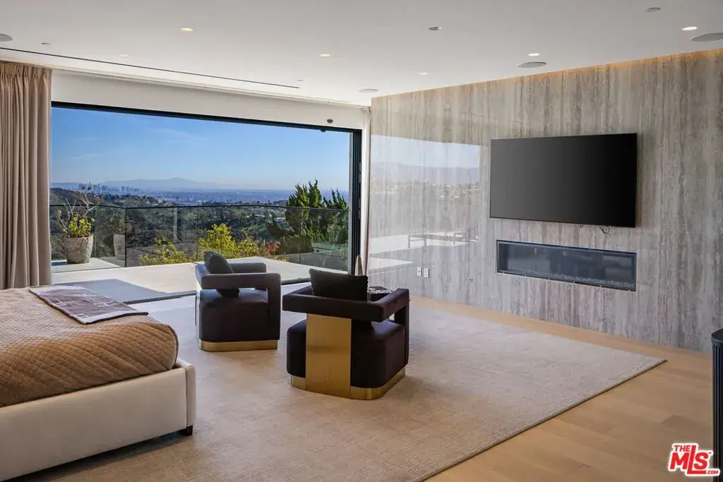 Welcome to 2180 Stradella Road, a striking contemporary new construction with sweeping panoramic views of the reservoir and Downtown Los Angeles. Designed with exceptional craftsmanship and refined finishes, this architectural residence is thoughtfully positioned to maximize its dramatic setting. Soaring ceilings and walls of glass define the open-concept main level, featuring a grand living room with a statement marble fireplace, formal dining room, family lounge, and a chef’s kitchen with adjacent butler’s kitchen, all outfitted with top-tier appliances. A guest suite completes the main floor. The upper level is highlighted by an expansive primary retreat with a wraparound terrace, marble fireplace, dual oversized dressing rooms, and spa-inspired baths, along with three additional en-suite bedrooms and a laundry room. An elevator connects to the lower level, designed for entertaining, with a theater, lounge and bar, wine wall, gym, and two additional bedrooms. Floor-to-ceiling pocket doors open to an outdoor kitchen, resort-style pool, spa, and yard overlooking the reservoir. Set on over an acre in a coveted Bel Air location, this newly built estate offers exceptional views, privacy, and elevated modern living.