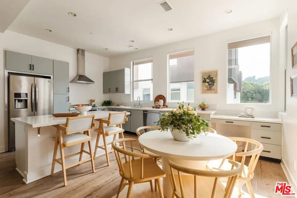 Set within one of Silver Lake’s most sought-after enclaves, this fully detached contemporary home blends privacy, light-filled interiors, and a thoughtfully designed floor plan for modern living. Positioned as a desirable corner unit with no shared walls and no HOA dues, the home feels peaceful and removed while remaining moments from the heart of the neighborhood. Thoughtfully updated throughout, the residence features wide-plank flooring in a warm oak tone throughout, 10-foot ceilings, automated window blinds, and a bright, airy layout that enhances everyday living. The open living and dining areas flow seamlessly and are filled with natural light, creating an inviting space for both entertaining and quiet moments at home. The kitchen balances function and style with European stainless steel appliances, a Bertazzoni gas range, sleek quartz countertops, and generous cabinetry. Upstairs, three well-appointed bedrooms offer comfort and flexibility, including a serene primary suite with an ensuite bath and custom closet systems by Lif in Jeneral, along with two additional bedrooms ideal for guests, family, or a dedicated home office. One of the home’s standout features is the private rooftop deck, a tranquil outdoor retreat with sweeping hillside views, perfect for morning coffee, sunset gatherings, or relaxed weekends at home. With direct-access parking, in-unit laundry, and move-in-ready interiors, the home offers the ease and privacy of single-family living within a well-loved community. Located in the heart of Silver Lake, just moments from LaMill, Botanica, Bar Siesta, the Reservoir, and so much more, this is design-conscious living in a truly special setting.