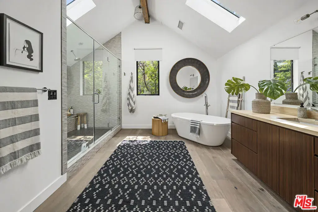 Iconic A-frame modern architectural built in 2016. Fire resistant 50 year metal roof and siding. The main home upstairs features three large bedrooms, including a primary suite encompassing the entire top floor with a spacious double shower and floating tub. Perched atop Glendale Blvd with views of the Griffith Park Observatory and the Hollywood Sign, the property is within walking distance to Whole Foods, the Silver Lake reservoir, various restaurants, and the Silver Lake Meadow. This all-electric home is equipped with a Tesla charger, twenty four solar panels, and a EIGHT parking spaces. The ground floor features a two bedroom one bath ADU entered from a side entrance plus a bonus garage/office for those who like to work from home. Rock solid foundation with grade beams an piles.