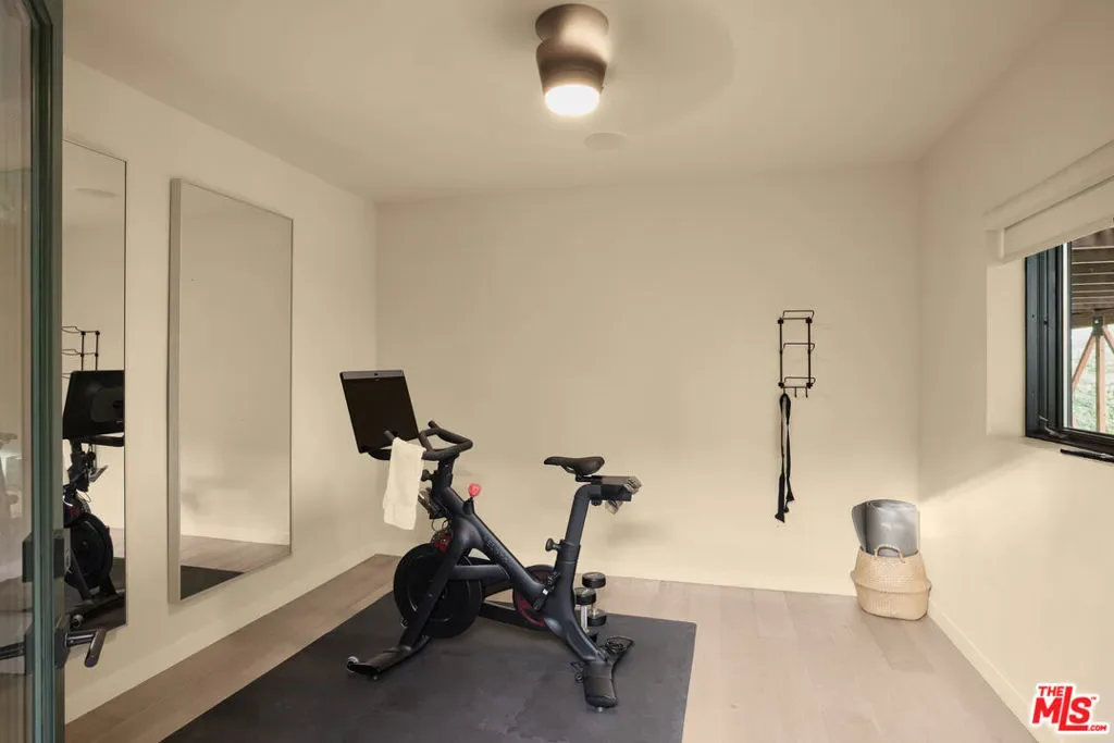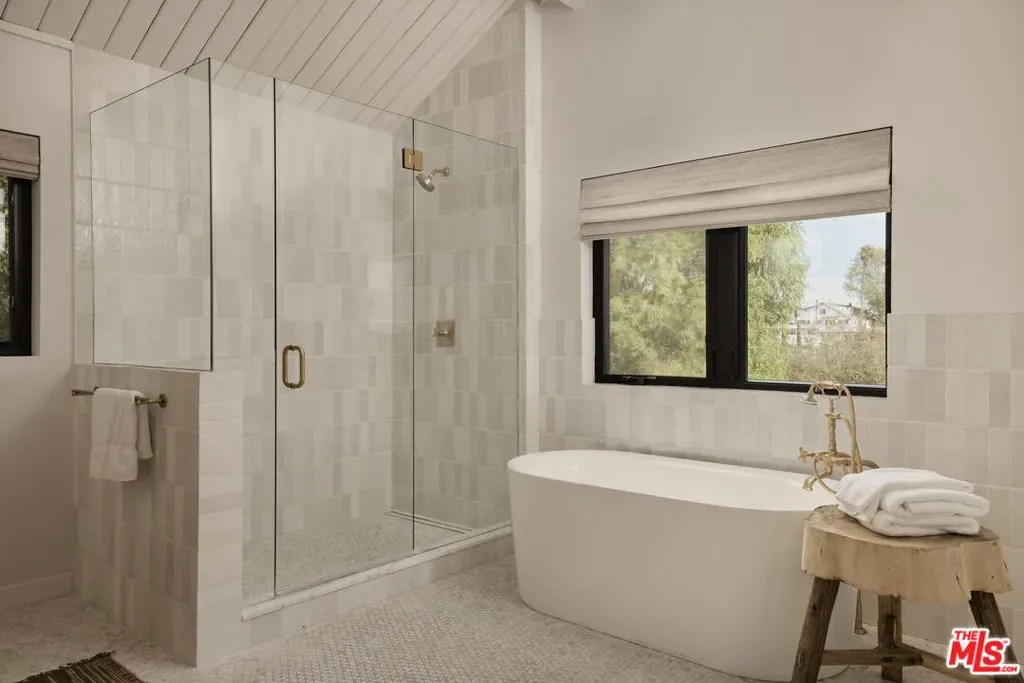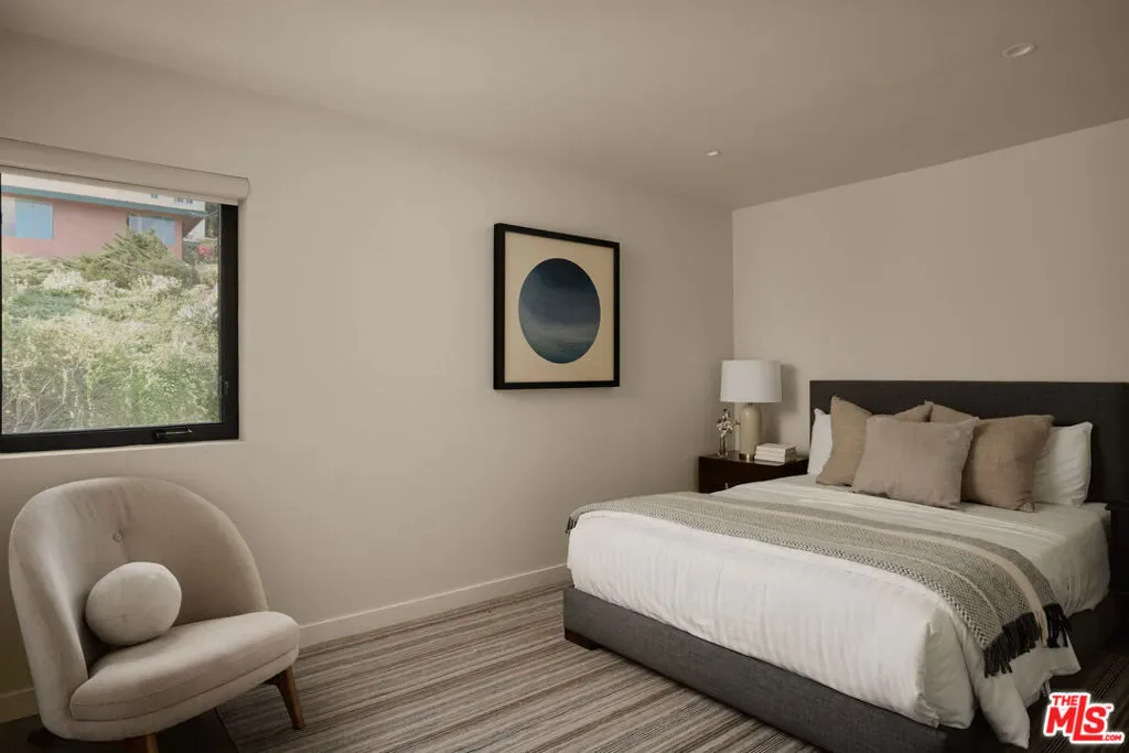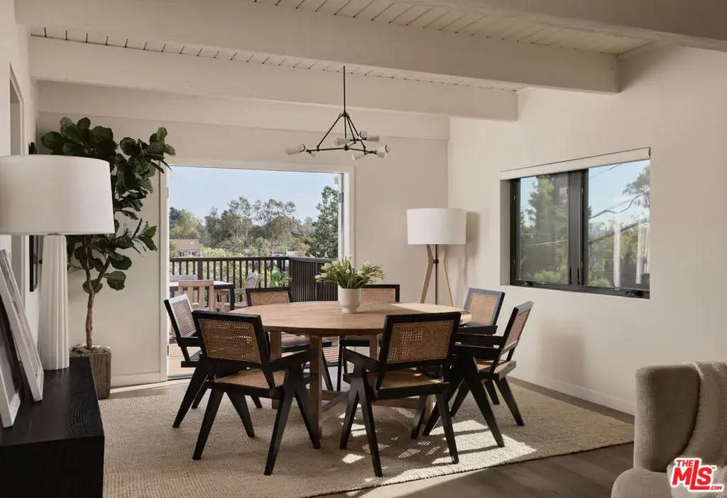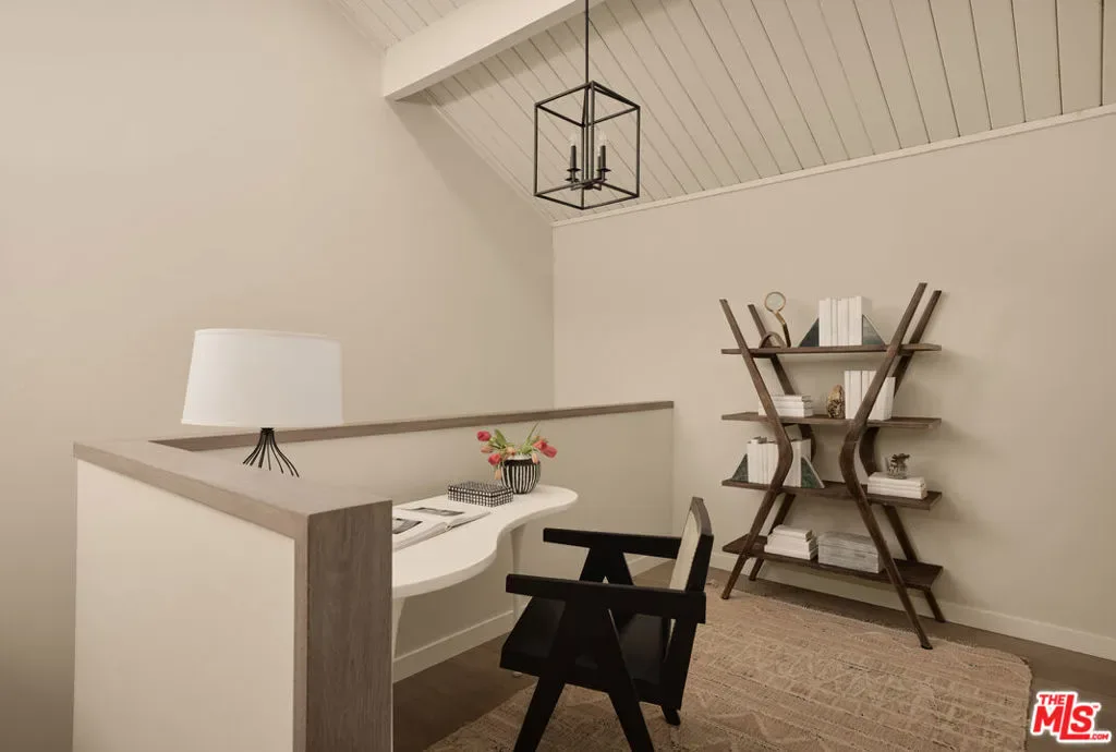 Set on one of the coveted flat streets in the hills of Elysian Heights, this modern A-frame inspired residence offers striking architecture, thoughtful design, and an exceptional sense of space across a light-filled foot floor plan. Soaring ceilings, warm materials, and curated finishes create a seamless balance of rustic charm and modern convenience.Upon arrival, a welcoming entry and oversized mudroom establish a sense of flow and intention. The main living areas unfold into an expansive great room where vaulted tongue-and-groove ceilings, clerestory windows, and a gas fireplace set a warm yet dramatic backdrop. The kitchen is both streamlined and expressive, outfitted with integrated appliances, open shelving, custom lighting, abundant storage, and connects naturally to an intimate den perfect for casual evenings or quiet mornings. Natural light pours throughout the 4-bedroom, 3-bath home via multiple skylights. The main level also includes a bedroom, full bath, and laundry area. Public spaces extend outdoors to an expansive 1,800+ square-foot refinished deck overlooking treetops, rolling hillsides, Downtown Los Angeles views, and a resort-style saltwater pool, spa, and fire pit ideal for entertaining or unwinding in total privacy. Upstairs, the serene primary suite offers dual closets and a beautifully designed bathroom with a soaking tub, walk-in shower, and dual-sink vanity. Two additional bedrooms and a full bathroom complete the second level. A detached office/gym provides a quiet, private space for work or creative pursuits. Meticulously updated interiors showcase designer finishes, custom millwork, and thoughtful details throughout. Updated systems and solar panels complete the offering. Ideally situated in Echo Park, just steps from the outdoors and moments from neighborhood favorites, Sunset Boulevard, and Silver Lake, this home delivers inspired design, effortless indoor-outdoor living, and a true urban hillside escape.