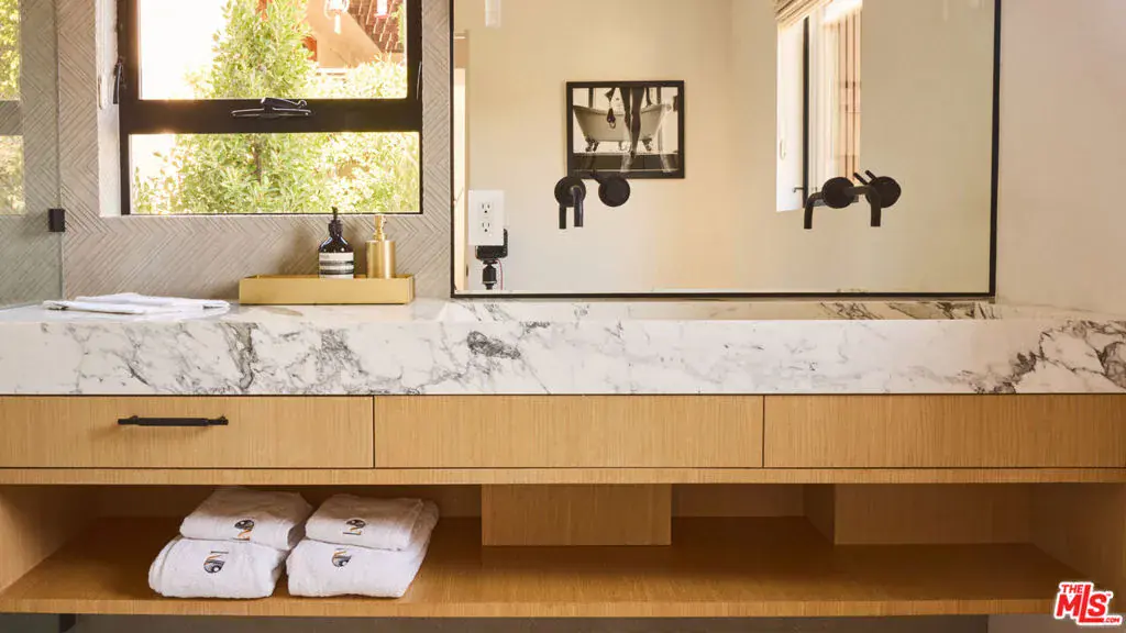 Tucked away in the exclusive Hollywood Hills, this private retreat seamlessly blends Old Hollywood glamour with modern luxury. Just minutes from the iconic Hollywood Sign, top studios, and world-class dining, it offers the perfect balance of seclusion and convenience. Designed with exquisite craftsmanship, the home showcases top-of-the-line finishes, including Brazilian woodwork, Italian marble, and bespoke wood cladding, plus a smart home system, creating an atmosphere of timeless sophistication. Expansive windows flood the space with natural light while framing breathtaking views. The main house features two bedrooms and 2.5 baths, while a detached bonus room serves as a versatile third space with its own bath, ideal for guests or a creative studio. Outside, the beautifully designed oasis invites effortless entertaining with a sparkling salt water heated pool, spa, fire pit, built in BBQ area, 2 car garage, all set against the backdrop of the serene Hollywood Hills. A true masterpiece, where classic elegance meets contemporary tranquility.
