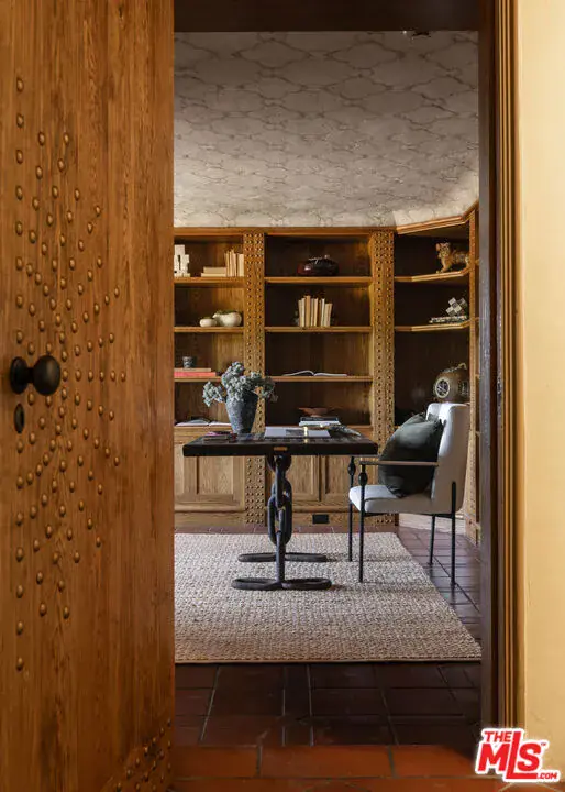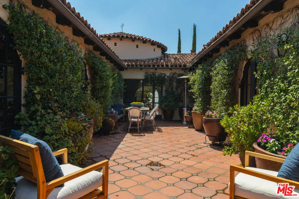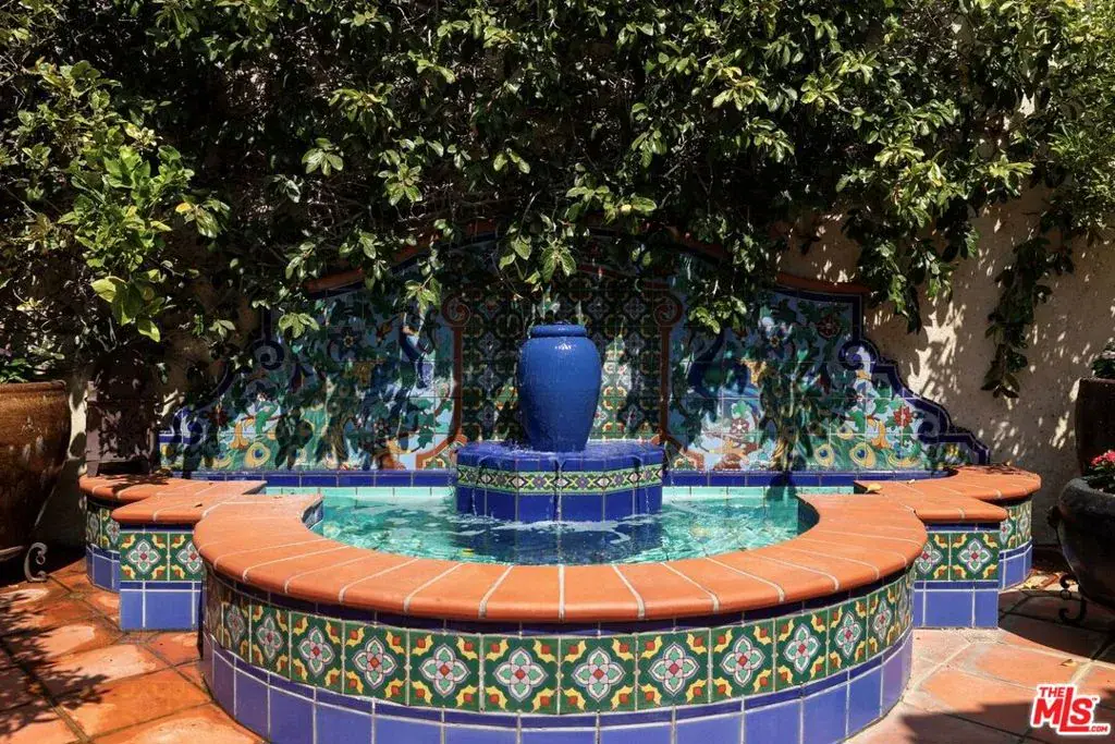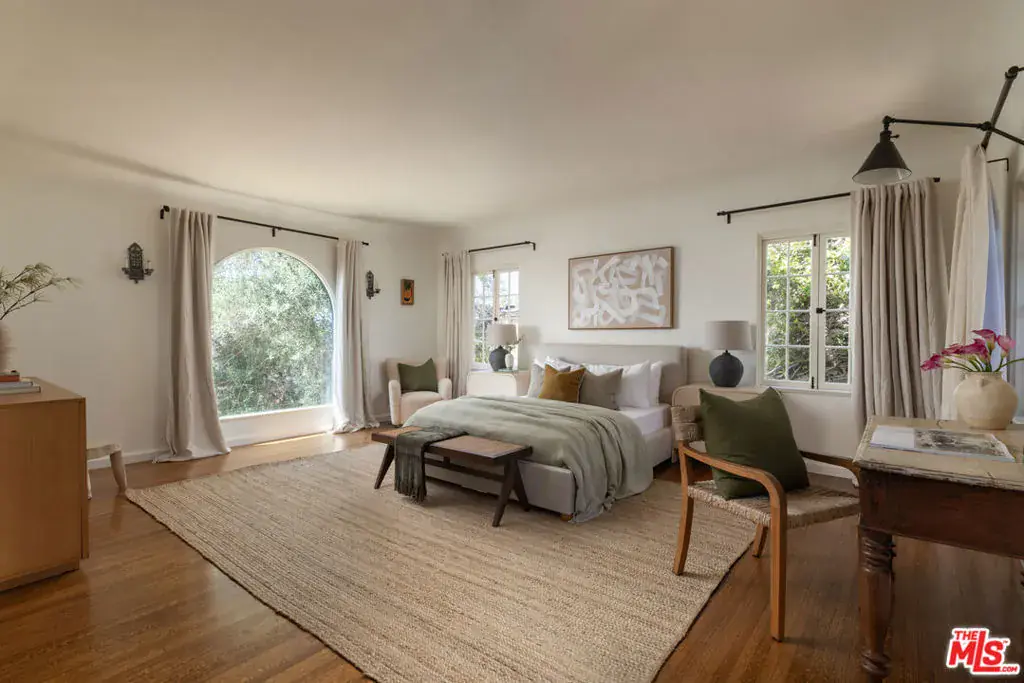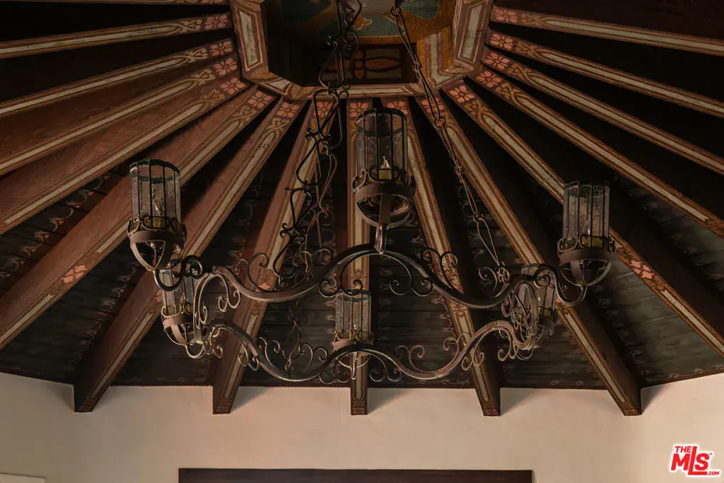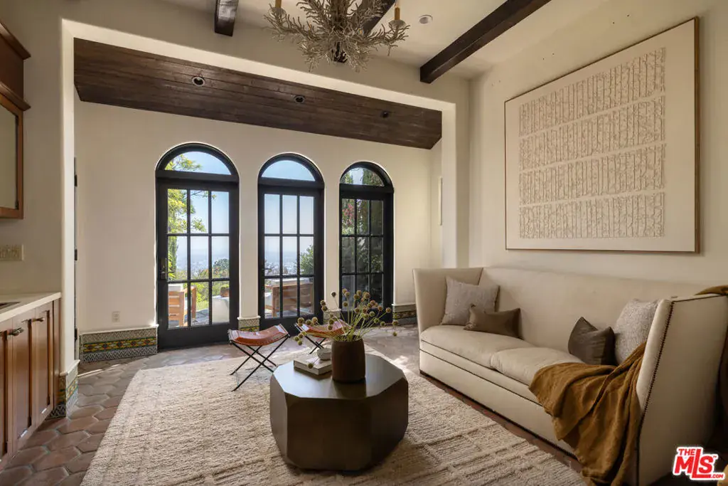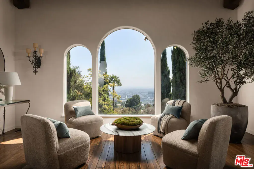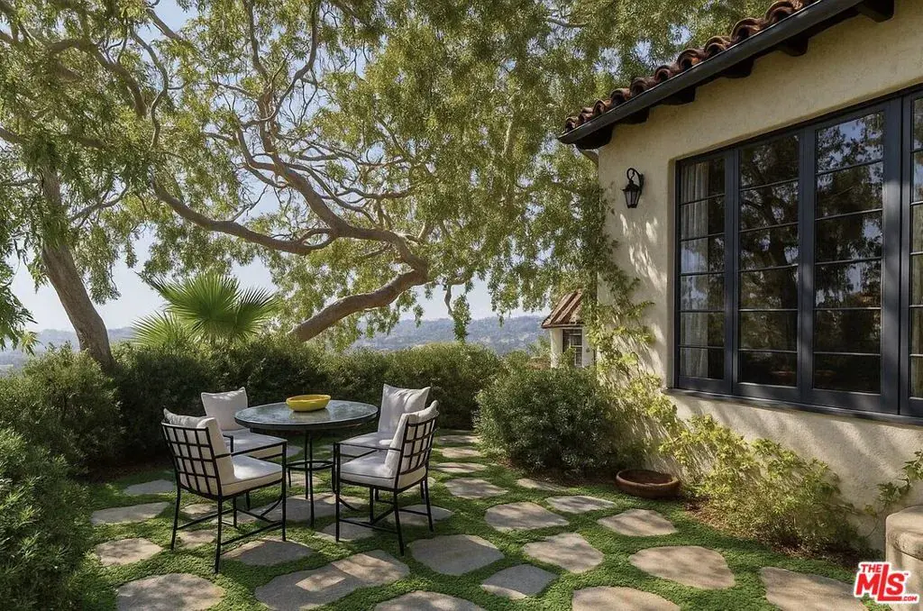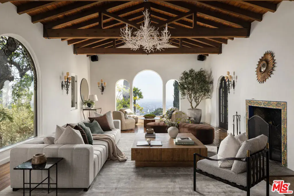 This restored Spanish villa sits on a large promontory offering sweeping views from the city to the ocean. It combines modern amenities with the timeless character of its original period design. A gracious wood beamed rotunda entrance, a soaring vaulted truss ceiling in the living room, large picture windows, French doors with original carved arches, rich wood flooring and Malibu tile accents throughout are just a few of the home’s striking design features. The floor plan features a center-island kitchen, wood-paneled office, family/media room, formal living room with a bar and fireplace, formal dining room, and two powder rooms. An interior circular stairwell leads to a spectacular guest suite with a private exterior entrance, an elegant bathroom, and a separate sitting room with a kitchenette. The exquisite grounds include an inner courtyard, multiple patios, an expansive lawn, and a striking swimming pool, all set within a secluded cul-de-sac in The Oaks community.