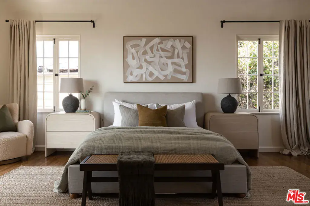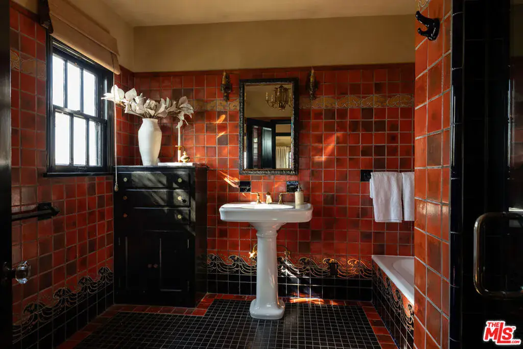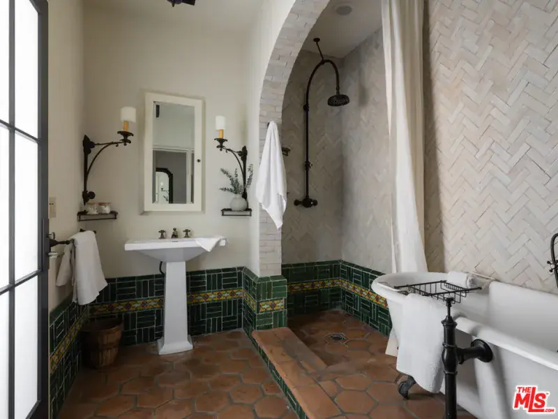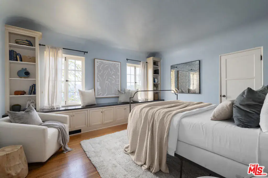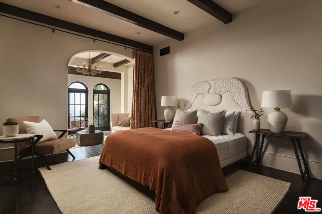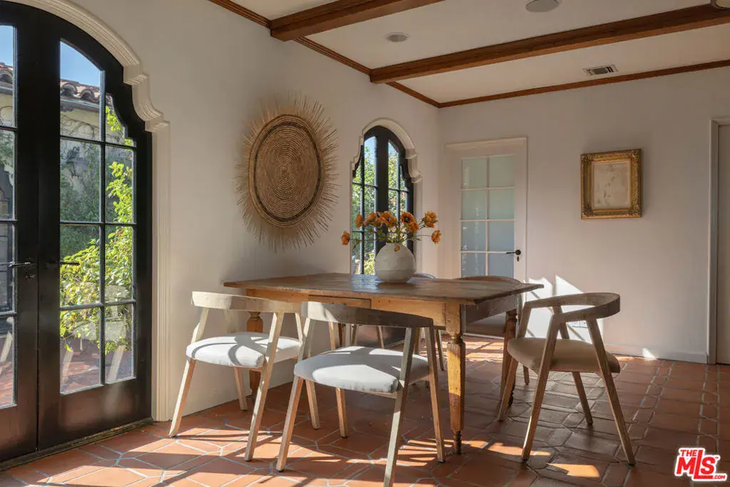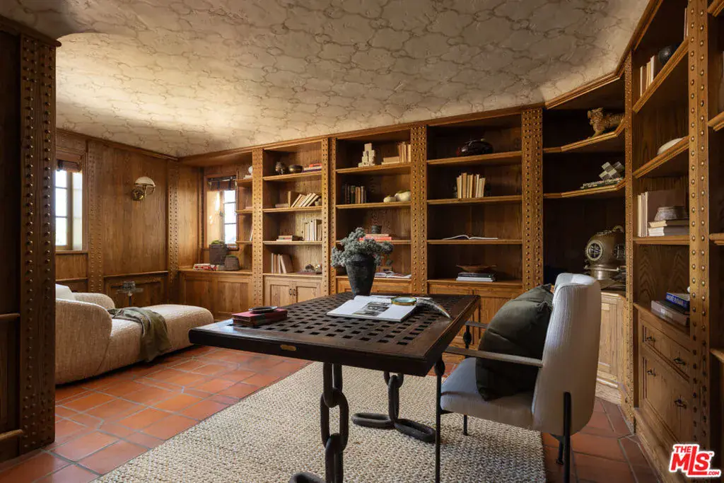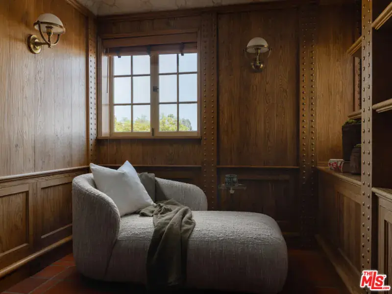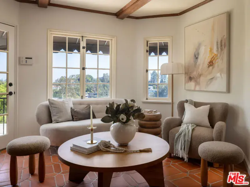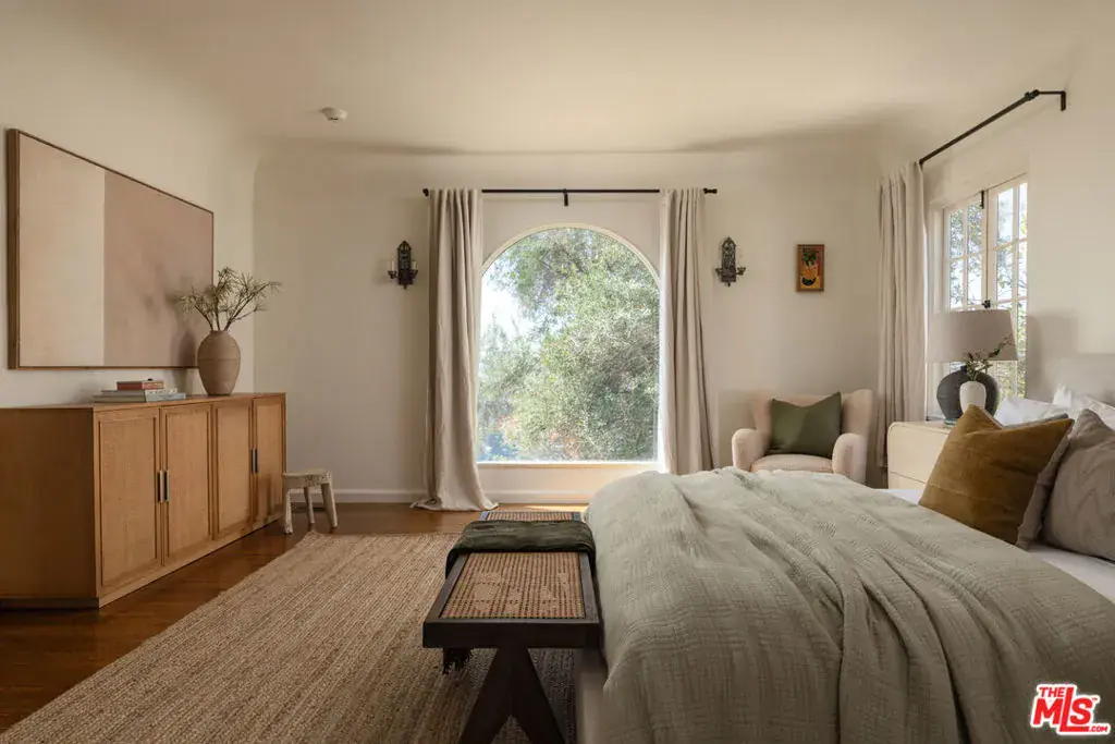 This restored Spanish villa sits on a large promontory offering sweeping views from the city to the ocean. It combines modern amenities with the timeless character of its original period design. A gracious wood beamed rotunda entrance, a soaring vaulted truss ceiling in the living room, large picture windows, French doors with original carved arches, rich wood flooring and Malibu tile accents throughout are just a few of the home’s striking design features. The floor plan features a center-island kitchen, wood-paneled office, family/media room, formal living room with a bar and fireplace, formal dining room, and two powder rooms. An interior circular stairwell leads to a spectacular guest suite with a private exterior entrance, an elegant bathroom, and a separate sitting room with a kitchenette. The exquisite grounds include an inner courtyard, multiple patios, an expansive lawn, and a striking swimming pool, all set within a secluded cul-de-sac in The Oaks community.