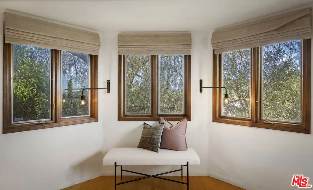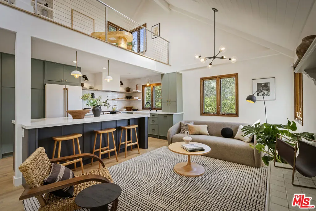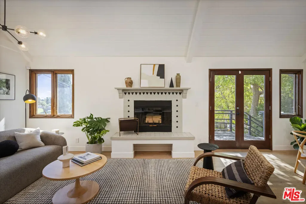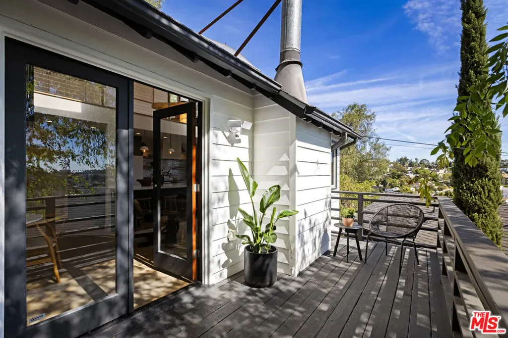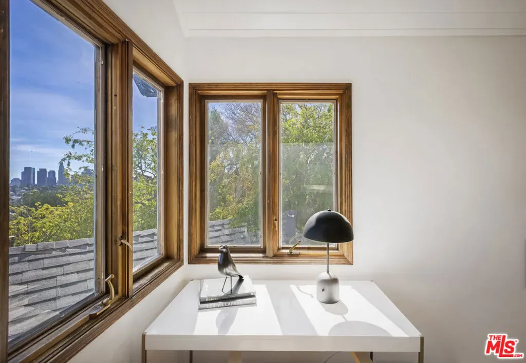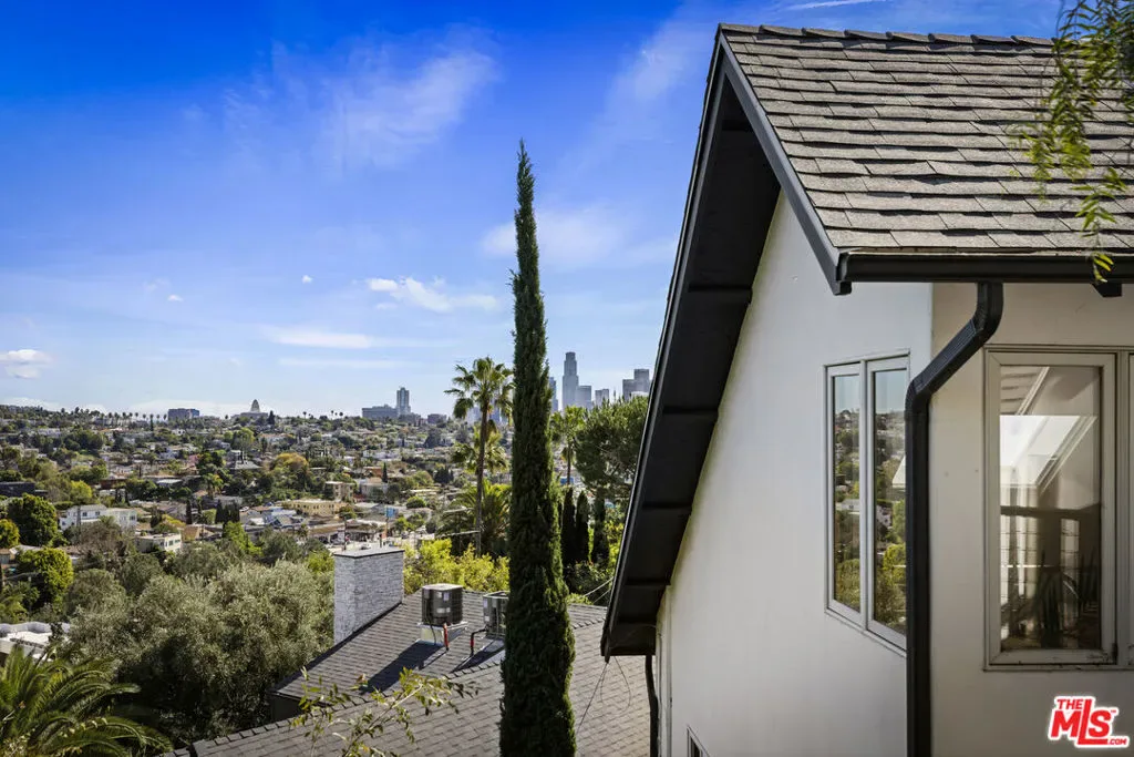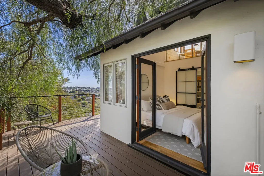 Thoughtfully positioned on a quiet Cul-De-Sac in the Silver Lake Highlands where Effie St. culminates to a stair street sits this exquisite architectural treehouse with 180-degree views. A private oasis in the clouds, gated discreetly for privacy; the front balcony reached from a semi-private driveway reveals a wide-open picture over Elysian Park/Dodger Stadium, spanning beyond Little Tokyo and Downtown LA. Dual front doors of glass open to the bright front room with fireplace. Skylights, a multitude of windows and the glow of glass bricks saturate every bit of space with sunlight and shadows. Spiral staircase leads to the loft with built-in book storage which proves the perfect nook for office or reading. The chic Chef’s kitchen features an island with built in beverage/wine cooler and entertainers barstool seating. Designer appliances including Cafe’ refrigerator and range and a Bosch dishwasher. Ample cabinets and shelving for appliances give convenience and maximum use of space. On the main level are two generous bedrooms in size, second bedroom with a cedar closet and accent designer wall. From the first level, the private garden with soaring walls of creeping fig, separate entrance, built in Fisher & Paykal grill, gas fire feature and built in seating create the atmosphere for summer time al fresco dining. A stairwell with ascending windows to the primary suite with a private balcony among the trees, oversized luxury closet, primary En suite bath and an airy and bright loft of its own creating a tranquil retreat. The wrap around deck, also overlooking City Hall and DTLA is encompassed by mature pepper trees.Other notables, a tankless water heater, large 2 car garage with integrated shelving for storage and a wide drive for optional parking. Proximity to Sunset Blvd with it’s eateries, boutiques and coffee shops. Retreat above the noise and experience Silver Lake and Echo Park with its hidden history feel. Silver Lake continues to be proven one of the most exciting and creative neighborhoods, unmatched in Los Angeles.