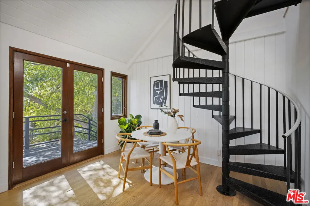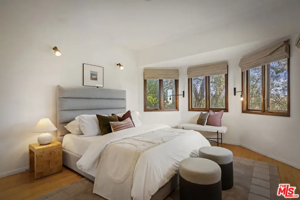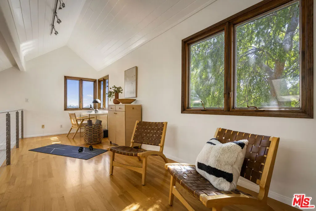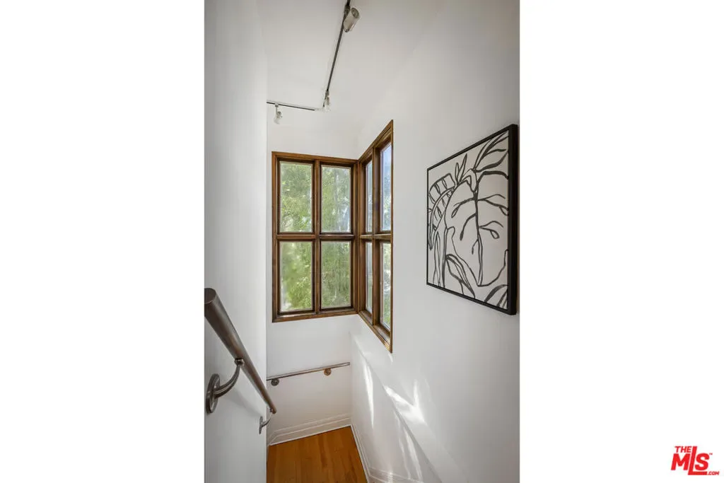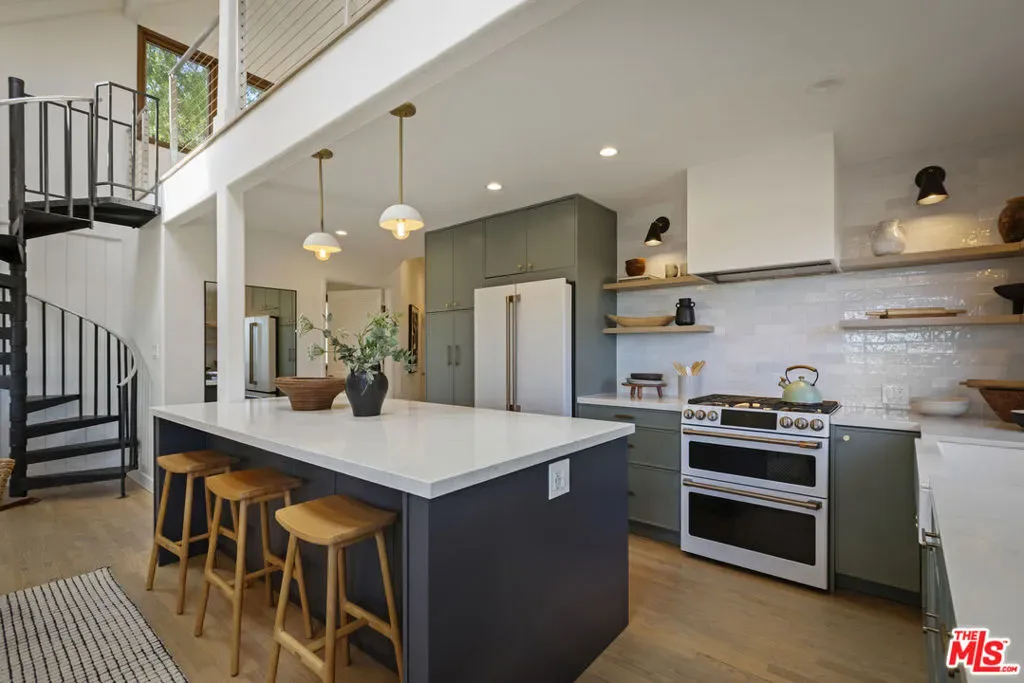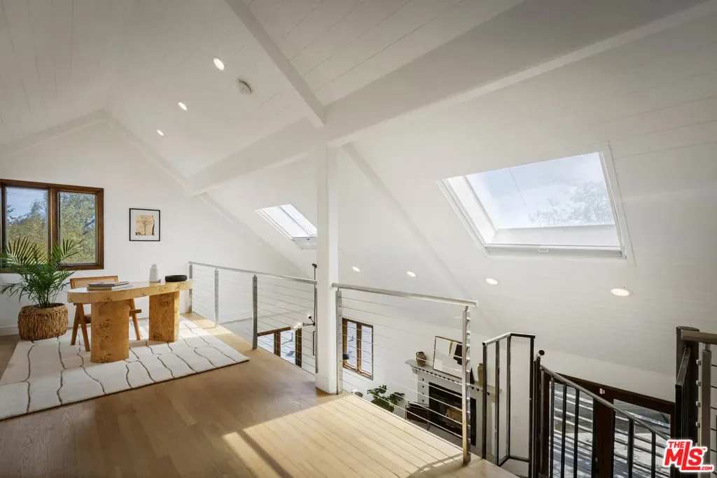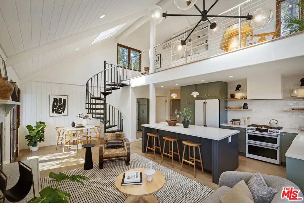 Thoughtfully positioned on a quiet Cul-De-Sac in the Silver Lake Highlands where Effie St. culminates to a stair street sits this exquisite architectural treehouse with 180-degree views. A private oasis in the clouds, gated discreetly for privacy; the front balcony reached from a semi-private driveway reveals a wide-open picture over Elysian Park/Dodger Stadium, spanning beyond Little Tokyo and Downtown LA. Dual front doors of glass open to the bright front room with fireplace. Skylights, a multitude of windows and the glow of glass bricks saturate every bit of space with sunlight and shadows. Spiral staircase leads to the loft with built-in book storage which proves the perfect nook for office or reading. The chic Chef’s kitchen features an island with built in beverage/wine cooler and entertainers barstool seating. Designer appliances including Cafe’ refrigerator and range and a Bosch dishwasher. Ample cabinets and shelving for appliances give convenience and maximum use of space. On the main level are two generous bedrooms in size, second bedroom with a cedar closet and accent designer wall. From the first level, the private garden with soaring walls of creeping fig, separate entrance, built in Fisher & Paykal grill, gas fire feature and built in seating create the atmosphere for summer time al fresco dining. A stairwell with ascending windows to the primary suite with a private balcony among the trees, oversized luxury closet, primary En suite bath and an airy and bright loft of its own creating a tranquil retreat. The wrap around deck, also overlooking City Hall and DTLA is encompassed by mature pepper trees.Other notables, a tankless water heater, large 2 car garage with integrated shelving for storage and a wide drive for optional parking. Proximity to Sunset Blvd with it’s eateries, boutiques and coffee shops. Retreat above the noise and experience Silver Lake and Echo Park with its hidden history feel. Silver Lake continues to be proven one of the most exciting and creative neighborhoods, unmatched in Los Angeles.