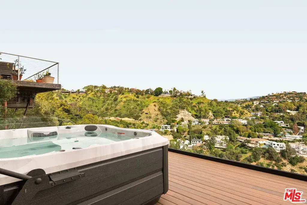 Located in the coveted Mount Olympus neighborhood of the Hollywood Hills, this completely remodeled 4-bedroom, 4.5-bath modern home offers spectacular city and canyon views in a serene setting. The open floor plan is designed for both everyday living and entertaining, featuring a gourmet kitchen with all Miele appliances, a built-in espresso machine, custom Italian cabinetry by Molteni & C, and Taj Mahal marble countertops and a breakfast bar for casual dining. The open floor plan includes a dining area and living room with a fireplace, opening to balconies offering views from every room. The downstairs level opens to a brand-new deck with a spa, fire pit, and outdoor kitchen complete with a built-in BBQ, cooktop, refrigerator, and new teak furnishings. There is a den/ office and a steam shower to use after a workout in your own personal gym. All main bedrooms are located on the top level – primary suite and secondary bedrooms feature custom walk-in closets, while spa-inspired baths include high-end stone finishes and heated floors. Additional highlights include real hardwood floors, built-in Sonos speakers, motorized Lutron shades, a workout room, movie theater/media room, security system, and two electric vehicle charging stations. Prime location in Los Angeles offering privacy and tranquility, yet just moments from the Sunset Strip and city conveniences.