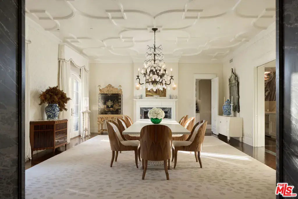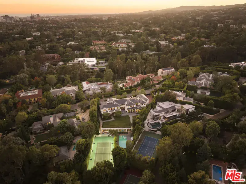 A timeless traditional estate gracefully sited on one of Holmby Hills’ most coveted streets. Behind private gates, this elegant residence blends classic architecture with interiors by New York based designer Markham Roberts. A dramatic two-story foyer sets the tone, leading to gracious formal rooms rich with detail, from the lacquered library and sophisticated billiards room to sunlit living spaces that open seamlessly to expansive grounds, a resort-style pool, and a tennis court. Thoughtful craftsmanship, custom millwork, marble thresholds, and designer lighting create a luxurious yet welcoming atmosphere throughout. Lush mature landscaping, a pool pavilion, and generous outdoor lounge and dining terraces provide a serene retreat for relaxation and entertaining. The primary suite is a private sanctuary unto itself, complete with an intimate office, safe room, dual spa-inspired baths, generous custom closets, and a beautifully integrated built-in bar/kitchenette. A backdrop of golden hills and twinkling city lights elevates everyday living. Additional amenities include a fitness studio spa, wine cellar, guest house, media room, elevator, ample bedrooms for staff and a 4-car garage. A rare offering of scale, privacy, and sophistication in one of Los Angeles’ most distinguished neighborhoods. Property available fully furnished for $55M. Approx. SF Breakdown: Main house 13,556 sf, Guest House 2,553 sf, Pool House 196 sf
