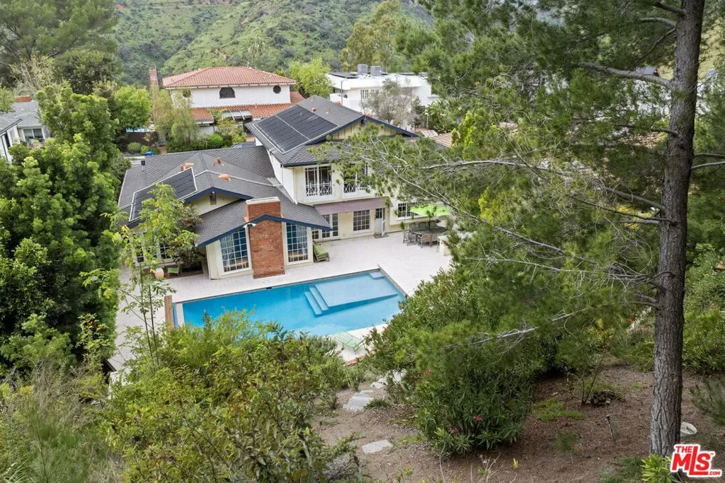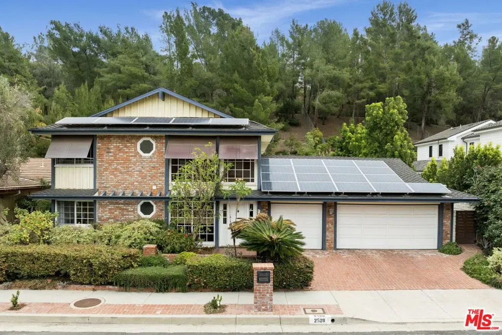 Wonderful updated 2 story 4 bedroom 3.50 bath home on a tree lined cul-de-sac with side walks in the hills of Brentwood. Two story entry with Marie Antoinette wooden floors that continue into the living and dining rooms. The living room has soaring vaulted ceilings and huge windows and French doors, allowing in tons of natural light and a fireplace for those cozy romantic evenings. Large gourmet kitchen with triple bull nosed granite counter tops, sub-zero refrigerator, center island and high walk-in pantry, all open to a wonderful large family room.The upper level comprises a fabulous primary suite with greenery view, walk in-closet and dressing room with make up table. Beautifully remodeled primary bath with spa tub, separate walk-in shower and heated towel rack. Two additional bedrooms upstairs share a remodeled bathroom. The lower level has one fully contained bedroom suite, a separate den or office with wine cellar and French doors leading out to a lovely seating area. Resort like yard with swimming pool with electric cover, outdoor kitchen, lovely mature landscaping and stone patio, perfect for entertaining. Additional features include solar panels for electrical efficiency and to heat the pool, an abundance of storage, 2 zone A/C and 3 car garage with direct entry.
