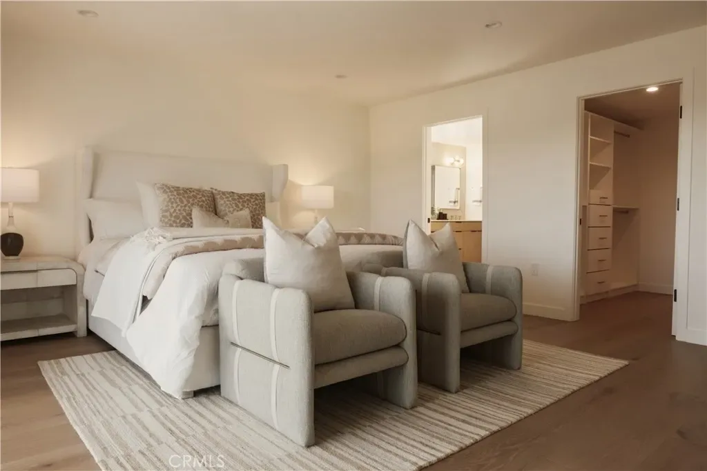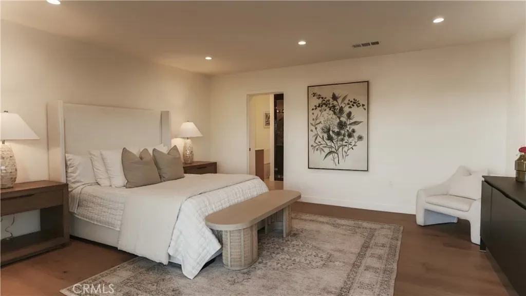 The main level centers around a chef’s kitchen outfitted with Thermador appliances and custom oak cabinetry, opening to a generous dining and living area anchored by a modern fireplace and integrated oak built-ins. A separate family room adds flexible space for work, play, or quiet relaxation. On the lower level, the primary suite offers a true retreat with a spa-style soaking tub overlooking the hills, dual walk-in closets, and direct access to a continuous view patio shared by two additional en-suite bedrooms. The entertainment level below is designed for hosting — complete with a full bar lounge, fourth en-suite bedroom, and a spacious deck ideal for al fresco evenings beneath the stars. With its private entrance, this floor can double as a guest residence, studio, or private suite, complemented by a bonus room perfect for a gym, theater, or playroom.
