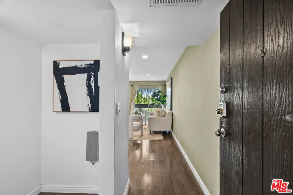 Tucked into the hills of Cahuenga Pass, this bright and airy condo is located in the gated Cahuenga Hills Tennis Condominiums just minutes from everything, yet quietly set away from the city buzz. Positioned in Building 3, one of the most private spots in the community, you get a more peaceful, hillside feel while still being right in the middle of it all. Inside, the space is filled with natural light and features laminate floors and an easy, open layout. The kitchen is updated with quartz countertops, stainless steel appliances, and bar seating that flows right into the living area great for everyday living or having friends over. Central A/C and heat, a smart keyless entry. The bedroom is spacious with a walk-in closet and enough room for a desk or work-from-home setup. A private balcony off the living room is perfect for coffee in the morning or winding down in the evening. The community has a laid-back, resort feel with pools, spa, tennis courts, gym, and a clubhouse with lounge and game areas. Enjoy the convenience of a pool just steps from the unit, along with access to a private trail offering views of Lake Hollywood and the city. All of this in a super central location near Runyon Canyon, Franklin Village, the Hollywood Bowl, and easy access to both the Valley and the rest of LA. Covered parking space located very close to the unit Includes extra storage.