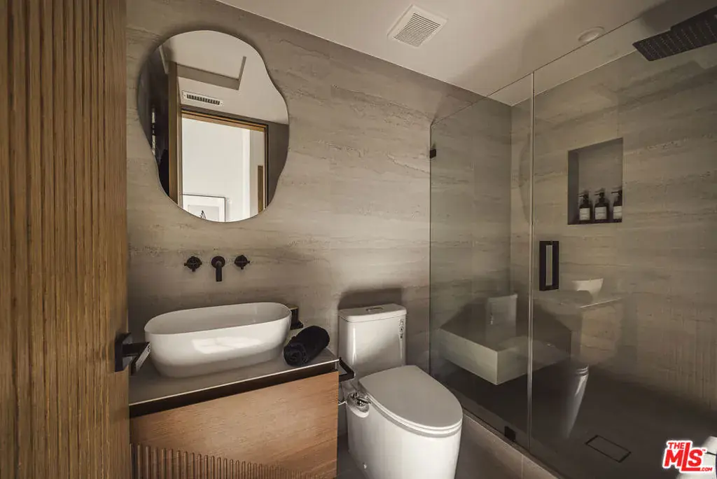 Experience modern luxury in this fully reimagined, 3-bedroom, 3-bath villa nestled in the heart of coveted West LA. Beyond the striking front entry with its custom metal door, an open living area seamlessly connects to the designer kitchen and two spacious ensuite bedrooms on the main level. A built-in wine display elegantly anchors the space under the staircase, adding a refined touch – the main living area flows effortlessly into a firesided family room framed by expansive Fleetwood glass doors that open to a private, resort-style backyard complete with an outdoor kitchen, pool & spa, and fire pit, all surrounded by mature ficus for ultimate seclusion. Up the sunlit staircase awaits the primary suite, a tranquil retreat featuring a generous walk-in closet, spa-inspired bath, and a sprawling west-facing deck perfect for enjoying the afternoon sun and evening breezes – tailored perfectly and fully furnished for the most discerning buyers.