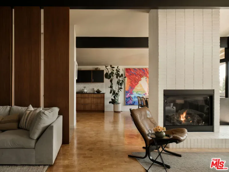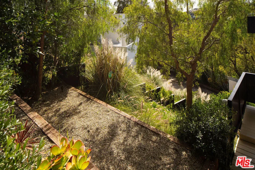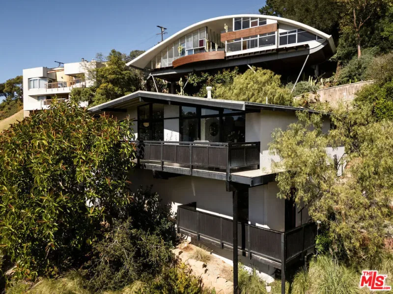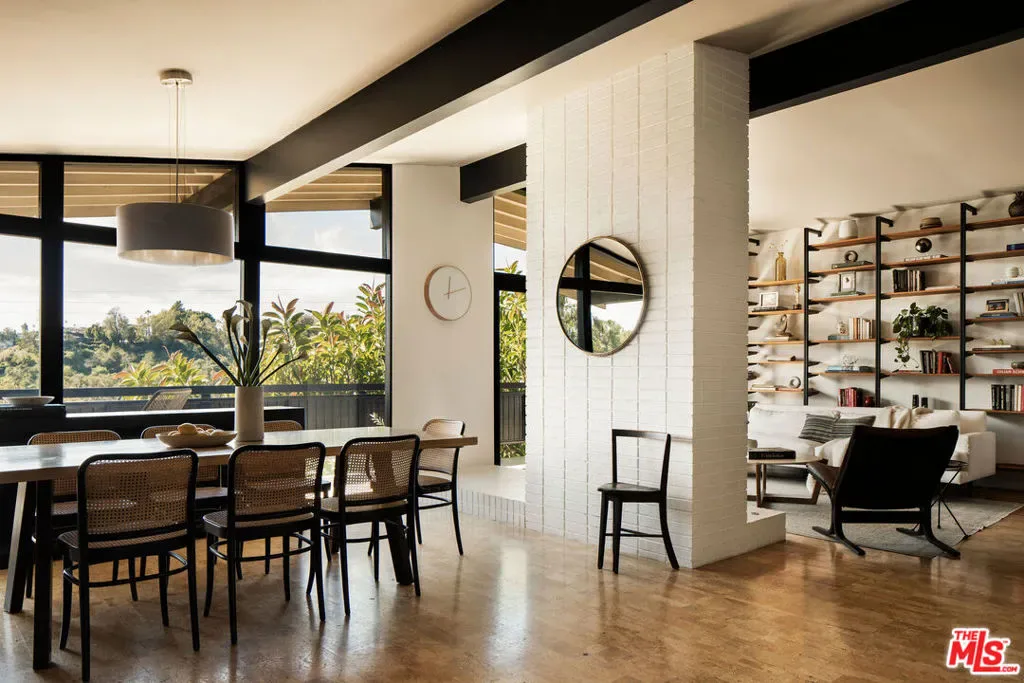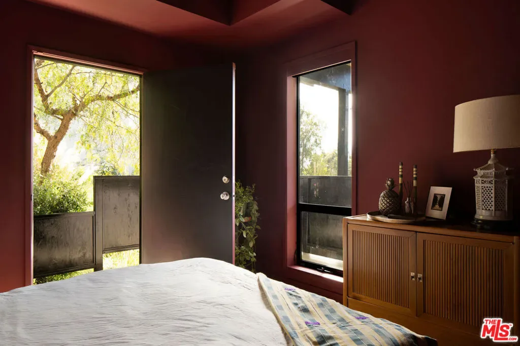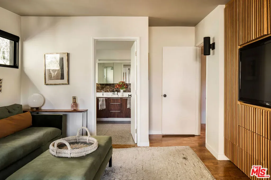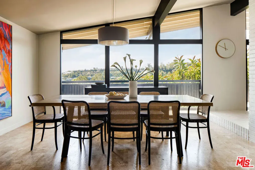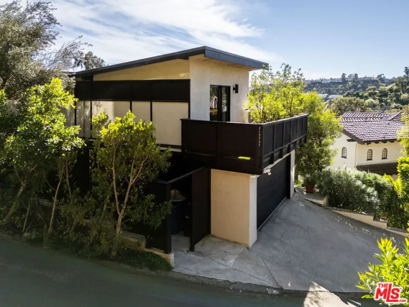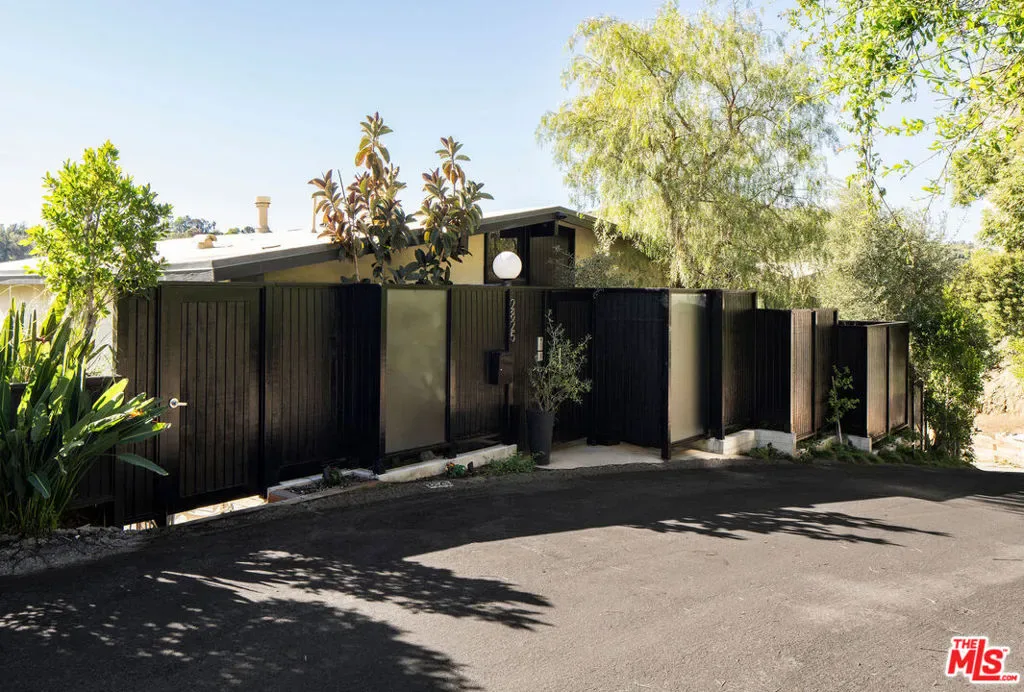 Located in Nichols Canyon with breathtaking hillside views, this 1960 post and beam home has been expertly renovated and restored by Chris Salay, and sits on a fully gated and fenced corner lot, landscaped to perfection. The home features 3 bedrooms, 2 full bathrooms, a detached lower studio with its own full bathroom, and 510 square feet of finished storage space. Set just below the iconic Lautner Garcia House, the home’s architectural elements include dramatic pitched ceilings, imported cork flooring, terrazzo-tiled bathrooms, custom-built-ins throughout, and floor-to-ceiling windows in the main living space that frame wide mountain vistas. Private, serene, and impeccably designed, the home offers idyllic canyon living. Beyond the secure front gate, the home opens to reveal its classic post and beam structure on full display. Striking vaulted ceilings and floor-to-ceiling windows with windowed doors lead to a long upper deck with unobstructed, panoramic hillside views. A center brick fireplace anchors the main living space, separating the dining area from the formal living room. The living room and adjacent den offer separate areas for hosting and relaxation, both with custom built-in shelving. The kitchen features custom-built dark wood cabinetry that complements the home’s architectural style. The top-of-the-line appliance suite includes a Sub-Zero refrigerator, a Thermador beverage column, Bosch dishwasher, and a Dacor gas range. Three bedrooms and two full bathrooms are situated down the hallway. The primary suite feels like its own wing, complete with a sitting area, custom fluted-wood built-ins, and sliding doors that open to a private deck with hillside views and a coveted peek at the Garcia House. The ensuite bath layers imported terrazzo flooring with Rosso marble tile, dual sinks, a soaking tub, and a shower. Two additional bedrooms share a bathroom finished with imported terrazzo floors, marble tile, Walnut wallpaper, and a custom wood vanity – equal parts playful and polished. Downstairs, a fully detached, oxblood-drenched studio – the paint color selected by AD100 interior designer Jake Arnold – features imported cork flooring and its own bathroom, offering a versatile space as guest quarters, office, gym, or screening room. An adjacent expansive storage area adds an exceptional amount of storage rarely found in homes in this area. The terraced, street-to-street lot, landscaped by Andrea Scharff, unfolds with citrus trees, a fully fenced yard, walking paths, and a large grassy area for recreation and play. An attached two-car garage with EV charger completes the lower level. Upgrades include Nest thermostats, a newer Miele washer and dryer, an ultra-pure alkaline drinking water system, custom Mod Barn built-in cabinetry and closets, Nest security cameras, Aiphone video intercom, reinforced balcony support, and newly installed landscape lighting – thoughtful enhancements that support the architecture without distracting from it. Just moments from Runyon Canyon and minutes to Hollywood, West Hollywood, and Studio City, this gated mid-century retreat offers privacy, provenance, and that unparalleled Nichols Canyon ease of living – a true refuge in the heart of Los Angeles.