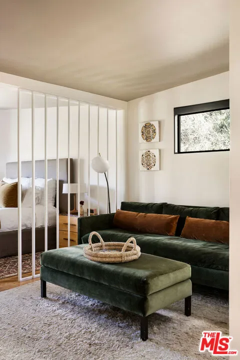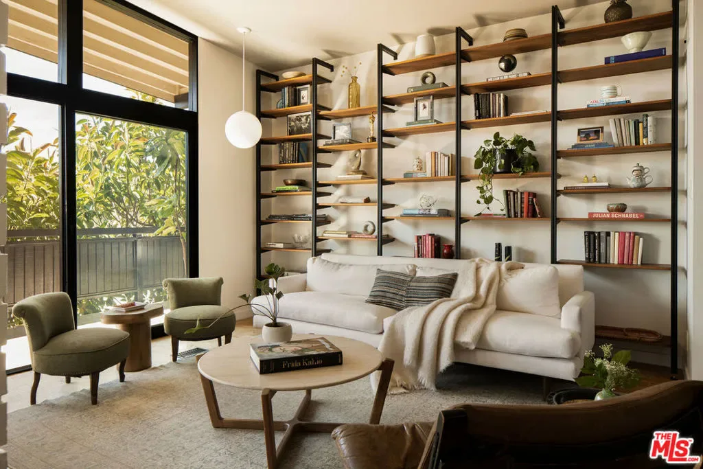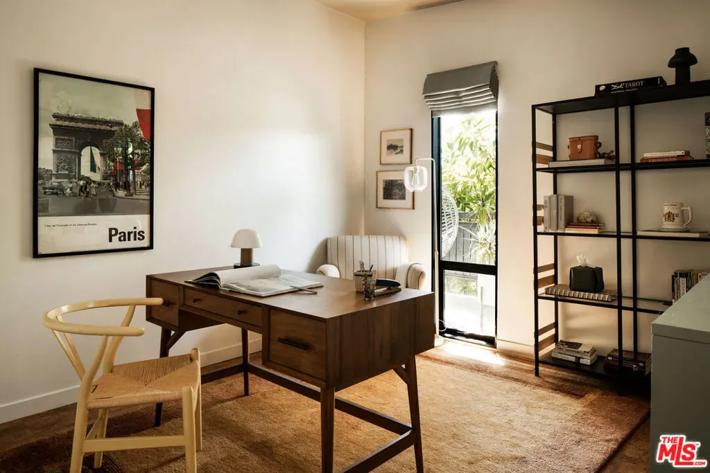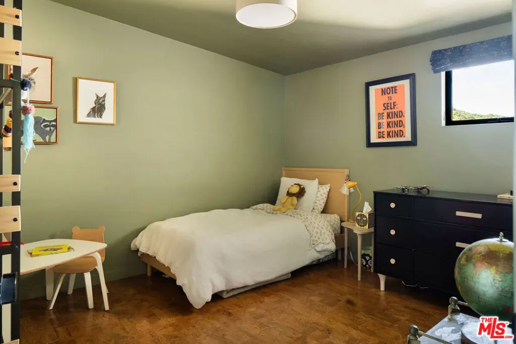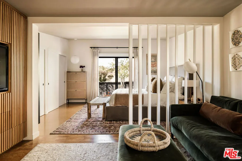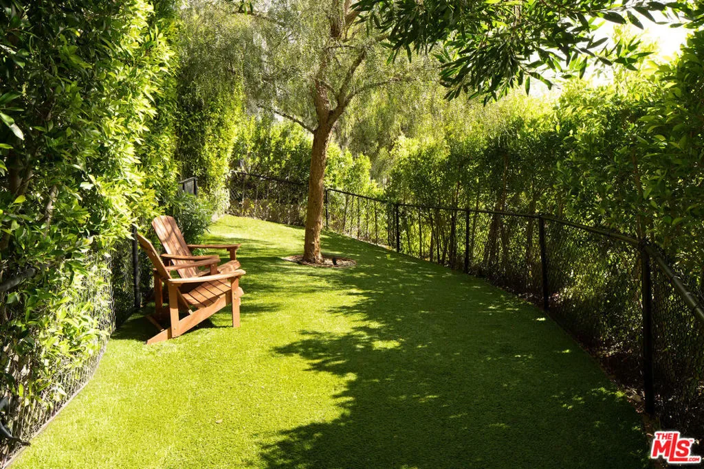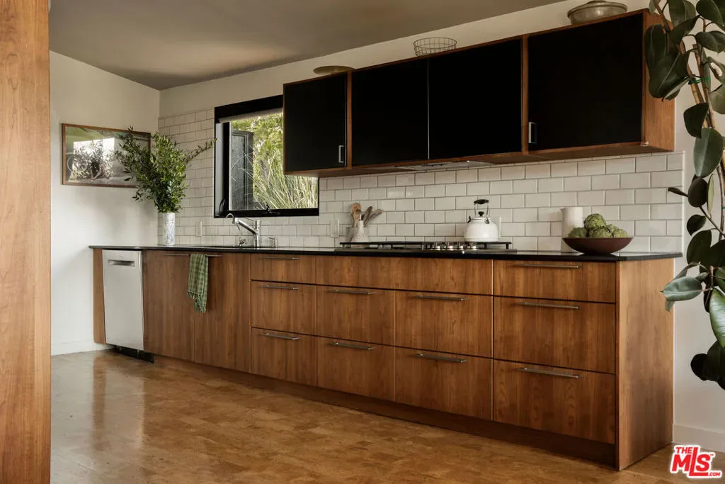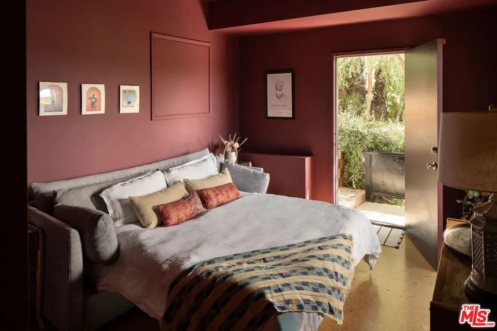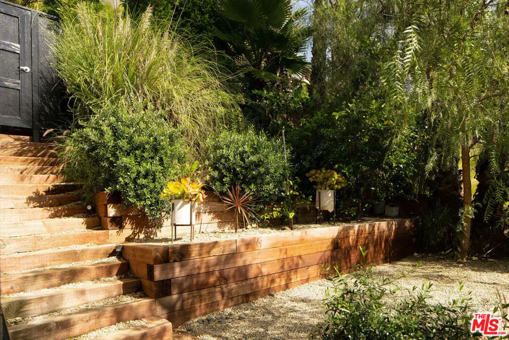 Located in Nichols Canyon with breathtaking hillside views, this 1960 post and beam home has been expertly renovated and restored by Chris Salay, and sits on a fully gated and fenced corner lot, landscaped to perfection. The home features 3 bedrooms, 2 full bathrooms, a detached lower studio with its own full bathroom, and 510 square feet of finished storage space. Set just below the iconic Lautner Garcia House, the home’s architectural elements include dramatic pitched ceilings, imported cork flooring, terrazzo-tiled bathrooms, custom-built-ins throughout, and floor-to-ceiling windows in the main living space that frame wide mountain vistas. Private, serene, and impeccably designed, the home offers idyllic canyon living. Beyond the secure front gate, the home opens to reveal its classic post and beam structure on full display. Striking vaulted ceilings and floor-to-ceiling windows with windowed doors lead to a long upper deck with unobstructed, panoramic hillside views. A center brick fireplace anchors the main living space, separating the dining area from the formal living room. The living room and adjacent den offer separate areas for hosting and relaxation, both with custom built-in shelving. The kitchen features custom-built dark wood cabinetry that complements the home’s architectural style. The top-of-the-line appliance suite includes a Sub-Zero refrigerator, a Thermador beverage column, Bosch dishwasher, and a Dacor gas range. Three bedrooms and two full bathrooms are situated down the hallway. The primary suite feels like its own wing, complete with a sitting area, custom fluted-wood built-ins, and sliding doors that open to a private deck with hillside views and a coveted peek at the Garcia House. The ensuite bath layers imported terrazzo flooring with Rosso marble tile, dual sinks, a soaking tub, and a shower. Two additional bedrooms share a bathroom finished with imported terrazzo floors, marble tile, Walnut wallpaper, and a custom wood vanity – equal parts playful and polished. Downstairs, a fully detached, oxblood-drenched studio – the paint color selected by AD100 interior designer Jake Arnold – features imported cork flooring and its own bathroom, offering a versatile space as guest quarters, office, gym, or screening room. An adjacent expansive storage area adds an exceptional amount of storage rarely found in homes in this area. The terraced, street-to-street lot, landscaped by Andrea Scharff, unfolds with citrus trees, a fully fenced yard, walking paths, and a large grassy area for recreation and play. An attached two-car garage with EV charger completes the lower level. Upgrades include Nest thermostats, a newer Miele washer and dryer, an ultra-pure alkaline drinking water system, custom Mod Barn built-in cabinetry and closets, Nest security cameras, Aiphone video intercom, reinforced balcony support, and newly installed landscape lighting – thoughtful enhancements that support the architecture without distracting from it. Just moments from Runyon Canyon and minutes to Hollywood, West Hollywood, and Studio City, this gated mid-century retreat offers privacy, provenance, and that unparalleled Nichols Canyon ease of living – a true refuge in the heart of Los Angeles.