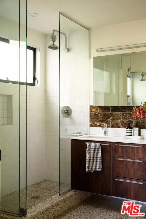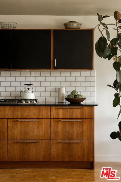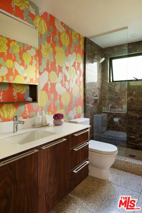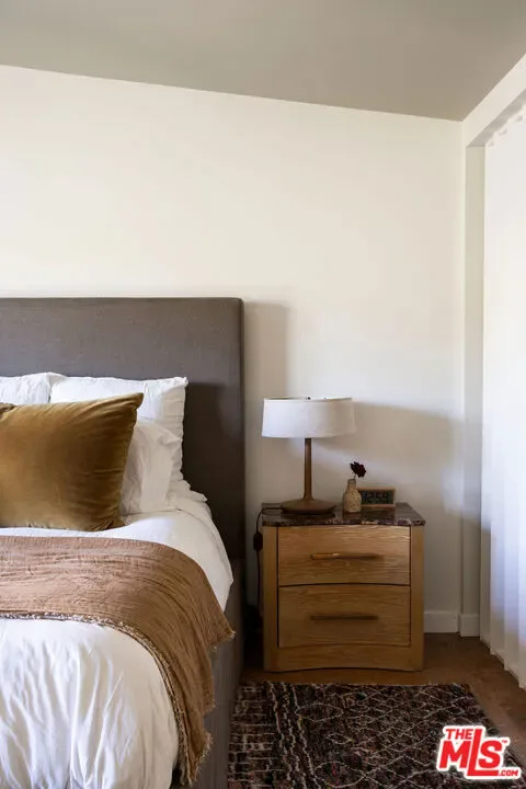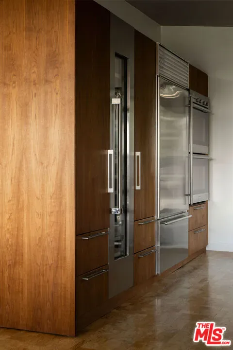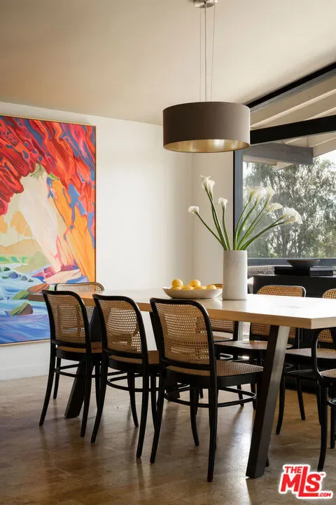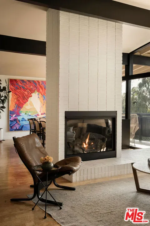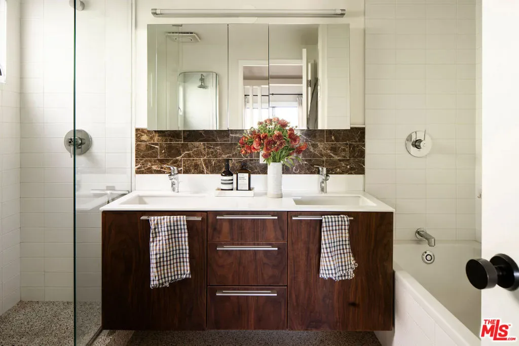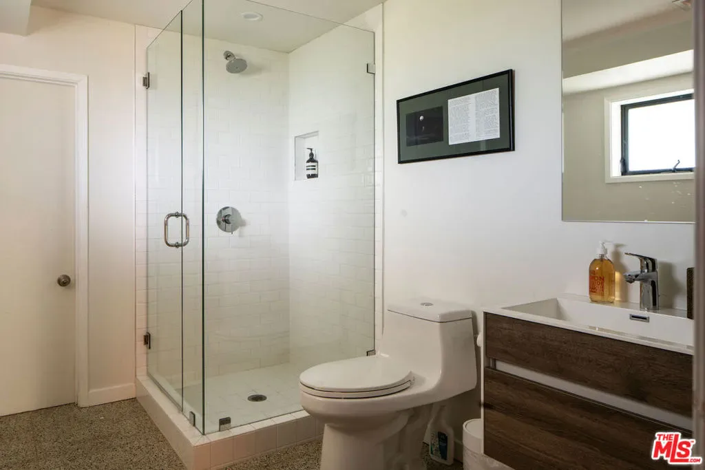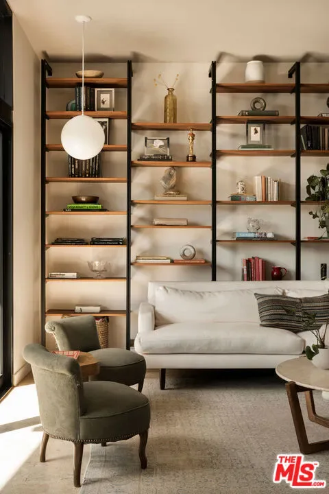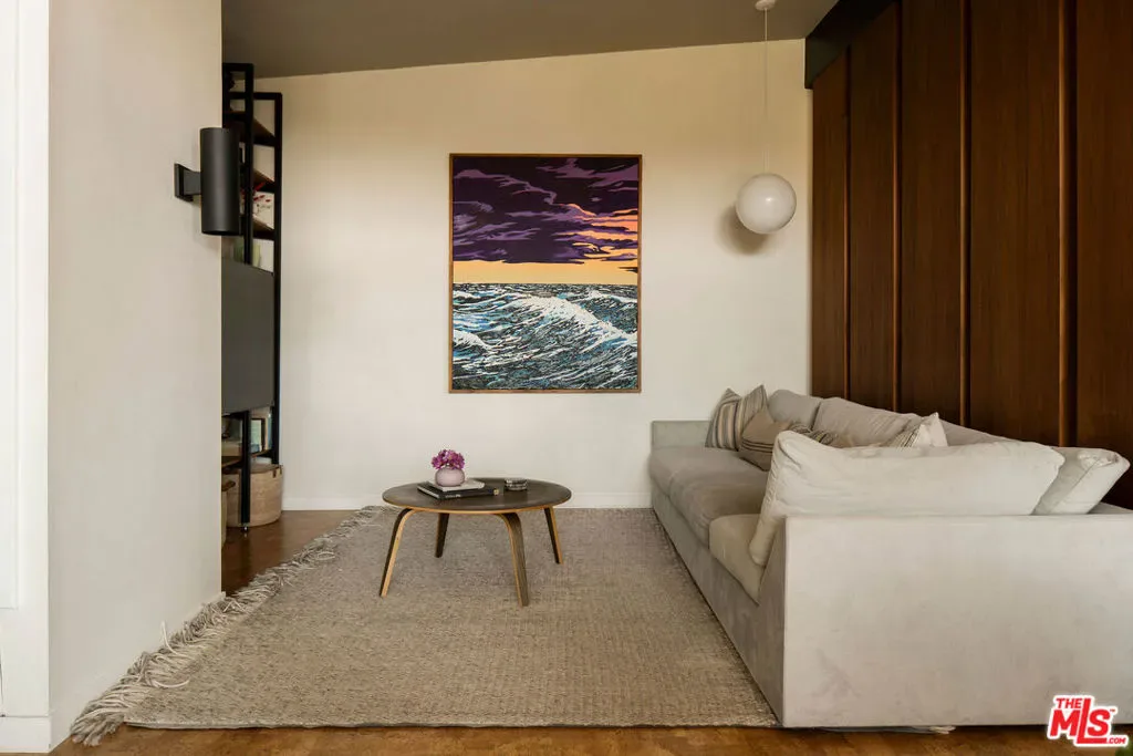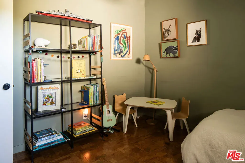 Located in Nichols Canyon with breathtaking hillside views, this 1960 post and beam home has been expertly renovated and restored by Chris Salay, and sits on a fully gated and fenced corner lot, landscaped to perfection. The home features 3 bedrooms, 2 full bathrooms, a detached lower studio with its own full bathroom, and 510 square feet of finished storage space. Set just below the iconic Lautner Garcia House, the home’s architectural elements include dramatic pitched ceilings, imported cork flooring, terrazzo-tiled bathrooms, custom-built-ins throughout, and floor-to-ceiling windows in the main living space that frame wide mountain vistas. Private, serene, and impeccably designed, the home offers idyllic canyon living. Beyond the secure front gate, the home opens to reveal its classic post and beam structure on full display. Striking vaulted ceilings and floor-to-ceiling windows with windowed doors lead to a long upper deck with unobstructed, panoramic hillside views. A center brick fireplace anchors the main living space, separating the dining area from the formal living room. The living room and adjacent den offer separate areas for hosting and relaxation, both with custom built-in shelving. The kitchen features custom-built dark wood cabinetry that complements the home’s architectural style. The top-of-the-line appliance suite includes a Sub-Zero refrigerator, a Thermador beverage column, Bosch dishwasher, and a Dacor gas range. Three bedrooms and two full bathrooms are situated down the hallway. The primary suite feels like its own wing, complete with a sitting area, custom fluted-wood built-ins, and sliding doors that open to a private deck with hillside views and a coveted peek at the Garcia House. The ensuite bath layers imported terrazzo flooring with Rosso marble tile, dual sinks, a soaking tub, and a shower. Two additional bedrooms share a bathroom finished with imported terrazzo floors, marble tile, Walnut wallpaper, and a custom wood vanity – equal parts playful and polished. Downstairs, a fully detached, oxblood-drenched studio – the paint color selected by AD100 interior designer Jake Arnold – features imported cork flooring and its own bathroom, offering a versatile space as guest quarters, office, gym, or screening room. An adjacent expansive storage area adds an exceptional amount of storage rarely found in homes in this area. The terraced, street-to-street lot, landscaped by Andrea Scharff, unfolds with citrus trees, a fully fenced yard, walking paths, and a large grassy area for recreation and play. An attached two-car garage with EV charger completes the lower level. Upgrades include Nest thermostats, a newer Miele washer and dryer, an ultra-pure alkaline drinking water system, custom Mod Barn built-in cabinetry and closets, Nest security cameras, Aiphone video intercom, reinforced balcony support, and newly installed landscape lighting – thoughtful enhancements that support the architecture without distracting from it. Just moments from Runyon Canyon and minutes to Hollywood, West Hollywood, and Studio City, this gated mid-century retreat offers privacy, provenance, and that unparalleled Nichols Canyon ease of living – a true refuge in the heart of Los Angeles.