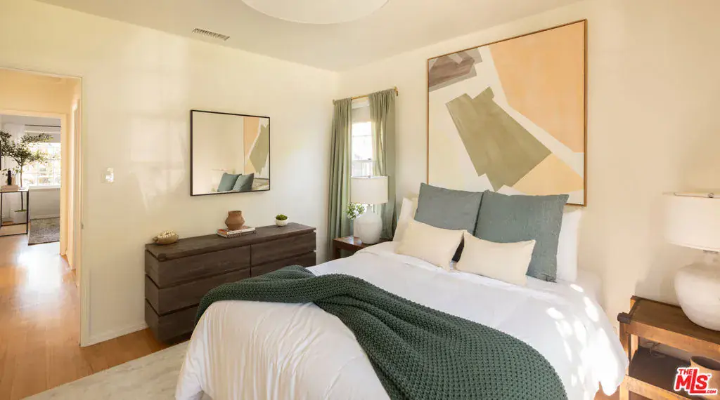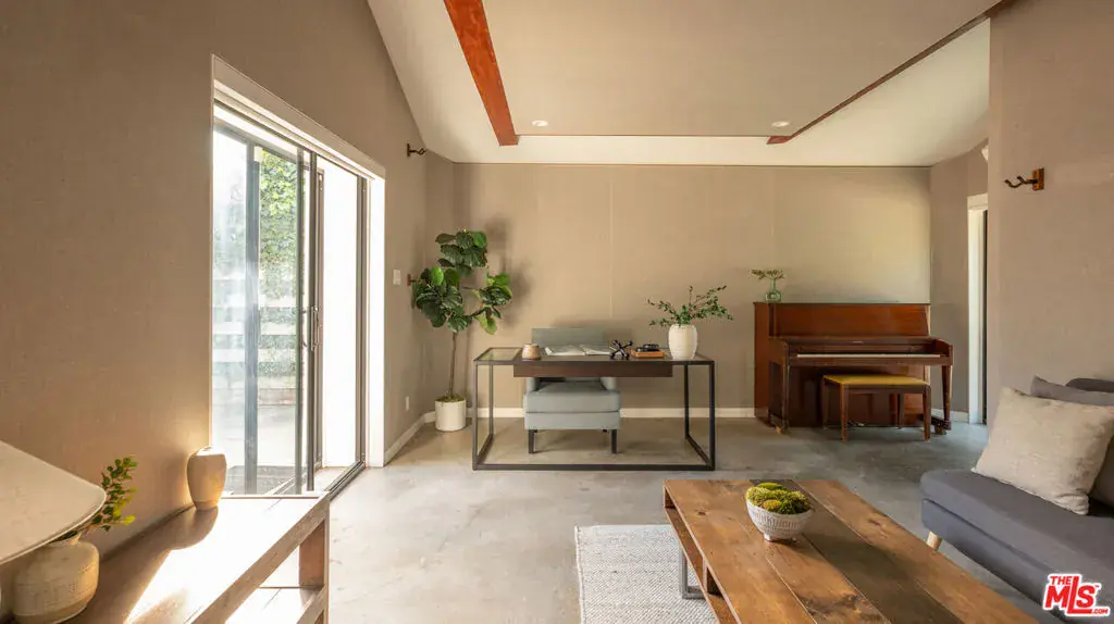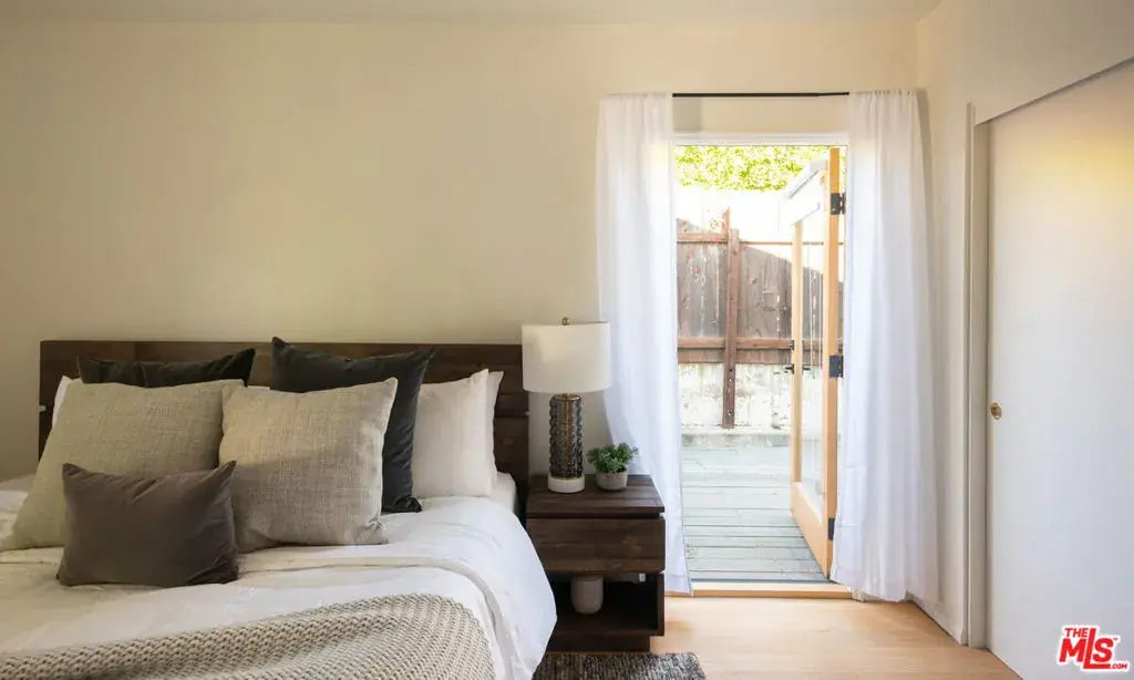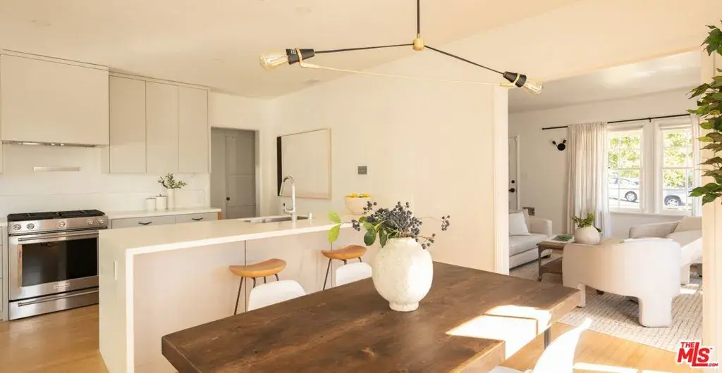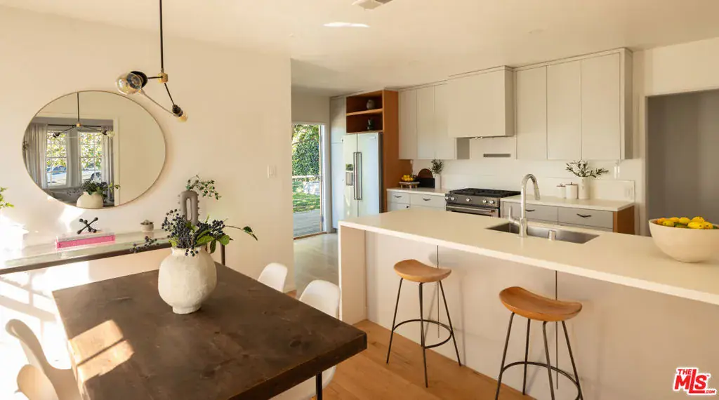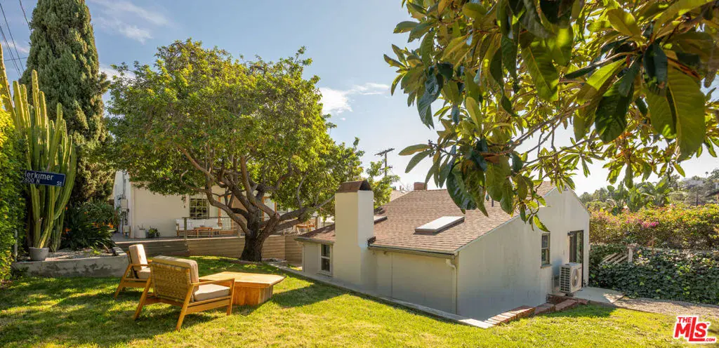 Tucked on a leafy stretch of Herkimer Street, this 1940s Silver Lake bungalow blends classic character with thoughtful modern updates. A bright living room with a decorative fireplace and hardwood floors flows into an open kitchen and dining area featuring custom cabinetry, a generous island, KitchenAid appliances, and designer lighting. Two light-filled bedrooms and an updated bath are complemented by a dedicated laundry area and an additional powder room for everyday convenience. Enjoy al-fresco dining on a wraparound deck, which offers multiple spaces for lounging and dining and transitions to a spacious, tree-filled yard. At the rear, a bonus detached studio with a 3/4 bath adds exceptional flexibility. Previously used as a sound-treated music studio, it’s well-suited for creative work, recording/editing, a home office, fitness, or guest use. Conveniently located near Ivanhoe Elementary School and Silver Lake’s popular shops, dining, and daily essentials.