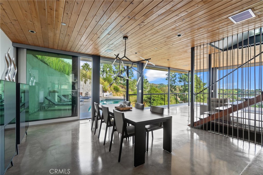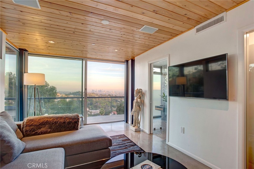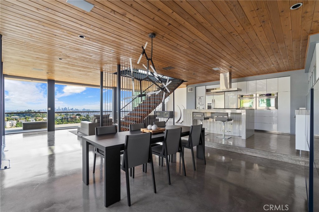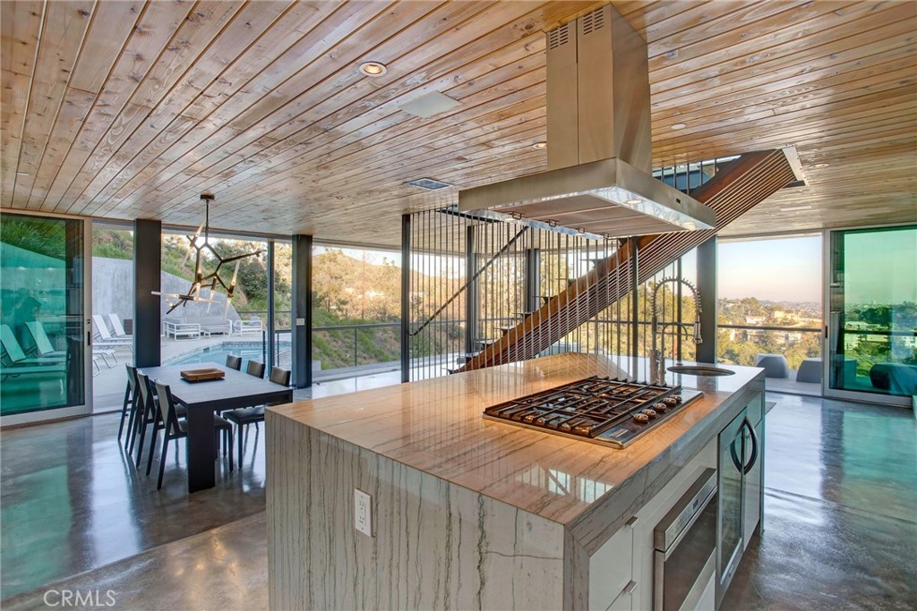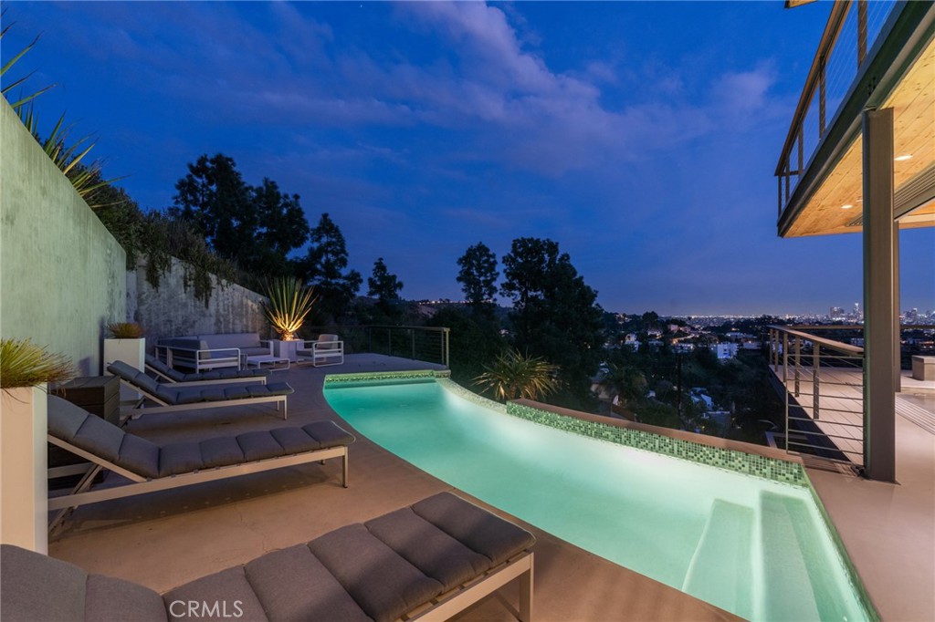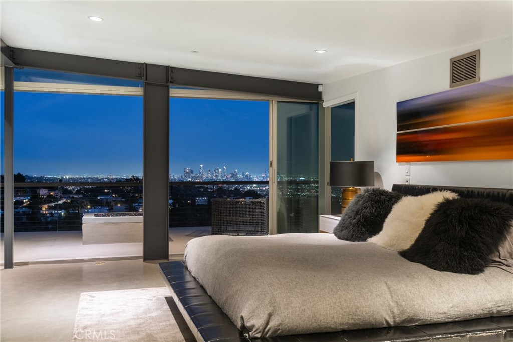 On the main living level and within the primary suite, floor-to-ceiling glass doors retract seamlessly from the corner, dissolving the boundary between interior and exterior and allowing the home to fully open to the surrounding skyline. An infinity-edge pool on the main level steps away from the living room appears to merge directly with the city beyond, anchoring an entertainer’s setting that feels suspended above Los Angeles.