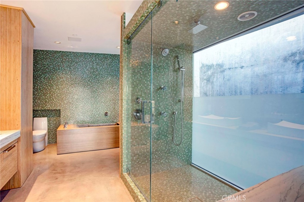 Refined modern comforts include a gas fireplace, instant hot water in the kitchen, a glass-enclosed shower with direct city views, and a spa-like primary suite featuring a steam shower and Japanese soaking tub—creating a private retreat framed by dramatic city views.