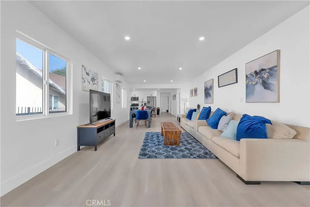 Open-concept living/dining area with minimalist furnishings, polished wood-style flooring, and abundant natural light.