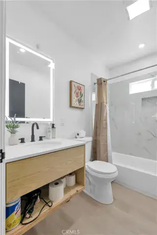 Three full bathrooms featuring clean, contemporary finishes, including frameless glass showers and modern fixtures.