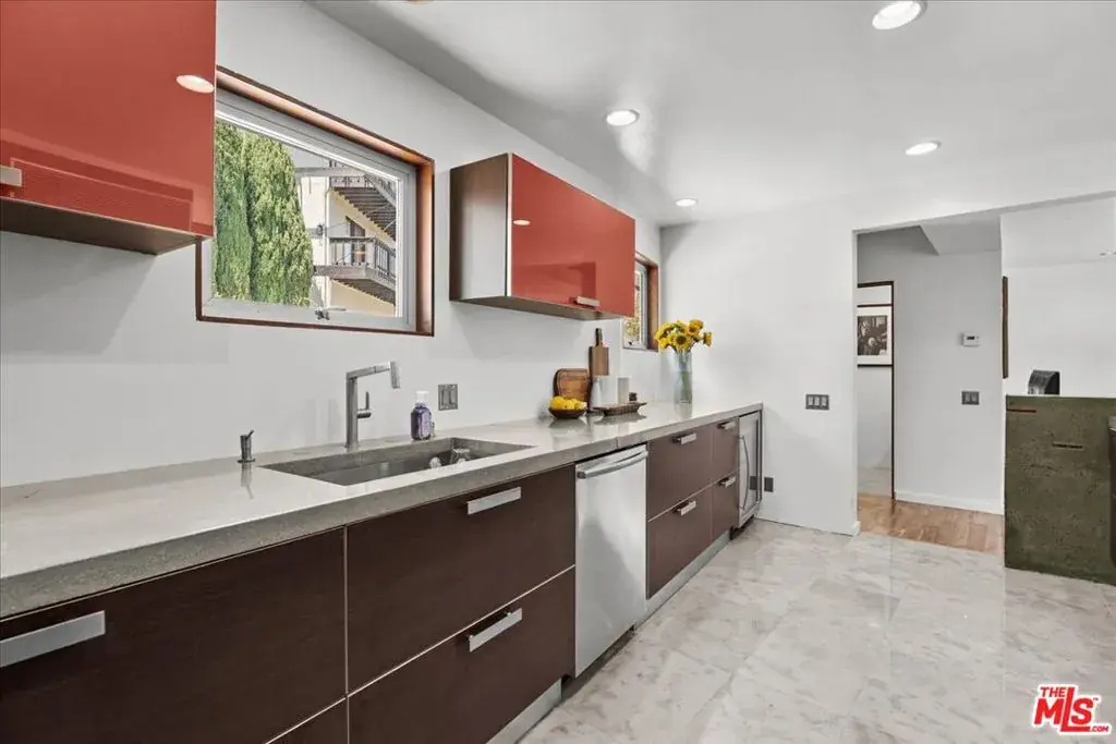 This sleek modern treehouse floats beside a majestic pine tree capturing serene hillside views in the coveted Hollywood Manor enclave. Sunlight pours into the open-concept main level where living, dining and kitchen spaces flow seamlessly around an elegant fireplace ~ an inviting setting for both unwinding and entertaining. Rich walnut hardwood floors, high-end windows and doors & organic, thoughtfully curated finishes throughout create an immediate sense of calm with a distinctly hip vibe. Expansive sliding glass doors open to a private balcony perfect for savoring quiet sunrises solo or soaking in the golden-hour light with friends. The chef’s kitchen blends polished concrete counters with top-tier stainless steel appliances, a beverage fridge, and striking Italian-designed cabinetry for an effortless, functional & stylish aesthetic. Upstairs, three light-filled bedrooms share a cheerful mid-century bath adorned with sculptural vintage tile for a subtle touch of nostalgia. A second balcony offers an elevated vantage point over the charming neighborhood nearby the best of Hollywood including Universal and Warner Bros. Studios, the Hollywood Bowl, Lake Hollywood and Griffith Park. An attached two-car garage with EV charger provides direct interior access after a quick run down to the Toluca Lake Village. Recent upgrades include a newer roof, water heater, main sewer line & solar panels ~ making this cool modern nest plug & play ready.