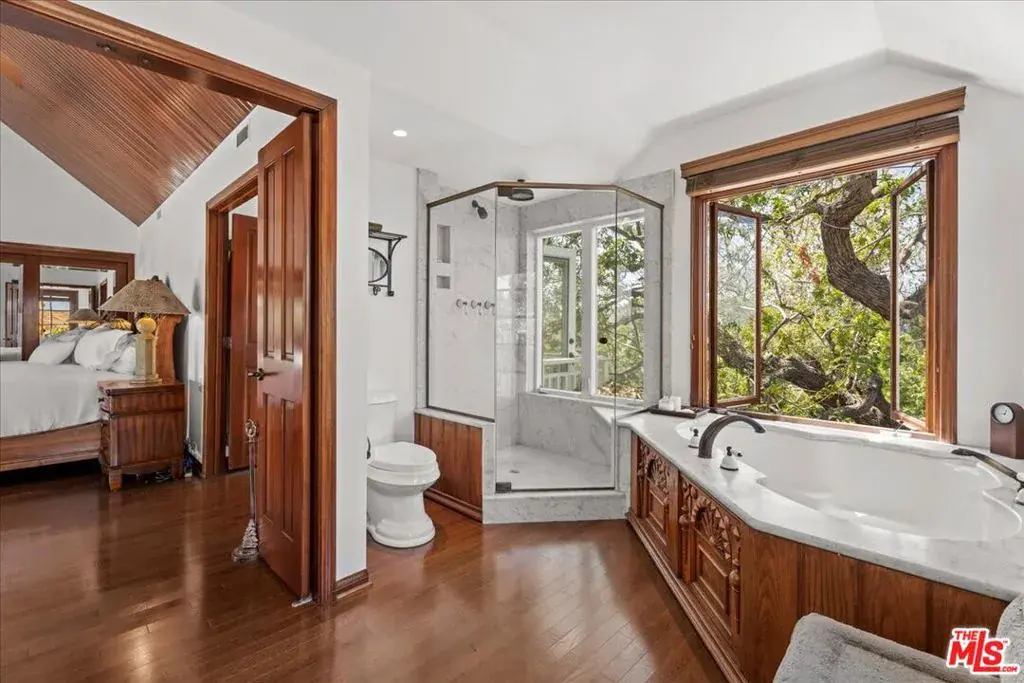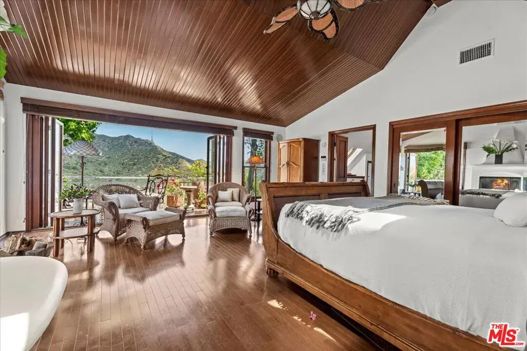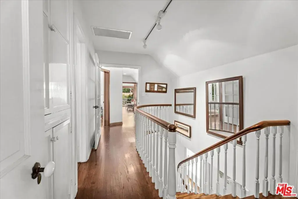 Up a private drive, this warm & inviting classic two-story home resides on a generous, flat parcel in an exclusive, park-like setting above the Lake Hollywood Reservoir. Cherished by the same meticulous owners for more than 40 years, the property offers a rare combination of privacy, space & a connection to nature from a remarkably convenient location. Filled with natural light, the interiors convey a timeless sensibility through polished hardwood floors and classic crown moldings while French doors and windows welcome in sunshine & fresh afternoon breezes. Mature landscaping and lush greenery frame a series of outdoor spaces equally suited for quiet reflection or large-scale entertaining. Mornings begin on the primary suite balcony as the sun rises over Griffith Park and the city skyline, illuminating the Hollywood Sign and Griffith Park Observatory while deer occasionally graze on the open pasture below. Evenings unwind on the charming brick patio surrounding the sun-drenched pool where sunsets soften into the silhouette of the Hollywood Hills. The main level features a grand living room with fireplace, a formal dining room, a cheerful eat-in kitchen with ample counter space and a paneled den or optional fourth bedroom with its own fireplace. Upstairs, the home offers a spacious second bedroom with built-ins, a vintage-tiled bath, a third en-suite bedroom with balcony, and a sumptuous primary suite with soaring pitched ceilings, fireplace, walk-in closet, spa-like bath and a balcony that captures those sweeping views. A separate storage room with its own entrance off the attached two-car garage offers flexibility as a home office or gym. With a daily rhythm that feels remarkably peaceful and restorative, it’s easy to forget that major studios, Hollywood, and downtown Los Angeles are just minutes away.