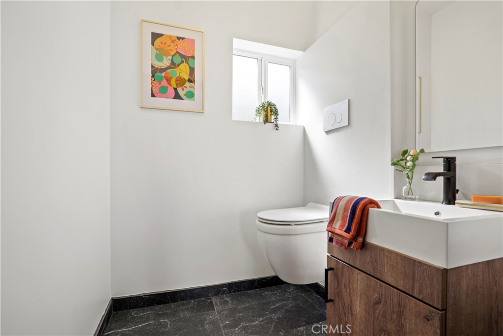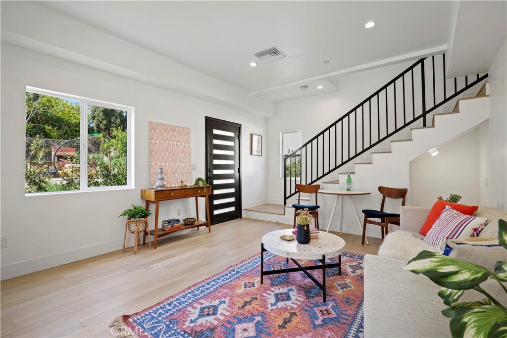 The newly reconstructed main residence features 1,563 square feet of modern designer living space, a bright open floor plan, three bedrooms, and four bathrooms. Inside, discover high ceilings, light oakwood flooring, and a chic open kitchen with gray cabinetry and stainless steel appliances. Each bedroom is en-suite, including a lavish primary suite with a generously sized private terrace on the second level. Additionally, a flexible lower-level space and inviting dining patio enhance the living experience.