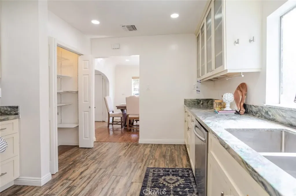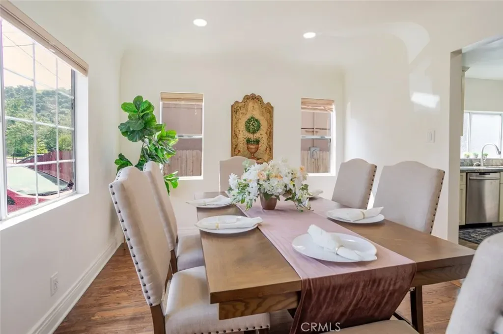 The interior showcases rich wood flooring, recessed lighting, and an open, airy layout that flows seamlessly from the living and dining areas. The upgraded kitchen features stainless steel appliances, sleek cabinetry, and stylish countertops, creating a functional and elegant space perfect for everyday living and entertaining.