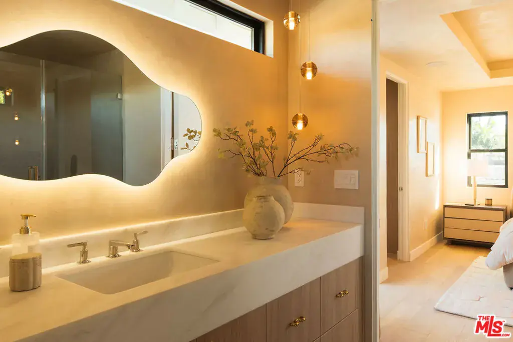 Welcome to 3444 Redwood Avenue — set behind two sculptural, mature trees framed by custom front planters on a generous corner lot in the coveted Mar Vista Wood Streets, this meticulously restored residence by A FRAME LAB offers a rare blend of architectural calm and artisanal detail where coastal breezes drift easily through light-filled interiors. A charming deck wrapped in redwood siding introduces serene spaces where every element has been thoughtfully curated. The main level opens with a sunlit living room and flows into a flexible downstairs bedroom. The moody powder room features a cleverly concealed shower, handmade tile, Spanish porcelain, Roman Clay walls, and custom-selected hardware that underscores the home’s craftsmanship-first approach. At the heart of the home, a striking kitchen and den anchor everyday living. The kitchen is centered around a dramatic Bianco Rhino Italian marble island with waterfall edge and is outfitted with a Wolf oven, Fisher & Paykel refrigerator, built-in Reverse Osmosis water system, and bespoke hardware selections throughout. An adjacent den with built-in desk provides a warm, functional space for work or retreat. Oversized sliding doors open seamlessly to a newly completed backyard designed for effortless indoor-outdoor living. Lush, thoughtfully designed planting, enclosed by a tall, completely private fence, surrounds a brand-new pool and spa with integrated pool cover, redwood-clad patio, and a built-in BBQ with sink and refrigerator creating a private, tranquil setting ideal for entertaining or quiet daily enjoyment. Upstairs, the primary suite is a Roman Clay-drenched private sanctuary with a fireplace, lofted ceilings, walk-in closet, expansive balcony, and an oversized spa-like bathroom illuminated by custom lighting and refined finishes. Also on the upper level is a second bedroom, drenched in natural light, with its own en suite bath. Design-forward lighting by Noguchi Akari, Soho Home, Plato Design, In Common With, Santa & Cole, and Bocci is layered throughout the home, complemented by curated Watermark Brooklyn fixtures and handcrafted material selections. As part of the restoration, the home includes all-new windows, doors, HVAC, and a fully integrated smart-home system with security cameras, indoor/outdoor speakers, and a universal Tesla electric car charger. Completing the property is a fully detached and permitted 1-bedroom, 1-bath ADU with its own full kitchen, laundry, and Watermark finishesoffering meaningful income potential, guest accommodations, or flexible living options without compromise. Ideally located just blocks from Beethoven Market, Bluey’s, and Penmar Golf Course, and moments from the best of Venice and Ocean Park, the home is also situated within the coveted Walgrove Avenue Elementary School district. A turnkey, design-driven coastal compound delivering craftsmanship, privacy, walkability, and a rare built-in value add in one of Mar Vista’s most sought-after neighborhoods.
