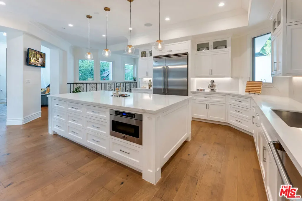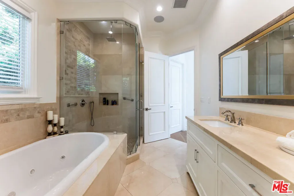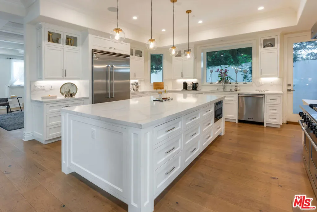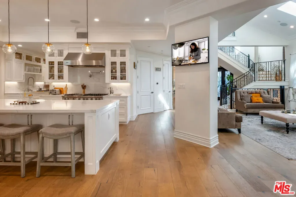 Wonderful opportunity to live in Brentwood on the most walkable street! This Mediterranean home is newer – 3 levels, huge entry, open floorplan, large kitchen with center island and separate “cooks kitchen area”. Family room with French doors opening to yard. Formal dining room and guest suite on main level. Upstairs is a large primary suite with large bathroom and dual closets. There are 3 additional ensuite bedrooms all high ceilings and wood floors throughout. The lower level has a theatre and family room and 2 additional bedrooms ensuite (could be a gym) and laundry is located there. The yard accommodates outdoor dining, a basketball area and a small office or additional storage. The home is gated with a 3 car garage and plenty of parking. Enjoy all the amazing cafes and restaurants along San Vicente as well.