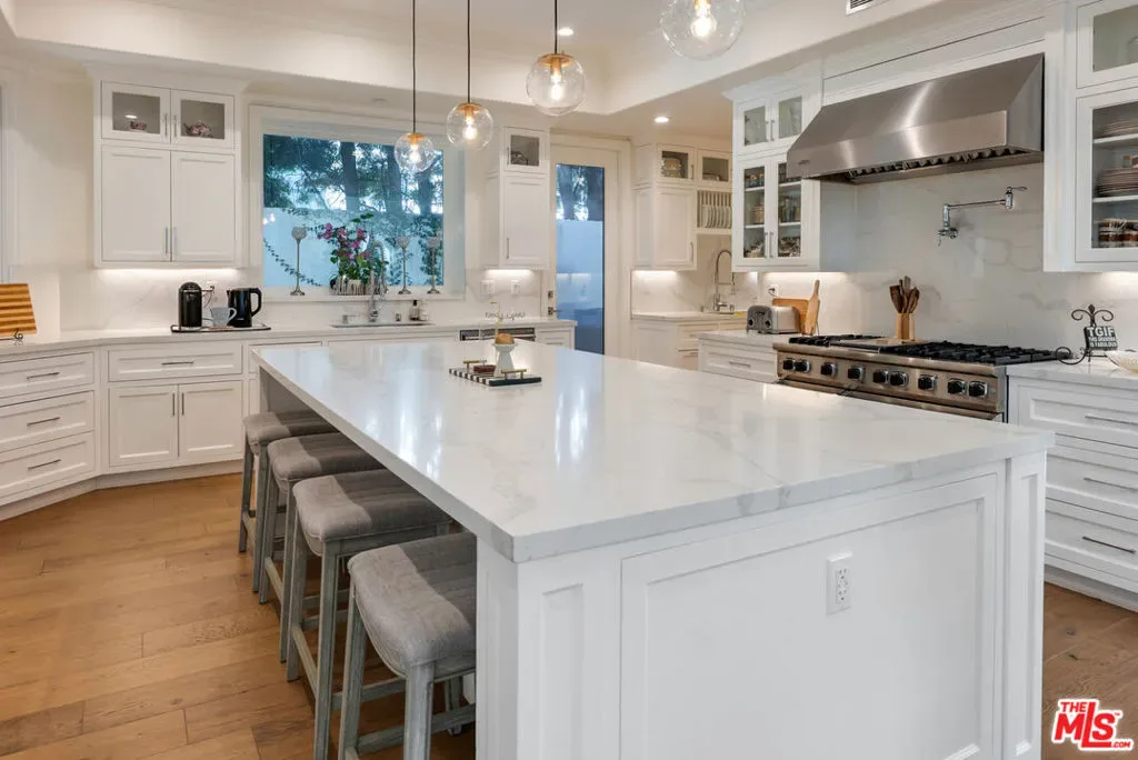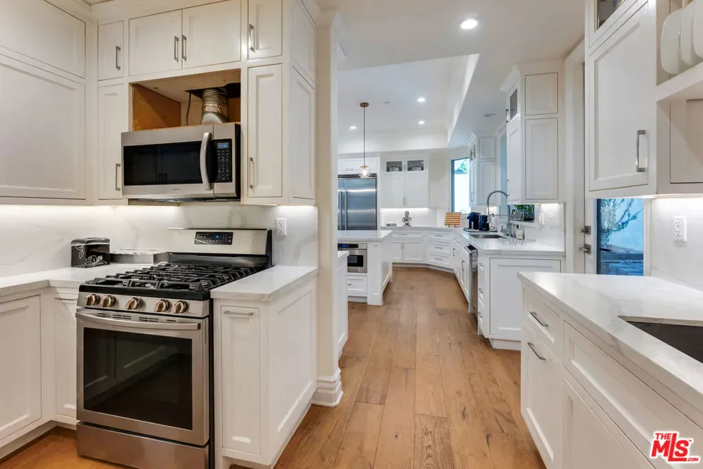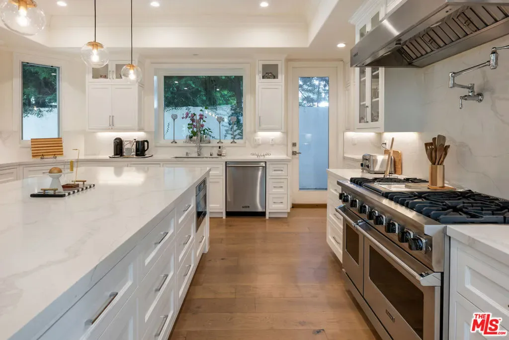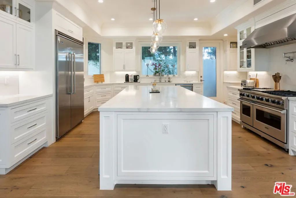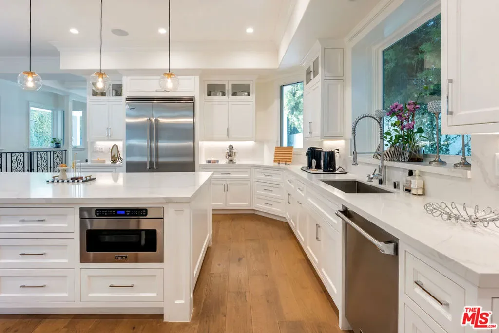 Wonderful opportunity to live in Brentwood on the most walkable street! This Mediterranean home is newer – 3 levels, huge entry, open floorplan, large kitchen with center island and separate “cooks kitchen area”. Family room with French doors opening to yard. Formal dining room and guest suite on main level. Upstairs is a large primary suite with large bathroom and dual closets. There are 3 additional ensuite bedrooms all high ceilings and wood floors throughout. The lower level has a theatre and family room and 2 additional bedrooms ensuite (could be a gym) and laundry is located there. The yard accommodates outdoor dining, a basketball area and a small office or additional storage. The home is gated with a 3 car garage and plenty of parking. Enjoy all the amazing cafes and restaurants along San Vicente as well.
