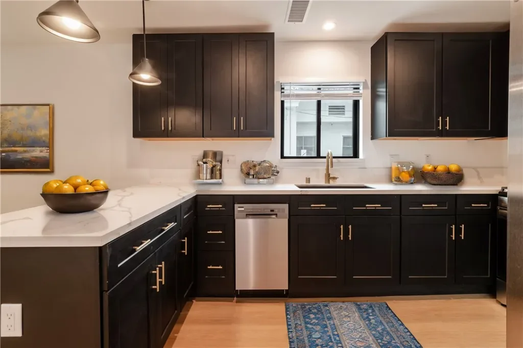 Finishes: Matte black shaker cabinets, quartz countertops, stainless steel appliances, LVP flooring, new doors, drywall, baseboards paint, and blinds