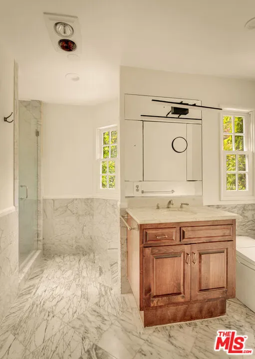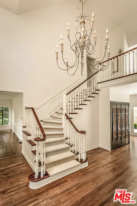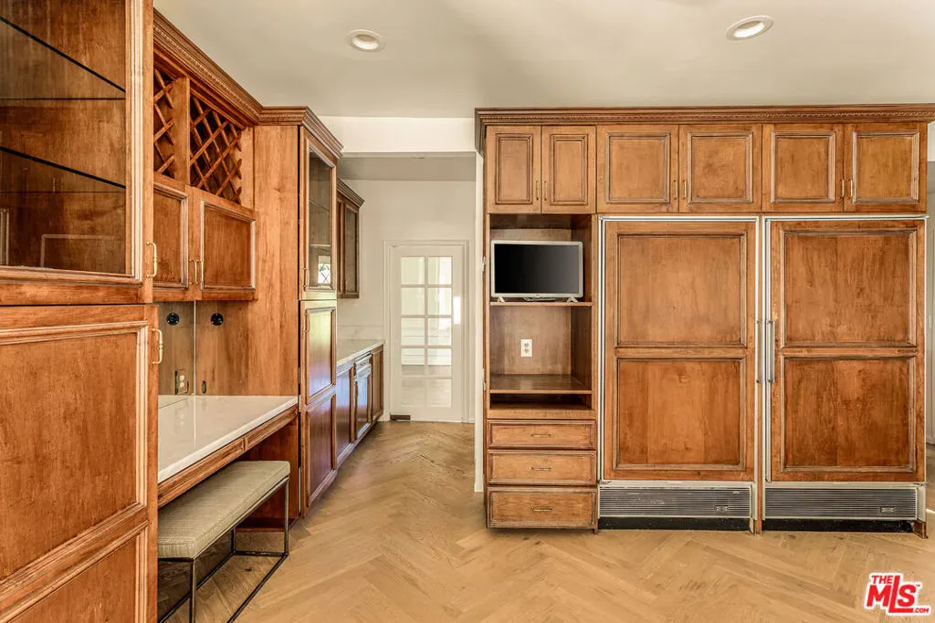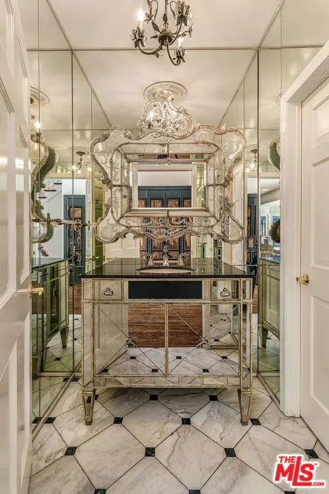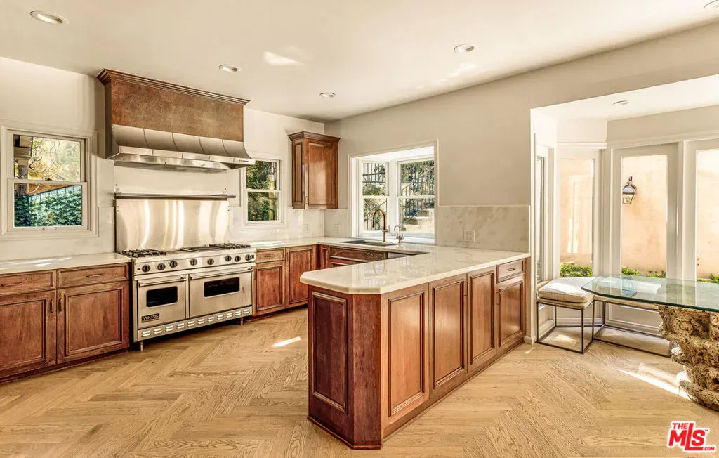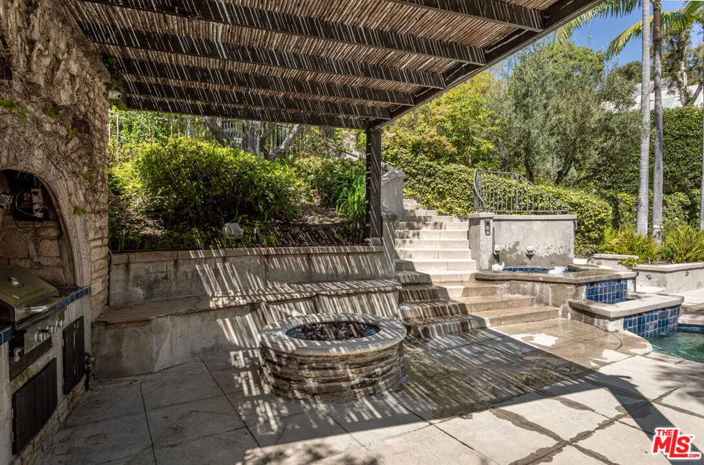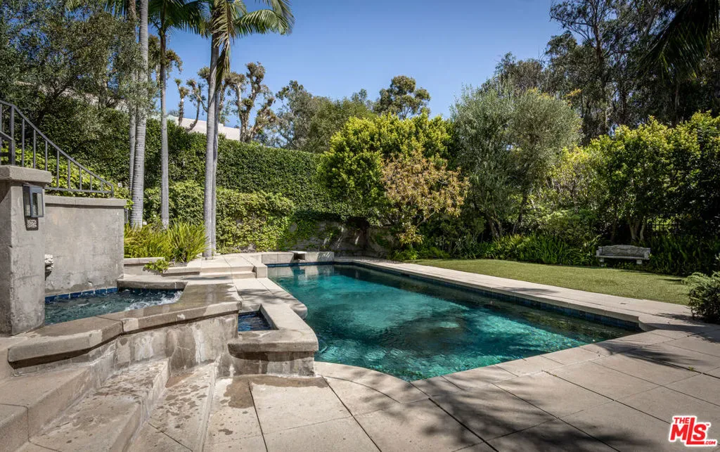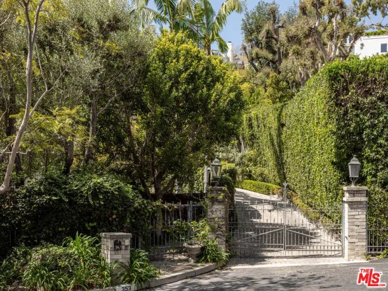 Welcome to 353 North Gunston Drive, ideally situated within the prestigious guard-gated community of Brentwood Circle, where a 24-hour gatehouse provides exceptional privacy and security. Tucked behind its own private gates, the home welcomes you with a spacious motor court accommodating 3+ vehicles, along with a three-car garage and direct access to the property. Upon entry, a gracious foyer with rich hardwood floors sets the tone, flanked by a formal dining room and an elegant living room with a fireplace. Expansive French windows flood the interiors with natural light and frame serene views of lush landscaping and the sparkling pool. The chef’s kitchen is thoughtfully designed with premium appliances, including a dual-drawer refrigerator, four-burner stove with griddle, dishwasher, microwave, and a generous walk-in pantry. A breakfast bar and charming dining nook overlook the backyard, creating a warm and functional gathering space. Adjacent, an oak-paneled den offers a cozy retreat complete with fireplace, bar, and ample seating. The lower level features a private home theater, ideal for movie nights or game-day entertaining along with an additional guest or staff bedroom. Upstairs, the home offers three bedrooms and three bathrooms, including a luxurious primary suite and a refined office/library. The primary suite boasts soaring ceilings, expansive windows with pool views, and a spacious layout designed for relaxation. The spa-inspired bathroom includes dual vanities, a soaking tub, a large walk-in shower with dual shower heads, and an oversized walk-in closet.Two additional en-suite bedrooms provide comfort and privacy for family or guests, each with charming views of the estate. Step outside to your own private oasis, complete with a sparkling pool, fire pit, grill, and multiple areas for outdoor dining and entertaining. A lush lawn and space for a vegetable garden add versatility and charm. Located just moments from Brentwood Village’s shops and restaurants, the property offers effortless access to iconic landmarks like the Getty Center and some of Los Angeles’ most highly acclaimed schools.