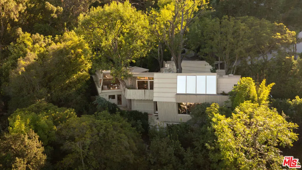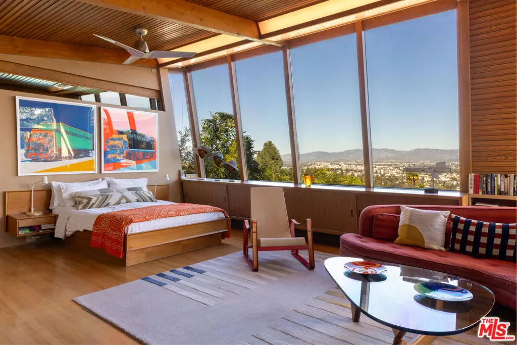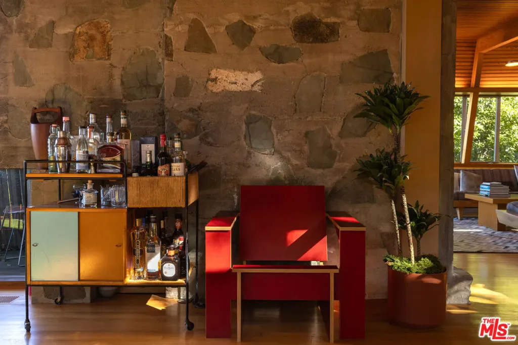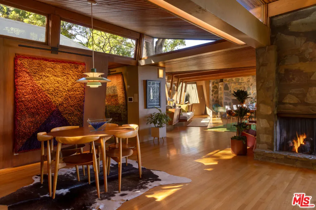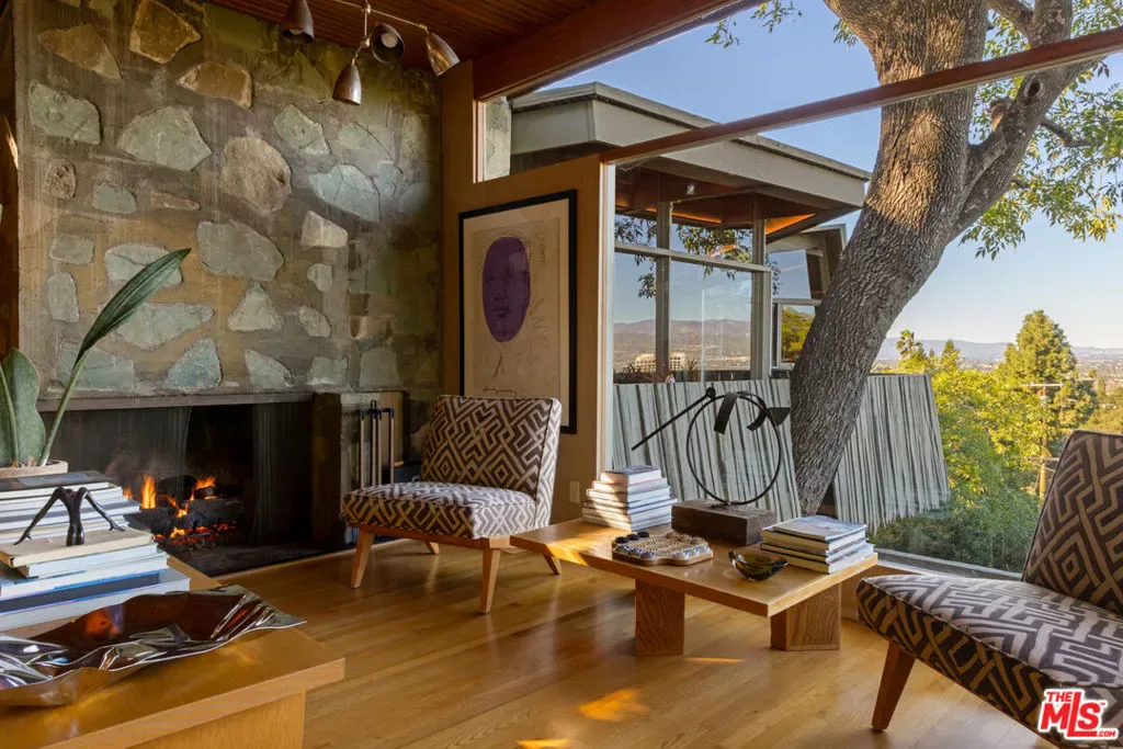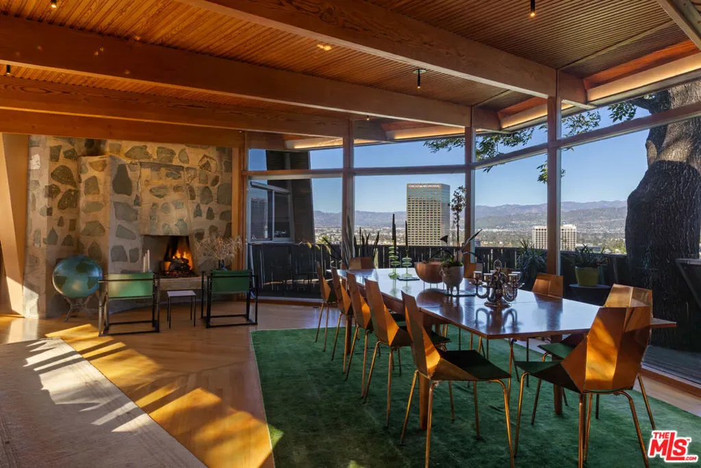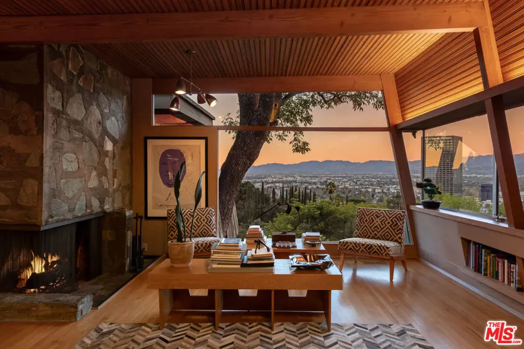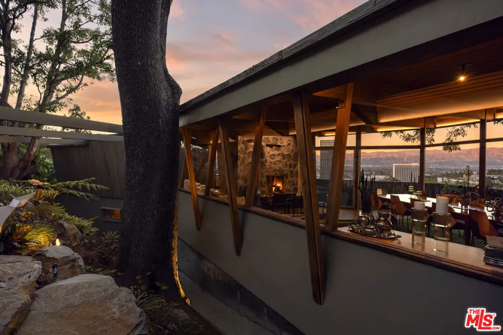 Designed in 1946 by renowned architect Rudolph Schindler, the Kallis-Sharlin Residence is a striking example of site-driven modernism, dramatically set into a steep hillside with expansive views over the San Fernando Valley. Originally built for artist and film art director Mischa Kallis, the home follows the natural contours of the land, with layered volumes, terraces, and walls of glass that connect the interiors to the surrounding landscape. Inside, Schindler’s signature design language is on full display, with unconventional angles, abundant natural light, and a strong sense of flow between spaces. The iconic butterfly roof brings in clerestory light throughout the home, while warm materials – most notably mahogany and Douglas fir walls, ceilings and built-in furniture – add richness and character. Distinctive grape-stake cladding wraps portions of the exterior, allowing the home to blend seamlessly into its wooded setting while enhancing privacy. Additional features include four fireplaces, a spa-like steam shower, a mahogany soaking tub, a glass-enclosed office, climate-controlled basement storage, a rare private bocce court and a swimmers pool and jacuzzi. Designated Los Angeles Historic-Cultural Monument #860, the Kallis-Sharlin Residence underwent a thoughtful, multi-year restoration from 2017-2022 in collaboration with Barbara Bestor and Jeff Fink. The result is a beautifully preserved and highly livable architectural landmark – offering a rare opportunity to own a significant and celebrated piece of Los Angeles design history.