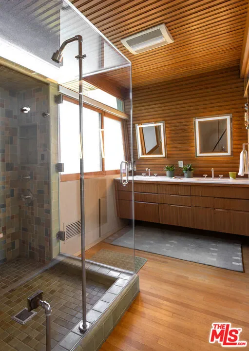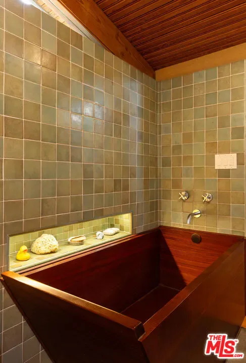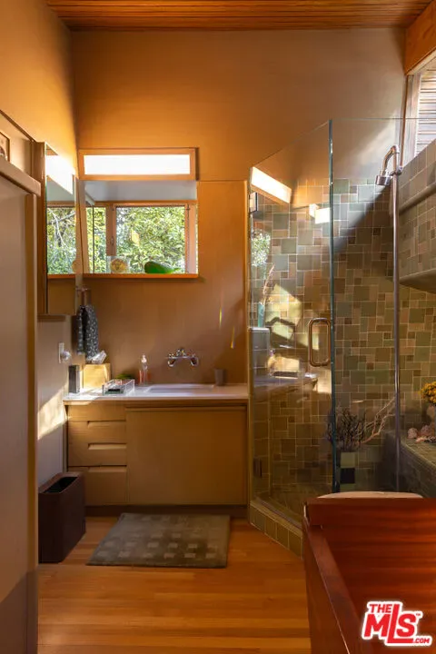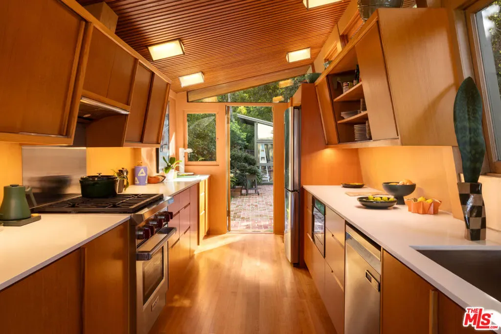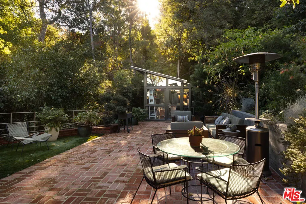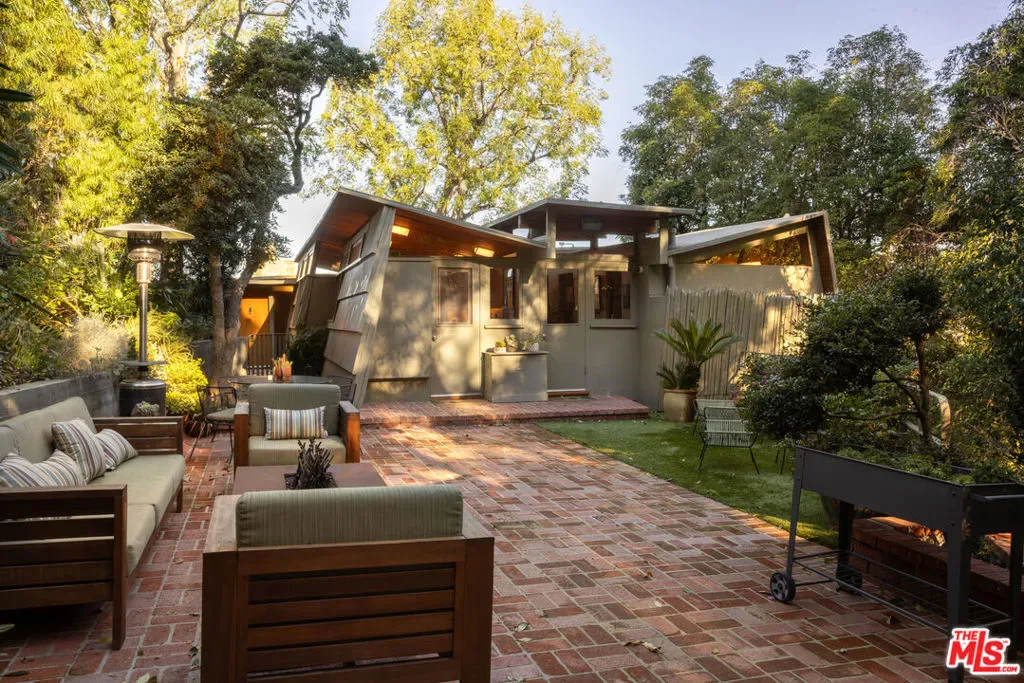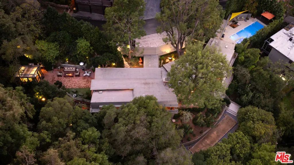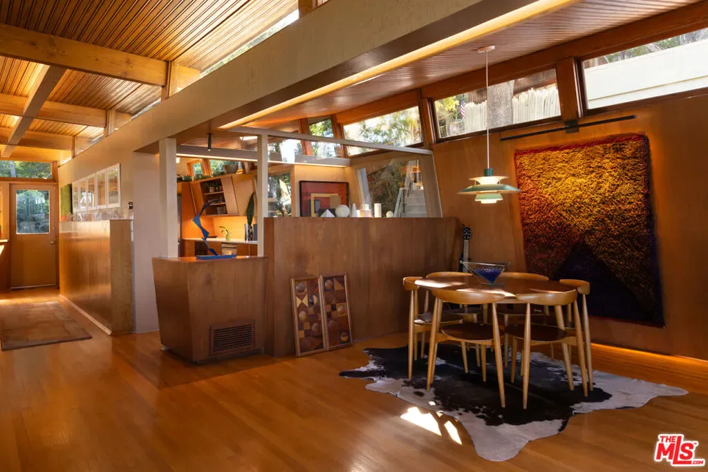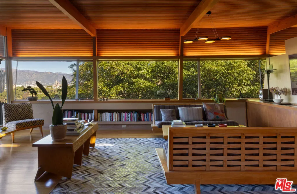 Designed in 1946 by renowned architect Rudolph Schindler, the Kallis-Sharlin Residence is a striking example of site-driven modernism, dramatically set into a steep hillside with expansive views over the San Fernando Valley. Originally built for artist and film art director Mischa Kallis, the home follows the natural contours of the land, with layered volumes, terraces, and walls of glass that connect the interiors to the surrounding landscape. Inside, Schindler’s signature design language is on full display, with unconventional angles, abundant natural light, and a strong sense of flow between spaces. The iconic butterfly roof brings in clerestory light throughout the home, while warm materials – most notably mahogany and Douglas fir walls, ceilings and built-in furniture – add richness and character. Distinctive grape-stake cladding wraps portions of the exterior, allowing the home to blend seamlessly into its wooded setting while enhancing privacy. Additional features include four fireplaces, a spa-like steam shower, a mahogany soaking tub, a glass-enclosed office, climate-controlled basement storage, a rare private bocce court and a swimmers pool and jacuzzi. Designated Los Angeles Historic-Cultural Monument #860, the Kallis-Sharlin Residence underwent a thoughtful, multi-year restoration from 2017-2022 in collaboration with Barbara Bestor and Jeff Fink. The result is a beautifully preserved and highly livable architectural landmark – offering a rare opportunity to own a significant and celebrated piece of Los Angeles design history.