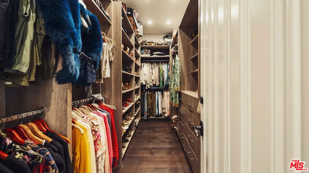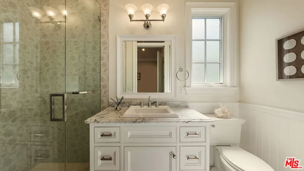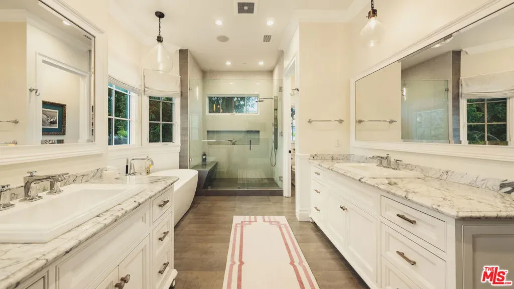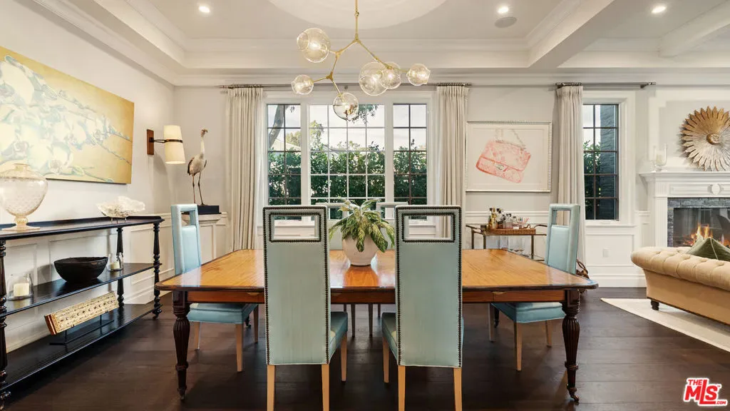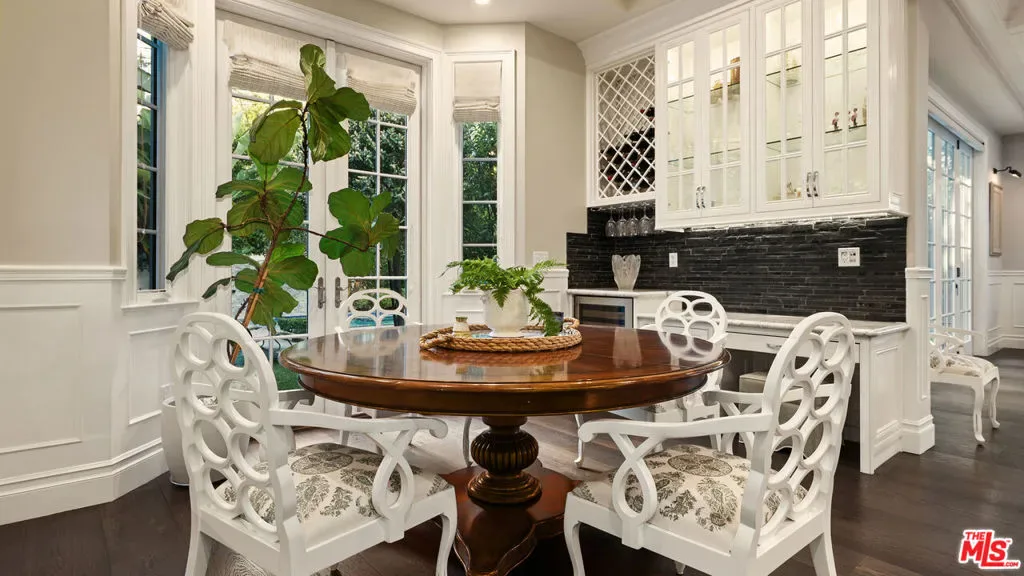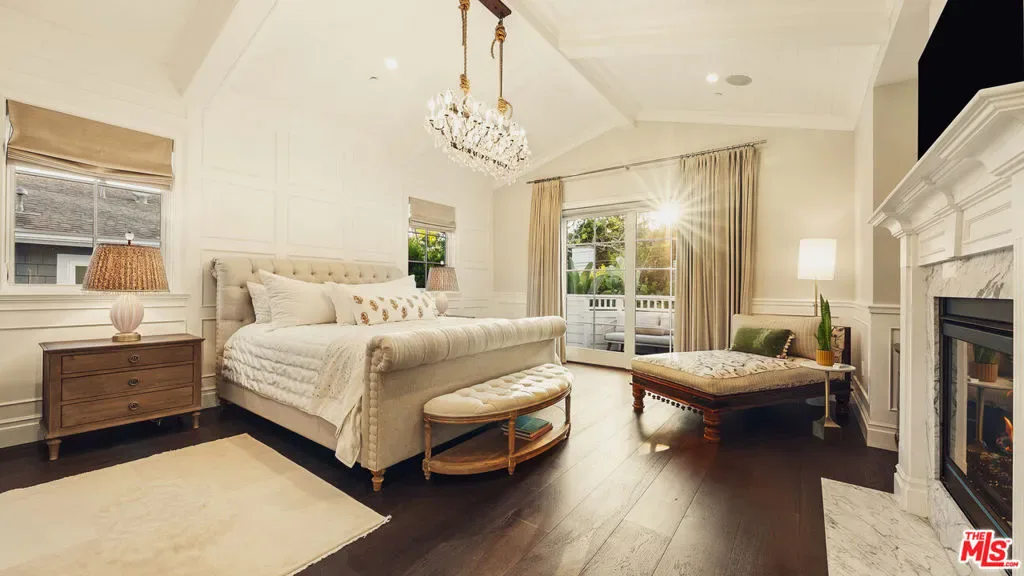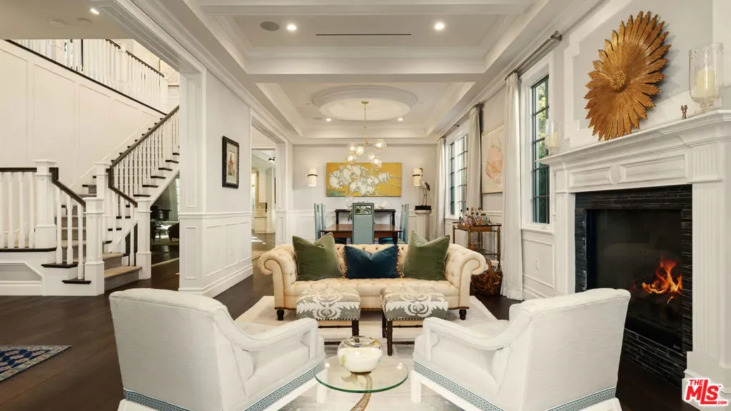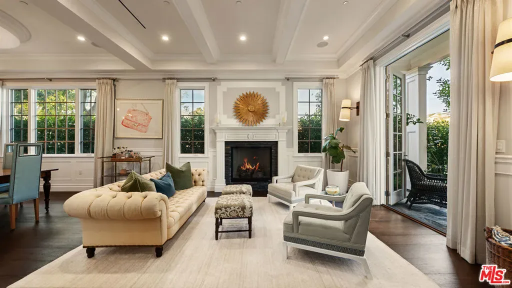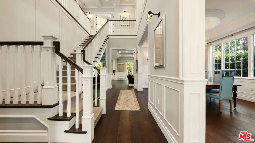 Located on one of Brentwood’s most desirable streets this custom East Coast inspired traditional residence is defined by timeless architecture and exceptional craftsmanship. Crown moldings, wainscoting, designer lighting, and meticulously selected finishes create a refined, tasteful, aesthetic throughout. Privately gated and positioned on a corner lot, the property is framed by manicured hedges, roses, and lush landscaping that enhance both privacy and curb appeal. A grand foyer welcomes you into the home, where the formal living and dining rooms sit to the right. The living room, anchored by a fireplace, opens to the private front porch and front yard through French doors, while the formal dining room features detailed moldings, designer chandelier, and a view of the expansive wine cellar beneath the staircase. At the center of the home, the kitchen and family room provide the ideal setting for everyday living and entertaining, with a fireplace, coffered ceilings, and accordion doors that open to the backyard for seamless indoor outdoor living. The chef’s kitchen features an oversized island, marble countertops, custom cabinetry, top of the line stainless steel appliances, and a breakfast nook with French doors leading outside. A powder room and a guest bedroom with en suite bathroom currently used as an office complete the main level. Upstairs, the primary suite offers a private retreat with vaulted ceilings, fireplace, walk in closet, beverage bar, private balcony, and a spa like bathroom with dual vanities, soaking tub, and oversized frameless glass shower. Three additional bedrooms and two full bathrooms complete the upper level, including two bedrooms that share a Jack and Jill bathroom. The backyard is designed for effortless entertaining with an outdoor kitchen and grill, multiple seating areas, fire feature, and a pool and spa framed by tall palms. Ideally located just moments from the Brentwood Country Mart, award winning schools, and the best shopping and dining the Westside has to offer.