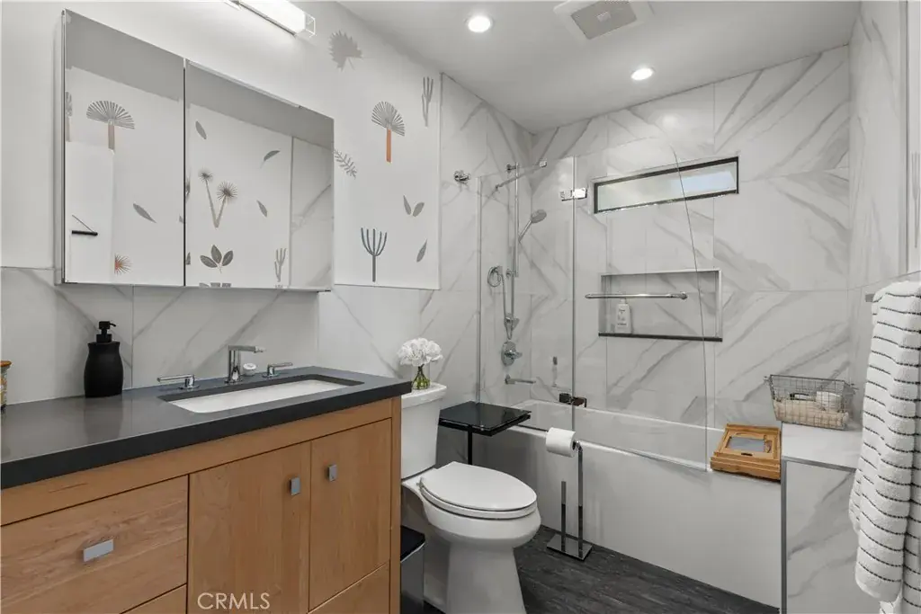 Welcome to this move-in ready architectural condo in the gated Skyline Townhome community, which was designed by noted architect Lorenzo Tedesco. Step inside to a light and airy open floor plan where floor-to-ceiling steel-framed windows and stunning floors create an atmosphere of warmth and sophistication. The seamlessly connected living and dining areas flow effortlessly into a remodeled kitchen, boasting sleek stone countertops, stainless steel appliances and ample storage space. Upstairs you’ll find two generously sized bedrooms and two tastefully updated bathrooms, including a luxurious primary suite that boasts a well-appointed ensuite bathroom. Additional highlights include in-unit laundry, two spacious balconies, a community pool/spa and two side by side parking spaces within the secured community garage. Centrally located between the Valley, Westside and Downtown LA, this property is just moments from the Hollywood Bowl, Universal Studios, Ventura Boulevard’s vibrant shopping/dining scene and so much more.