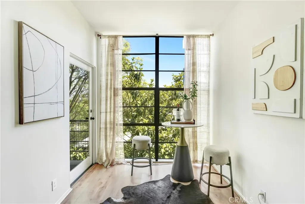 Private end-unit in a gated community, this rare Mid-Century Modern architectural condominium designed by esteemed architect Lorenzo Tedesco offers two stories of glass, nine-foot ceilings, a new central HVAC system, and sweeping views in the Hollywood Hills bordering Studio City. Spanning 1,429 sq ft, the stylish two-level home features an open floor plan with a spacious living room, fireplace, private balcony, and powder room, while the upper level includes a view-filled primary suite with a large closet and en-suite bath, a second bedroom, full bath, in-unit laundry, and an outdoor seating area. Thoughtfully designed with functional, timeless elements throughout, the unit also includes two assigned side-by-side parking spaces in the community garage and is ideally located near Universal Studios, dining, entertainment, and major freeways for easy access to the studios, the Valley, and all of Los Angeles. HOA dues include earthquake and fire insurance, reserves, pool, water, hot water, sewer, trash, landscaping, termite clearance, and more, making this a rare opportunity to own a true piece of Los Angeles Mid-Century Modern architecture at an exceptional value.
