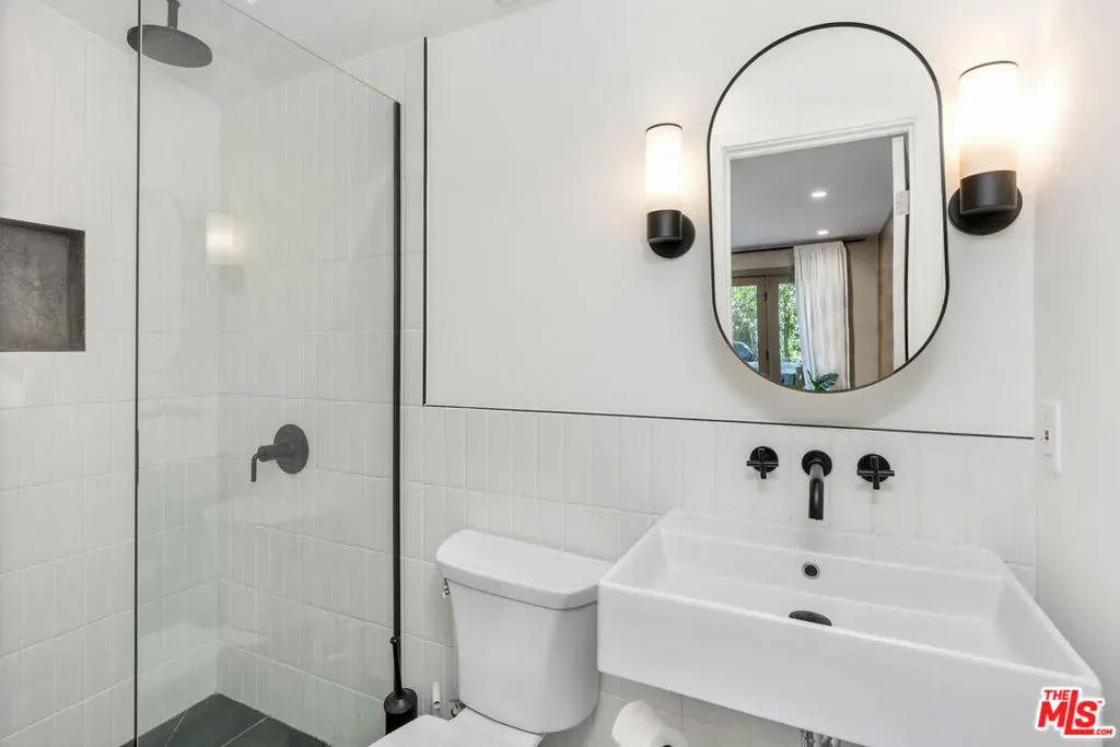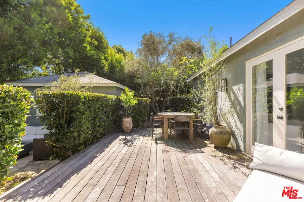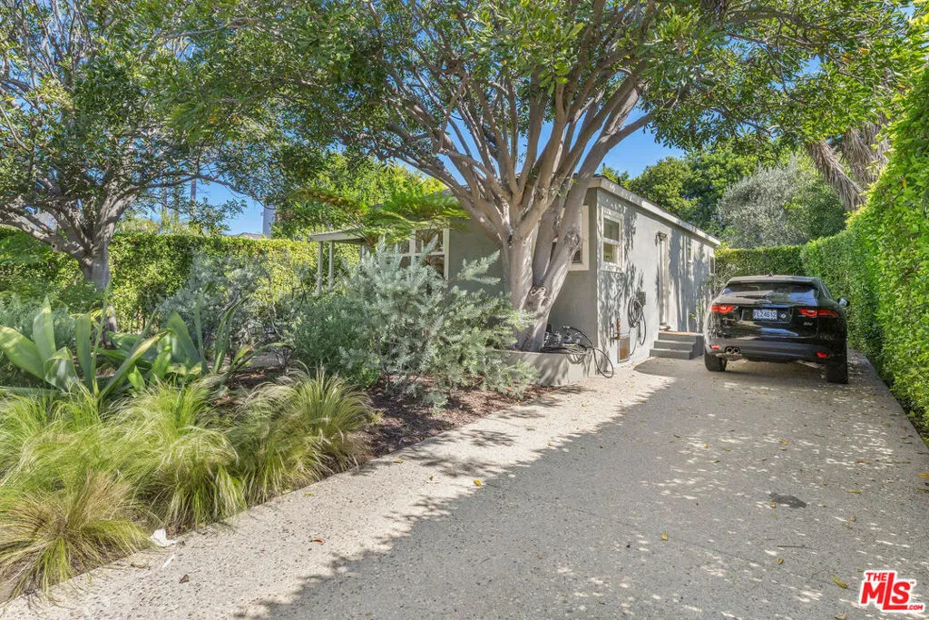Tucked behind lush hedging and gates for ultimate privacy, this beautifully updated 2-bedroom, 2-bath bungalow blends timeless 1940s charm with modern comforts in the heart of Mar Vista. A welcoming front yard sets the tone as you enter into a bright, open floor plan featuring hardwood floors, a renovated chef’s kitchen, and a built-in dining banquette, ideal for both everyday living and entertaining. The primary suite is privately situated at the rear of the home, opening through French doors to a sunny patio and grassy yard complete with a firepit and above-ground spa. A spacious secondary bedroom and bath complete the main residence. Convenient in-home laundry adds to the ease of everyday living. The outdoor spaces are equally inviting, with a large outdoor dining area under a mature olive tree, surrounded by citrus and fig trees, perfect for enjoying Southern California living year-round. A long, private driveway provides ample off-street parking with space for multiple vehicles. Adding exceptional flexibility, the detached converted garage has been thoughtfully renovated into a guest studio with its own kitchenette and bathroom, ideal for a home office, creative space, gym, or guests. A rare lease opportunity offering privacy, character, and versatile living in a prime Mar Vista location.