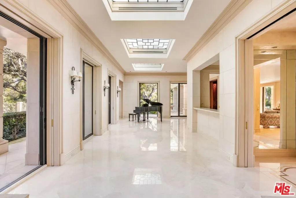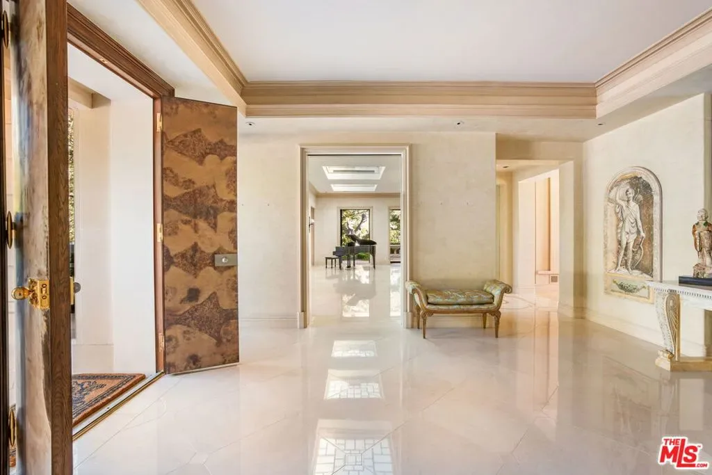 The Carson Estate. Formerly the cherished sanctuary of Johnny and Joanna Carson, this legendary residence is situated on approximately 1.5 acres of verdant grounds in the heart of ultra-prime East Gate Bel Air. Secured by private gates and a dedicated security booth, an expansive motor court provides an impressive sense of arrival, complemented by two spacious garages. Classic and elegant, the home exudes timeless sophistication defined by magnificent scale, high ceilings, and bespoke details and craftsmanship. An airy foyer transitions into a magnificent great room with a wet bar, while the formal dining area and generous family room capture serene vistas of the lush surroundings. Pocket doors disappear throughout the home to facilitate a quintessential California lifestyle, anchored by a stately loggia with classical pillars that traces the rear of the residence. The gourmet kitchen is outfitted with a central island and cozy breakfast nook, while a distinguished den replete with character features rich wood paneling and custom built-ins. Entered via a striking rotunda, the palatial primary retreat is a haven of luxury, boasting dual bathrooms and walk-in closets, while a detached two-story guest house provides additional versatility with a home office and a lower-level ideal for a fitness studio. Also featured at the property is a sizable basement area providing ample storage and a wine cellar. The exterior is a meticulously curated resort-style oasis, where manicured lawns and a tiered fountain lead to a signature oval swimming pool, a sprawling sun deck, and an elegant cabana. This legendary estate is completed by a championship lighted tennis court, uniquely supported by its own pavilion with a covered seating area, kitchenette, and dedicated powder room. A truly iconic luxury property ensconced within a private, park-like environment in one of the world’s most coveted locations.